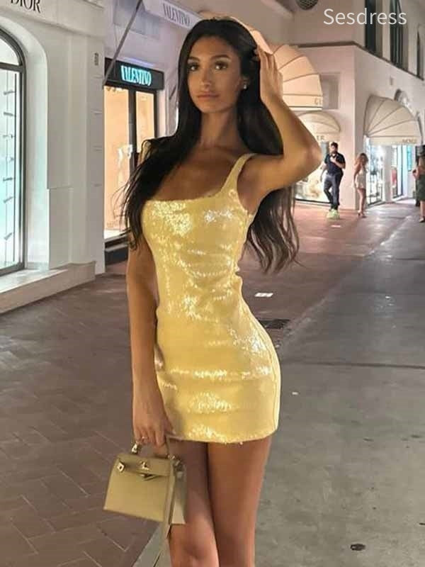 Sparkly Yellow Square Strap Bodycon Short Mini Dress Homecoming Dress$139.99 USD$169.99 USD