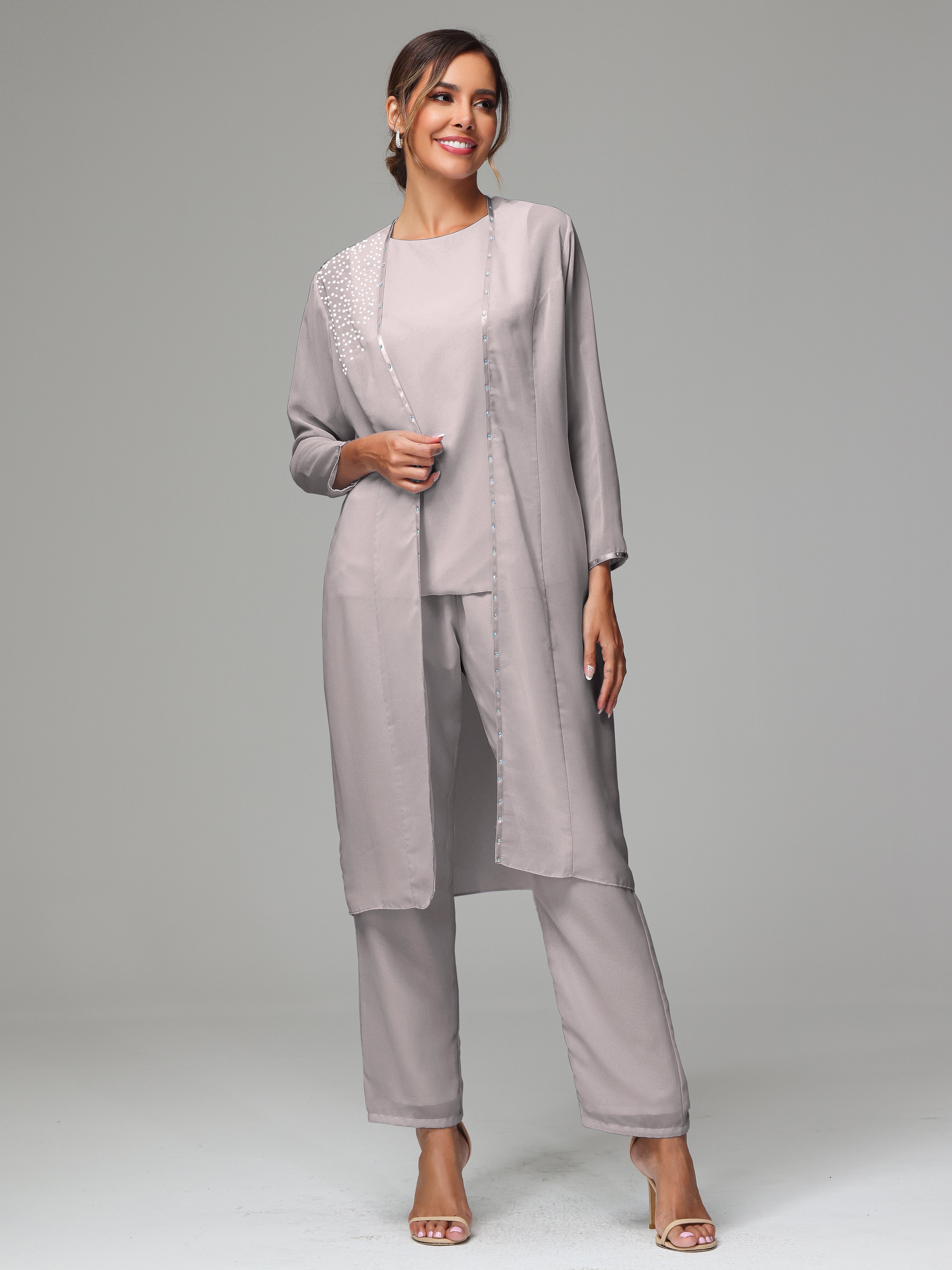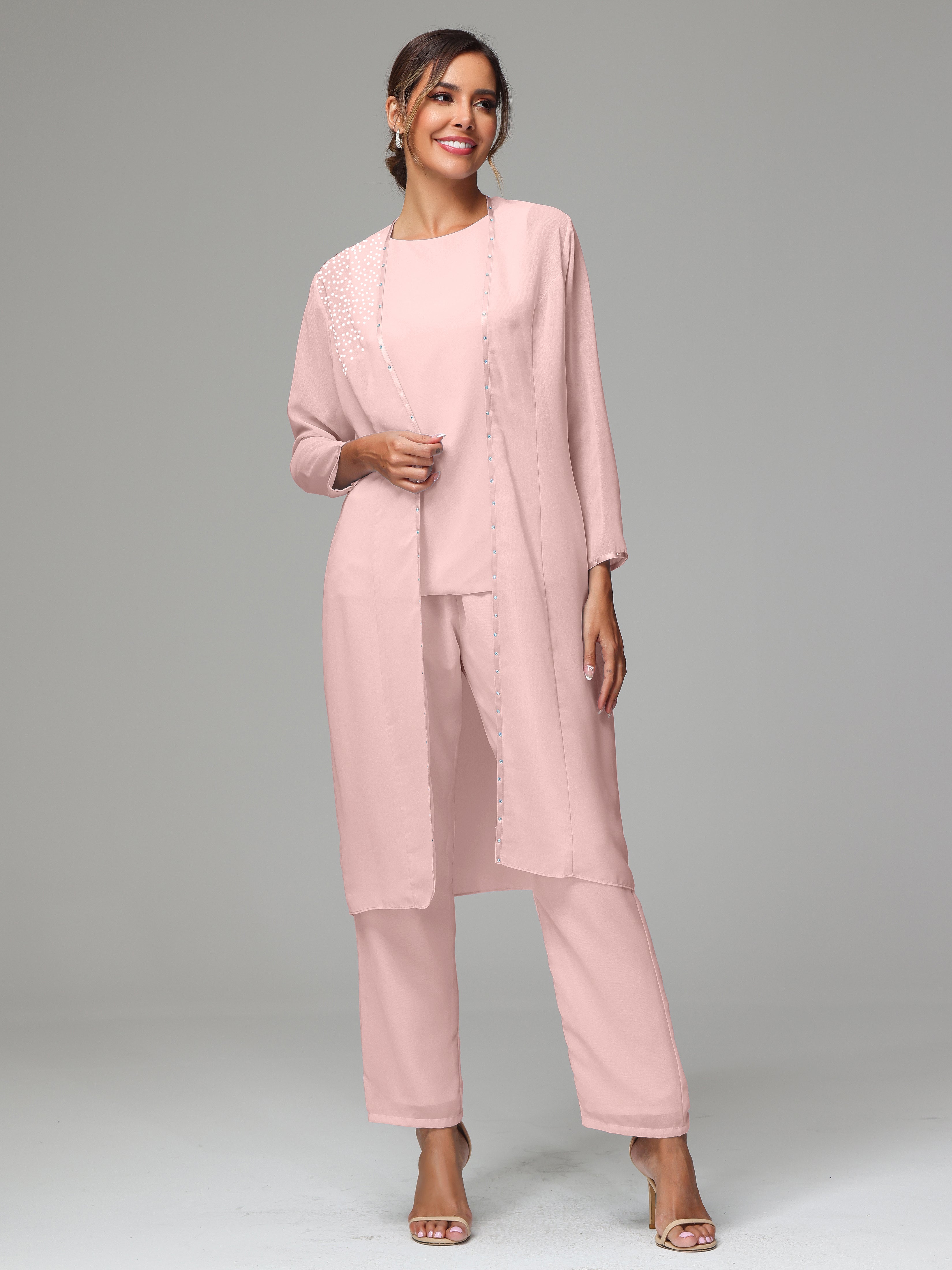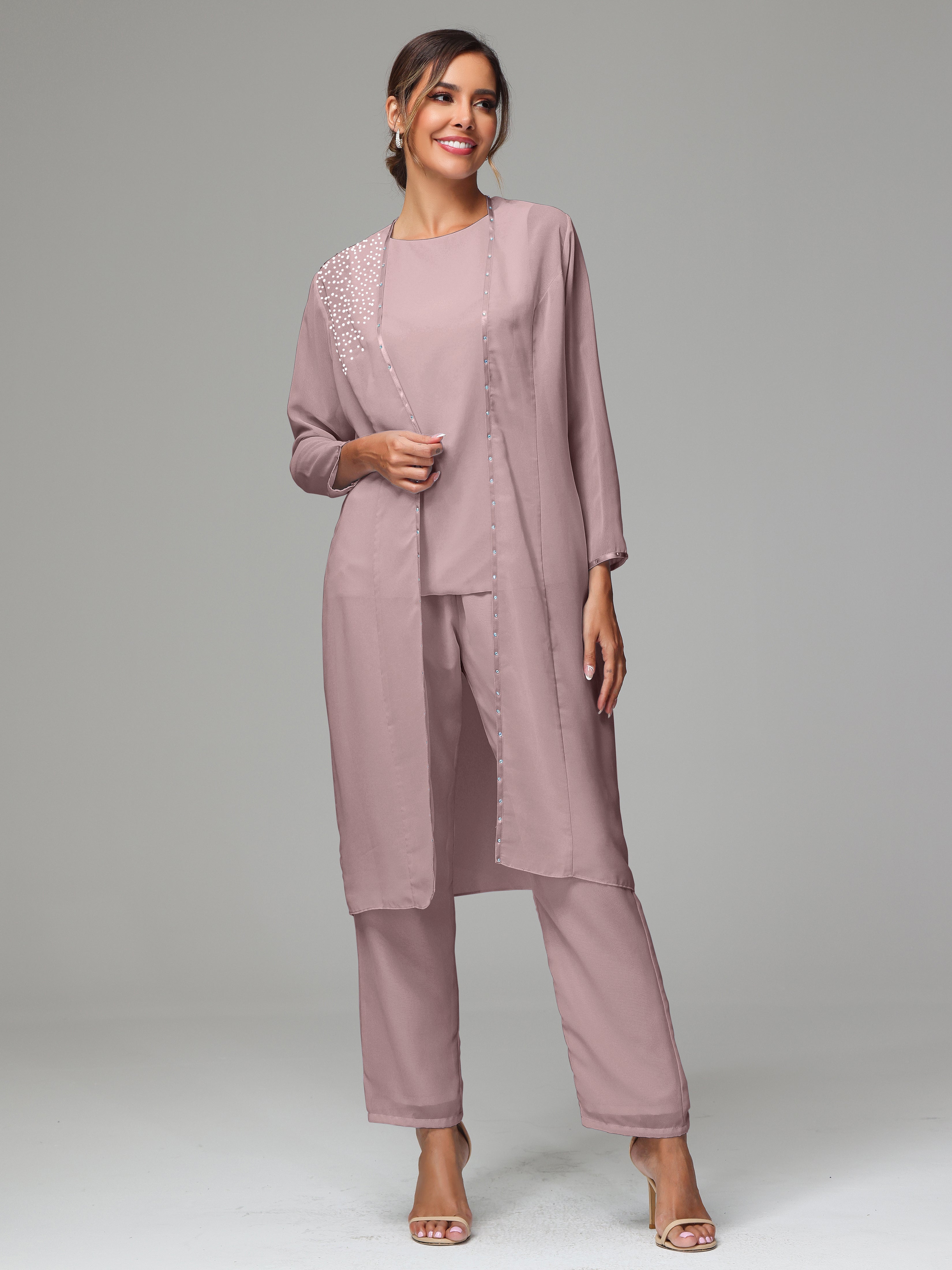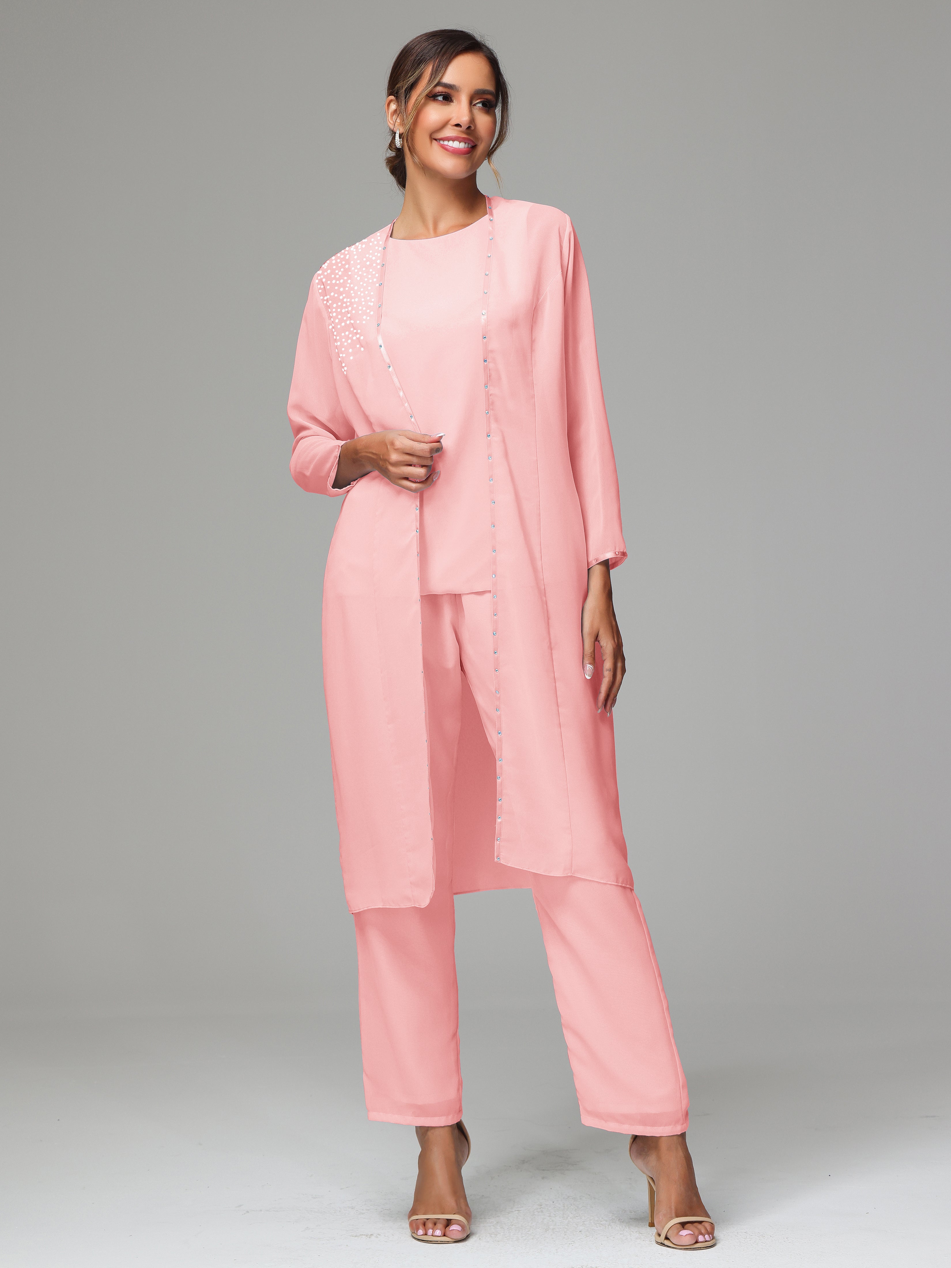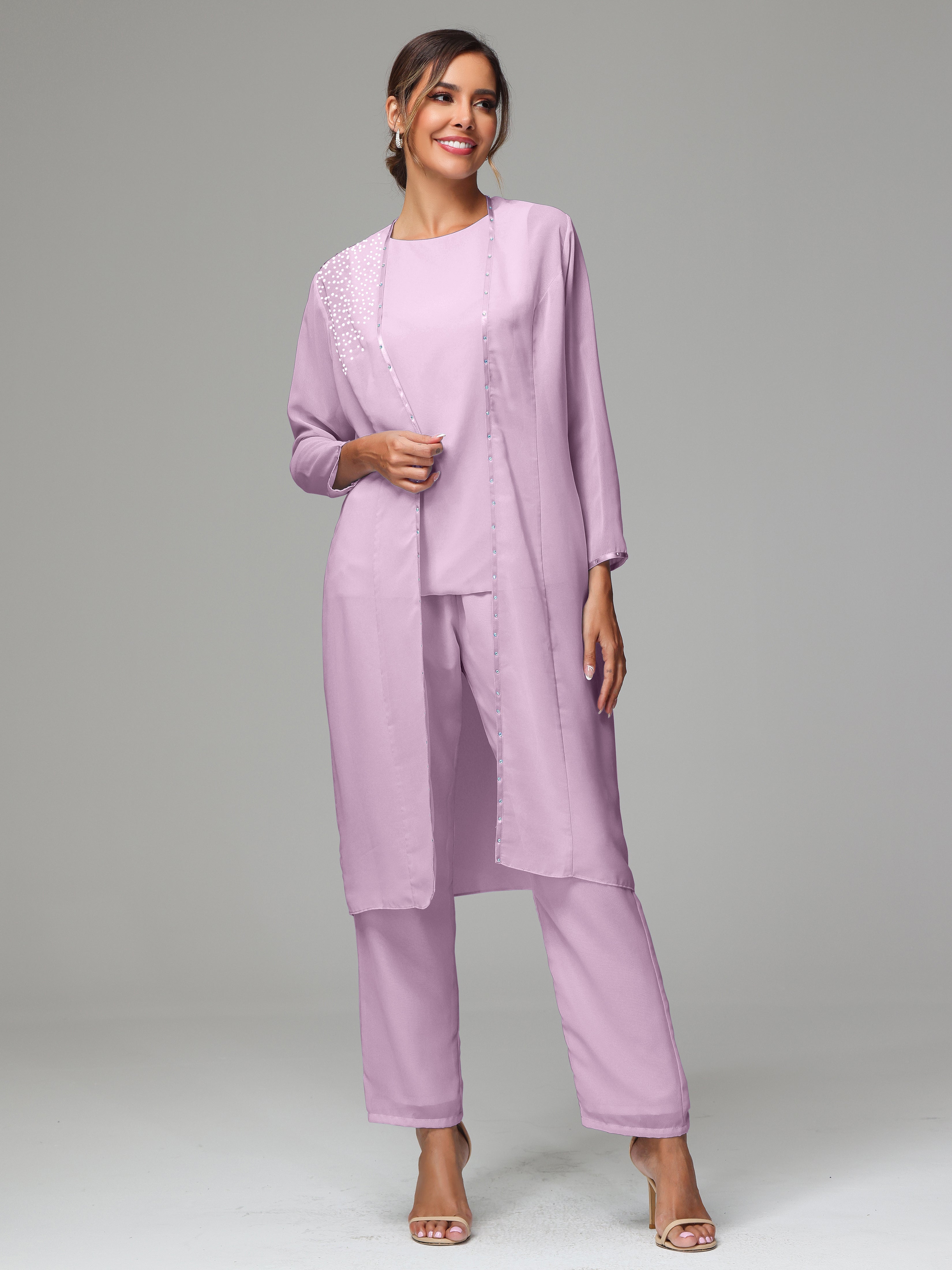 The 3 Pieces Chiffon Fancy Mother Of The Bride Dress Pants Suits is a fashionable yet timeless look for special occasions. It is made from high quality chiffon and features three pieces in the set, with elegant details like a single-breasted jacket, dress, and pants. Perfect for a chic and sophisticated look!