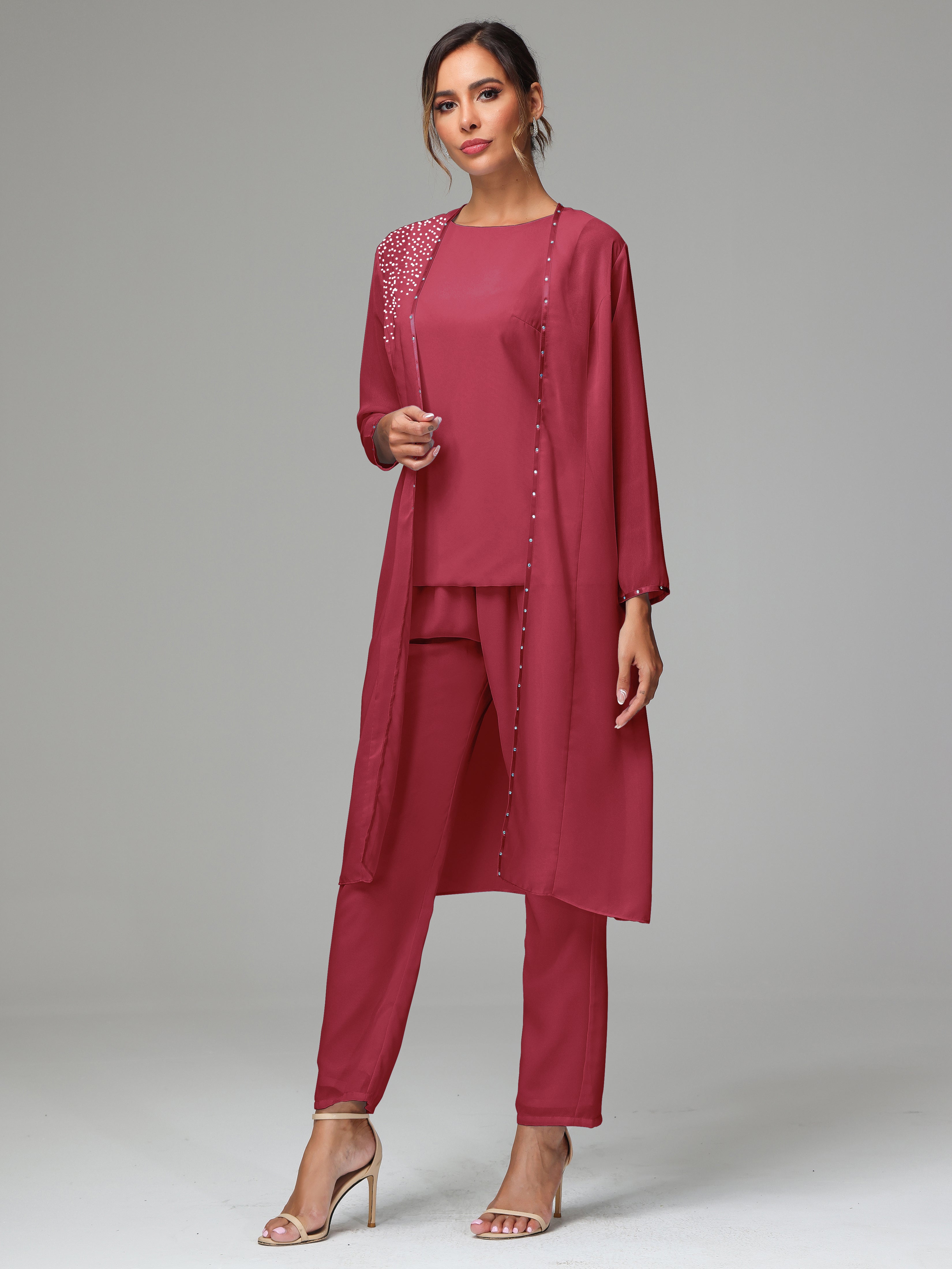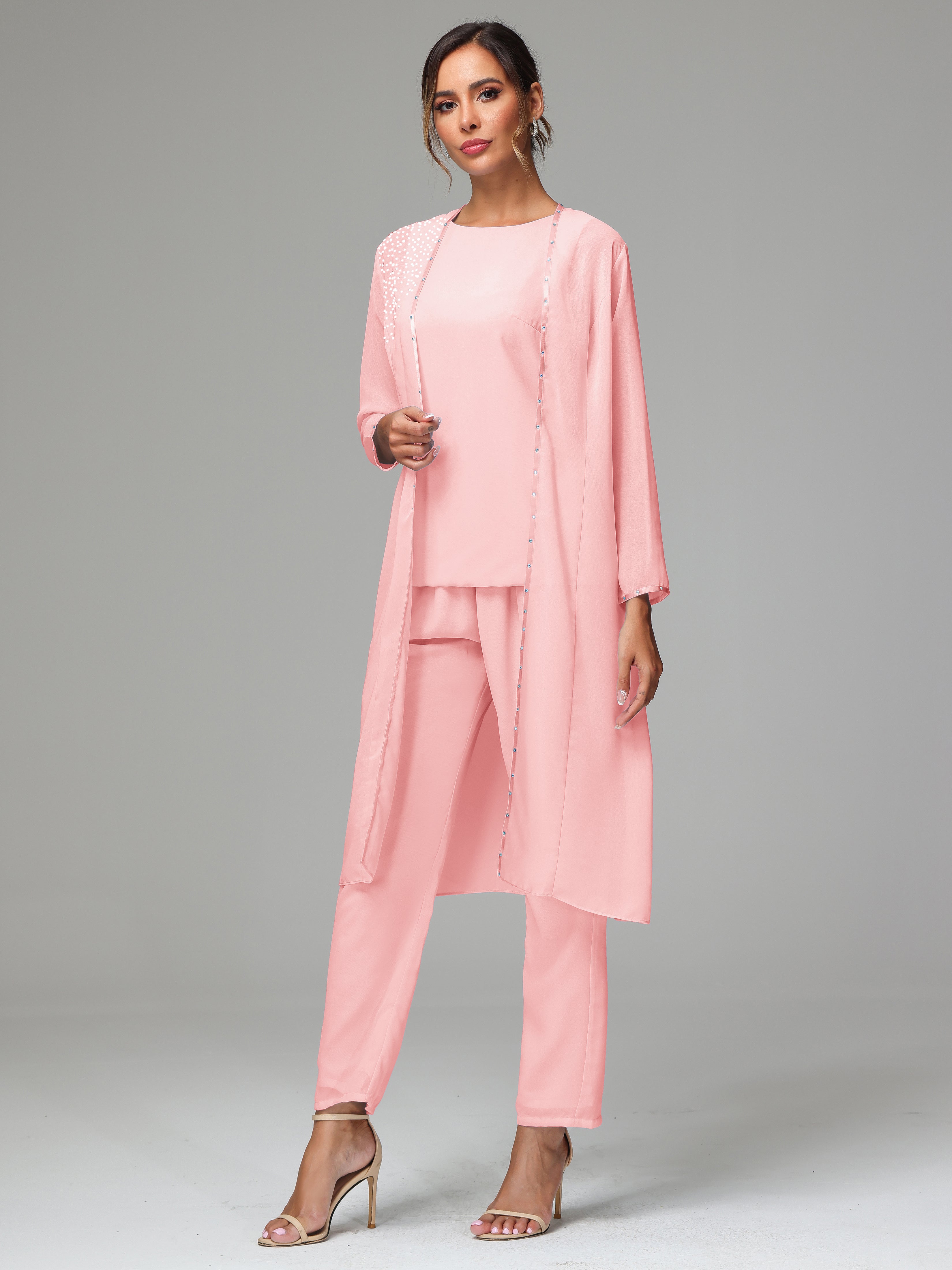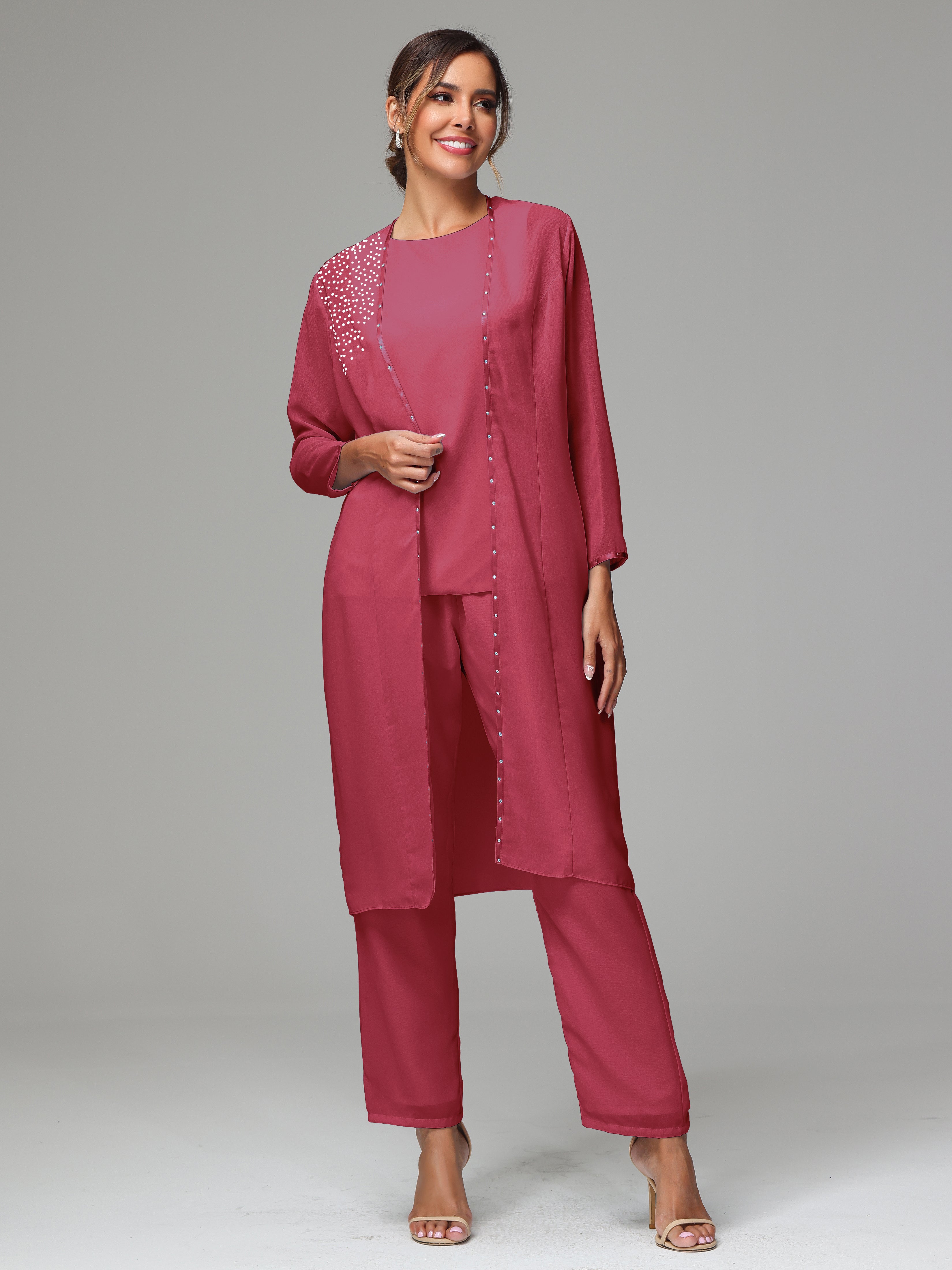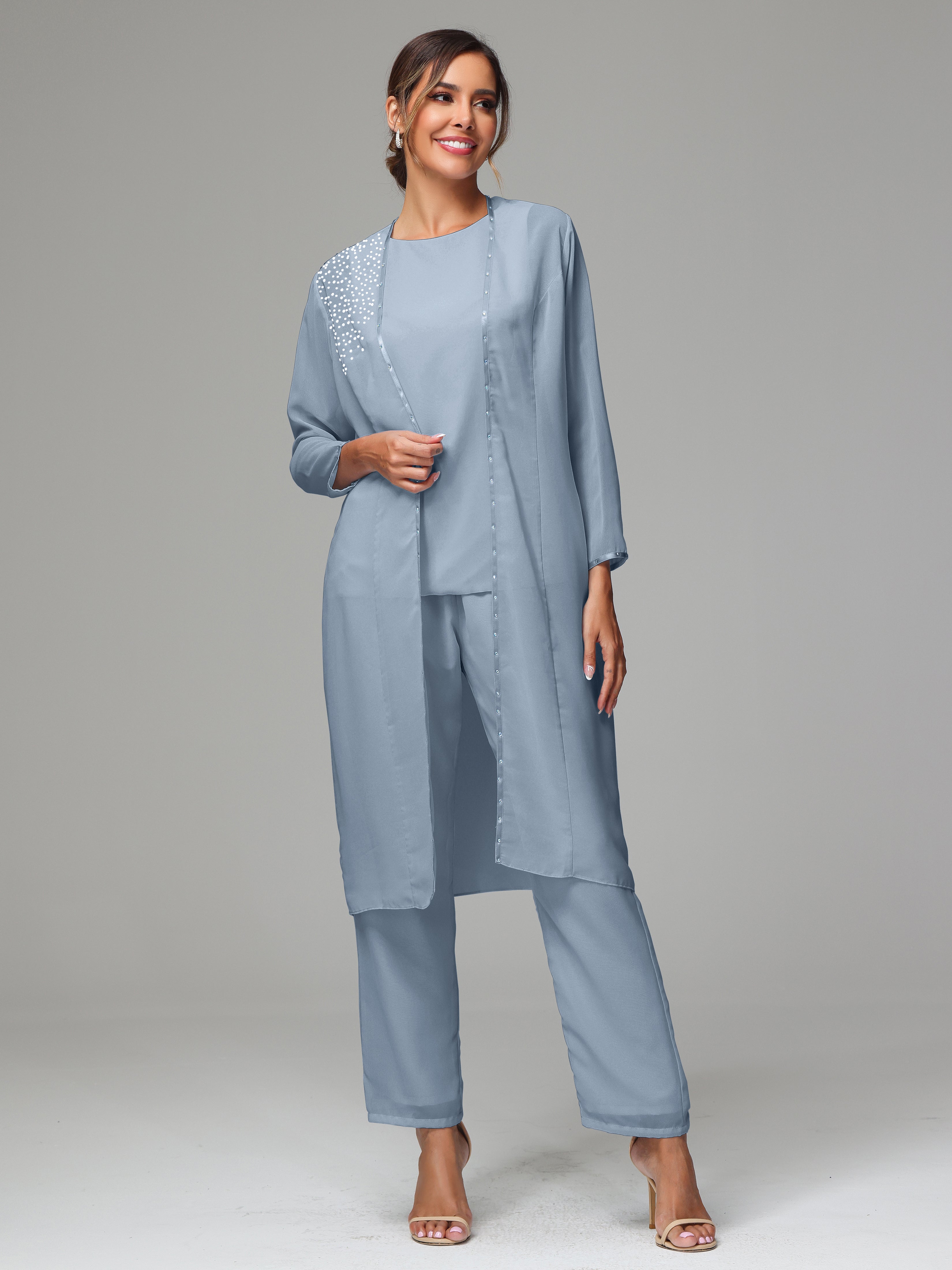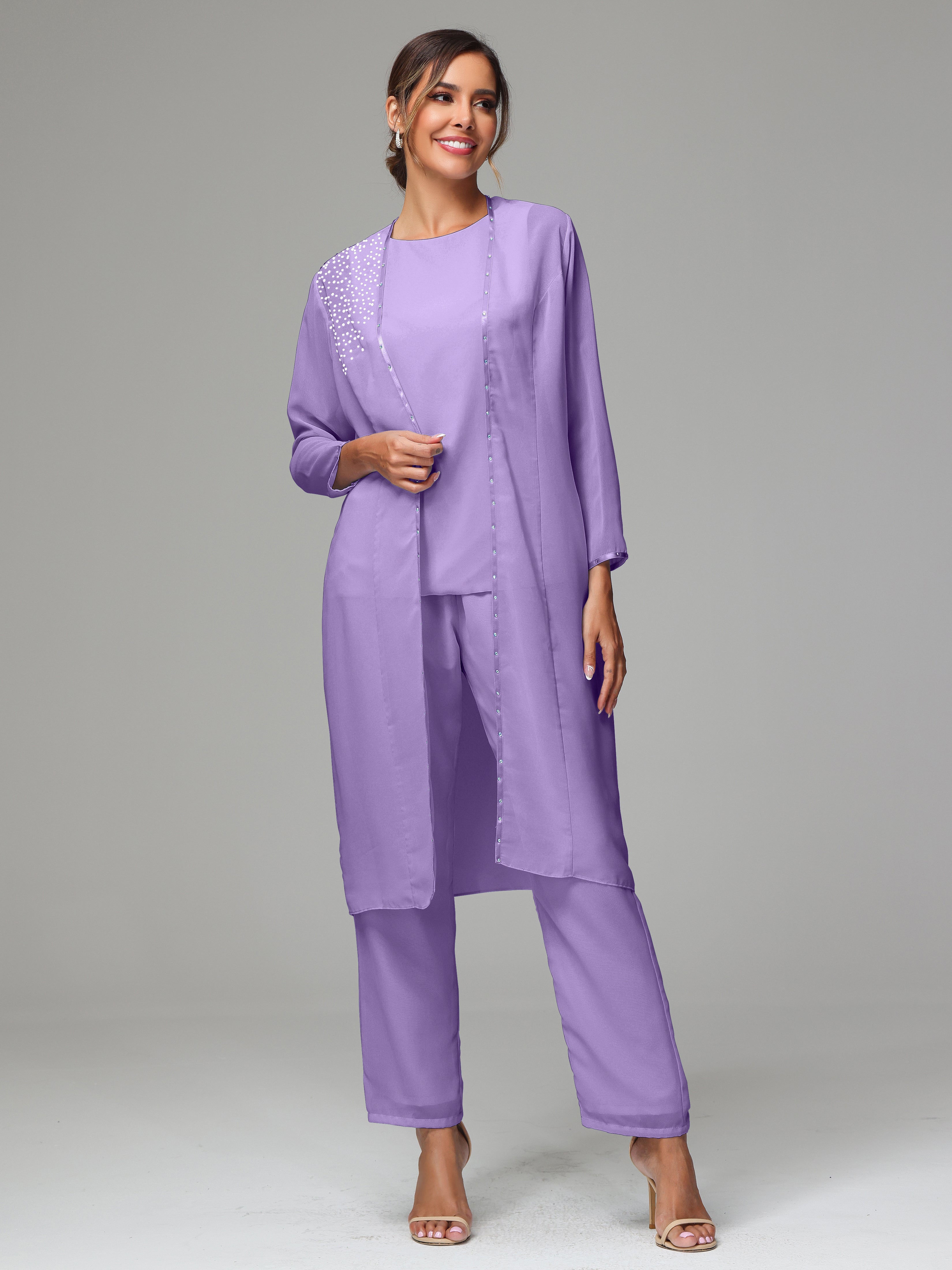 The 3 Pieces Chiffon Fancy Mother Of The Bride Dress Pants Suits is a fashionable yet timeless look for special occasions. It is made from high quality chiffon and features three pieces in the set, with elegant details like a single-breasted jacket, dress, and pants. Perfect for a chic and sophisticated look!