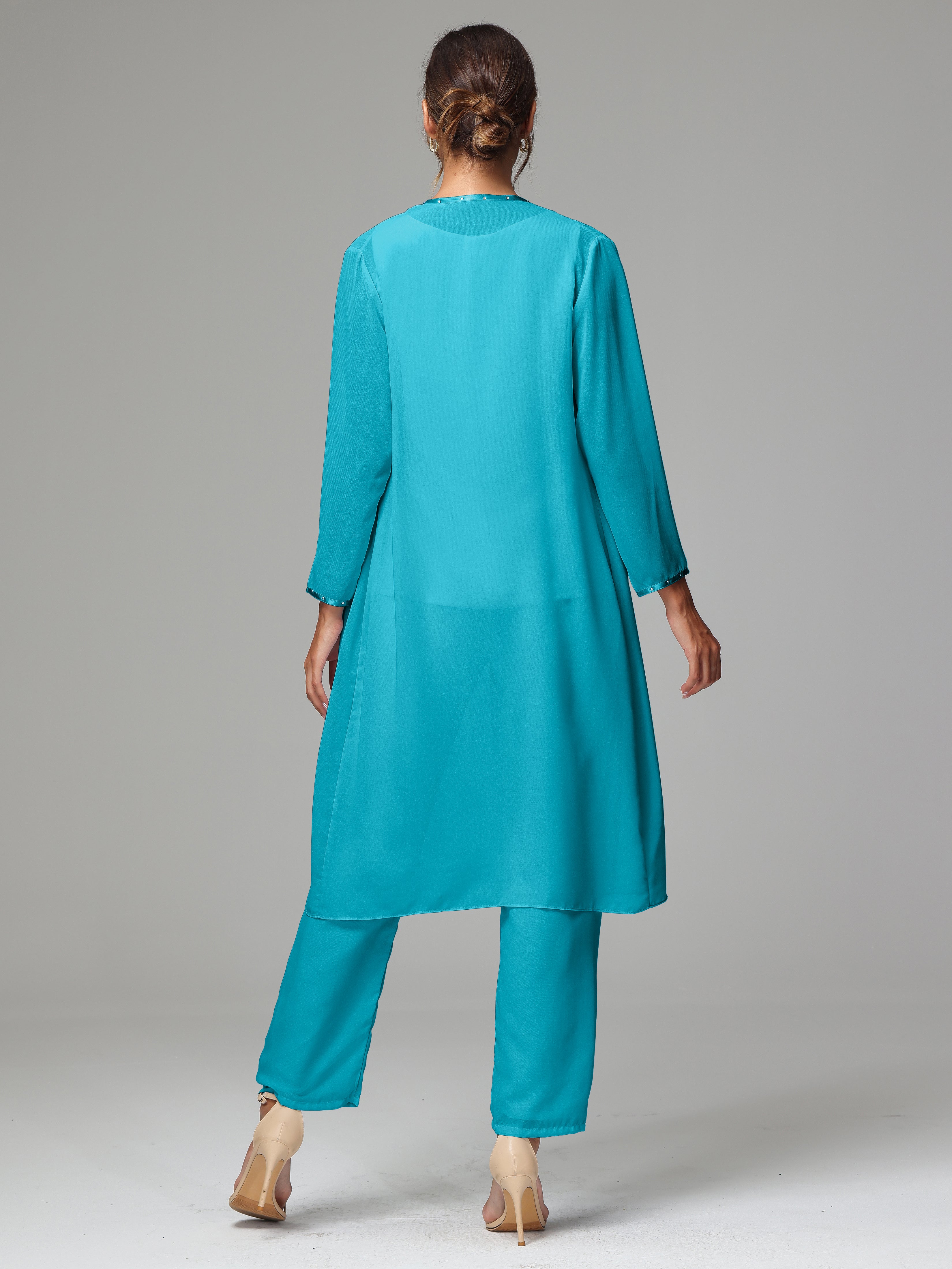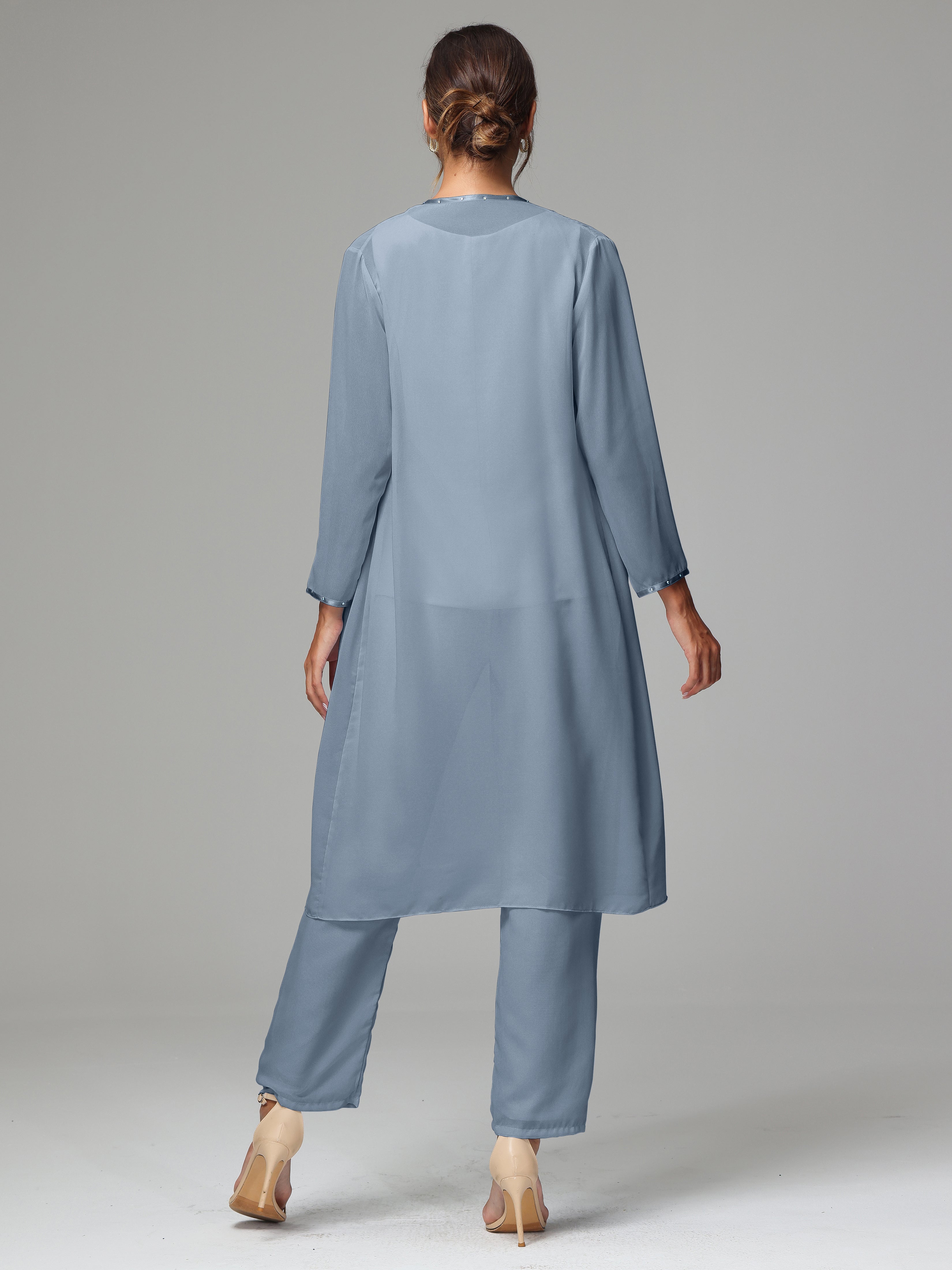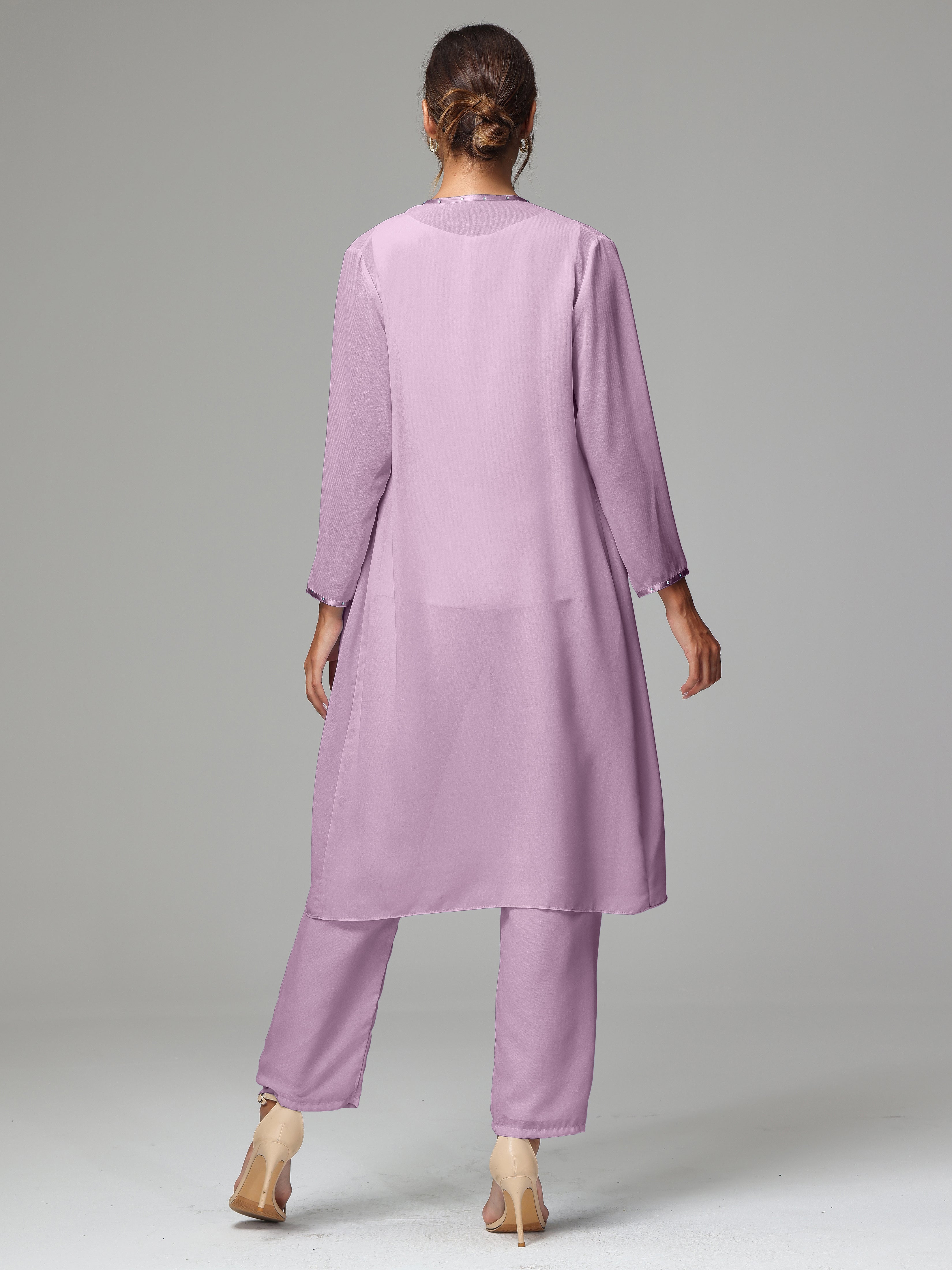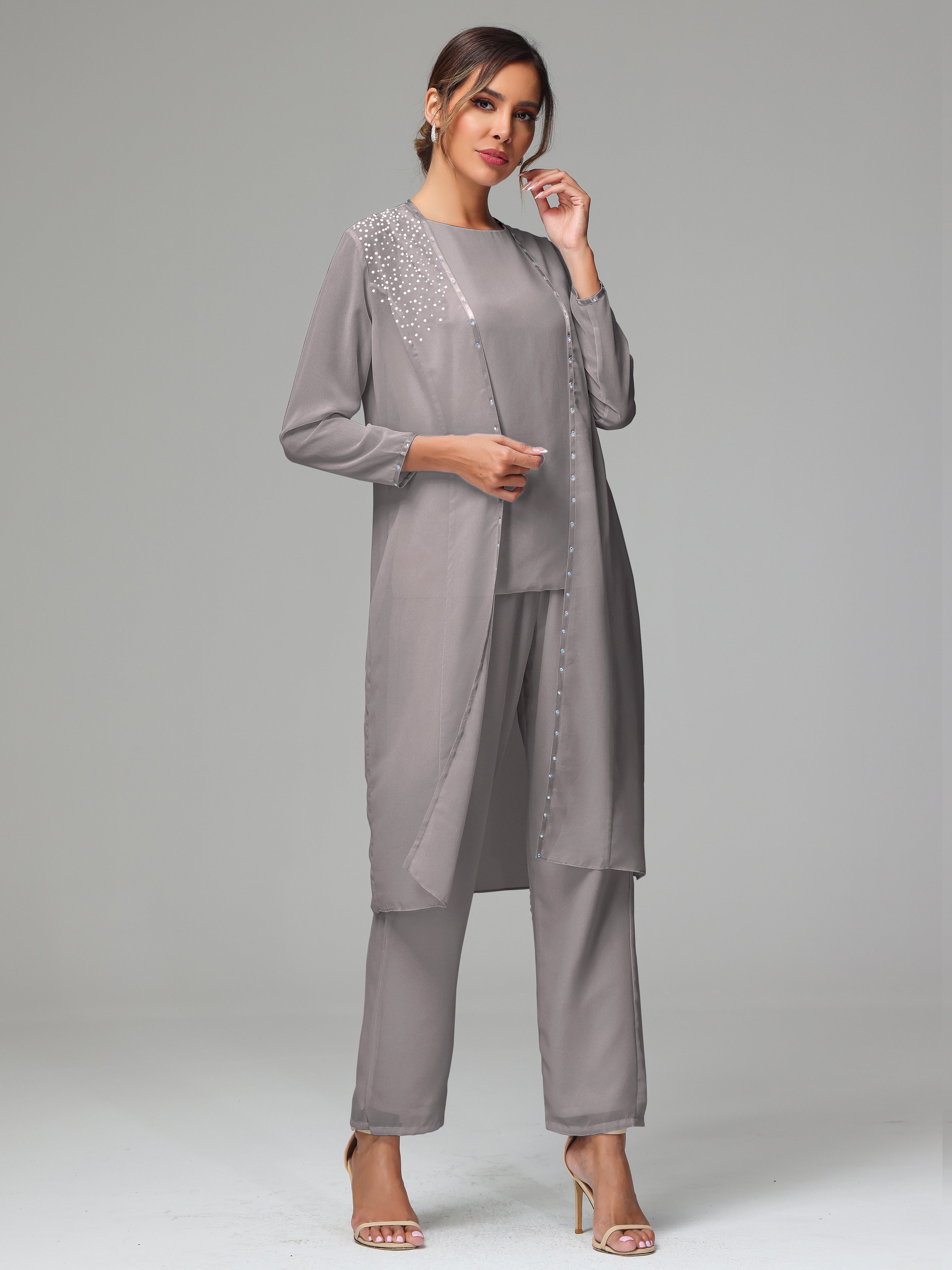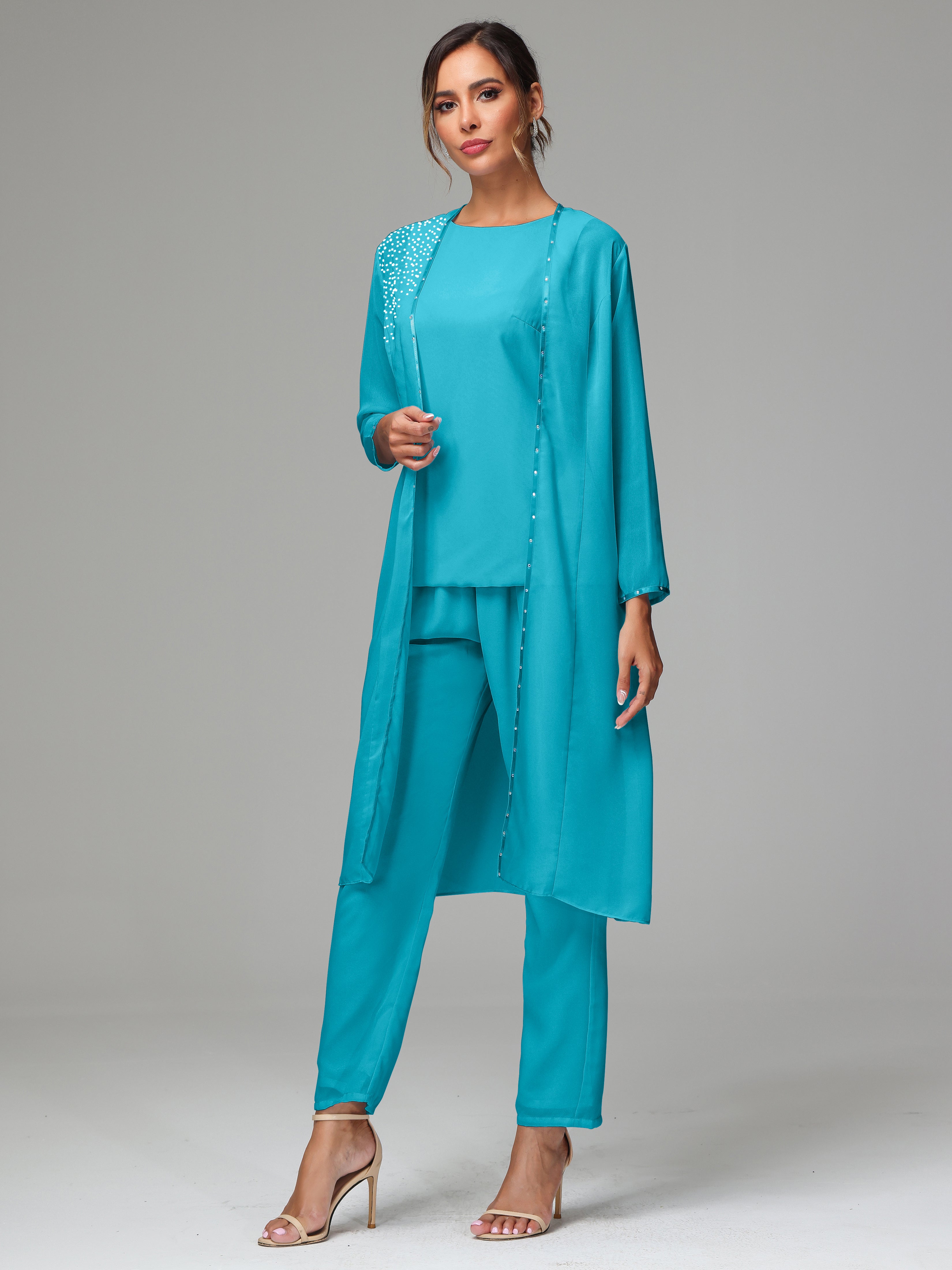 The 3 Pieces Chiffon Fancy Mother Of The Bride Dress Pants Suits is a fashionable yet timeless look for special occasions. It is made from high quality chiffon and features three pieces in the set, with elegant details like a single-breasted jacket, dress, and pants. Perfect for a chic and sophisticated look!