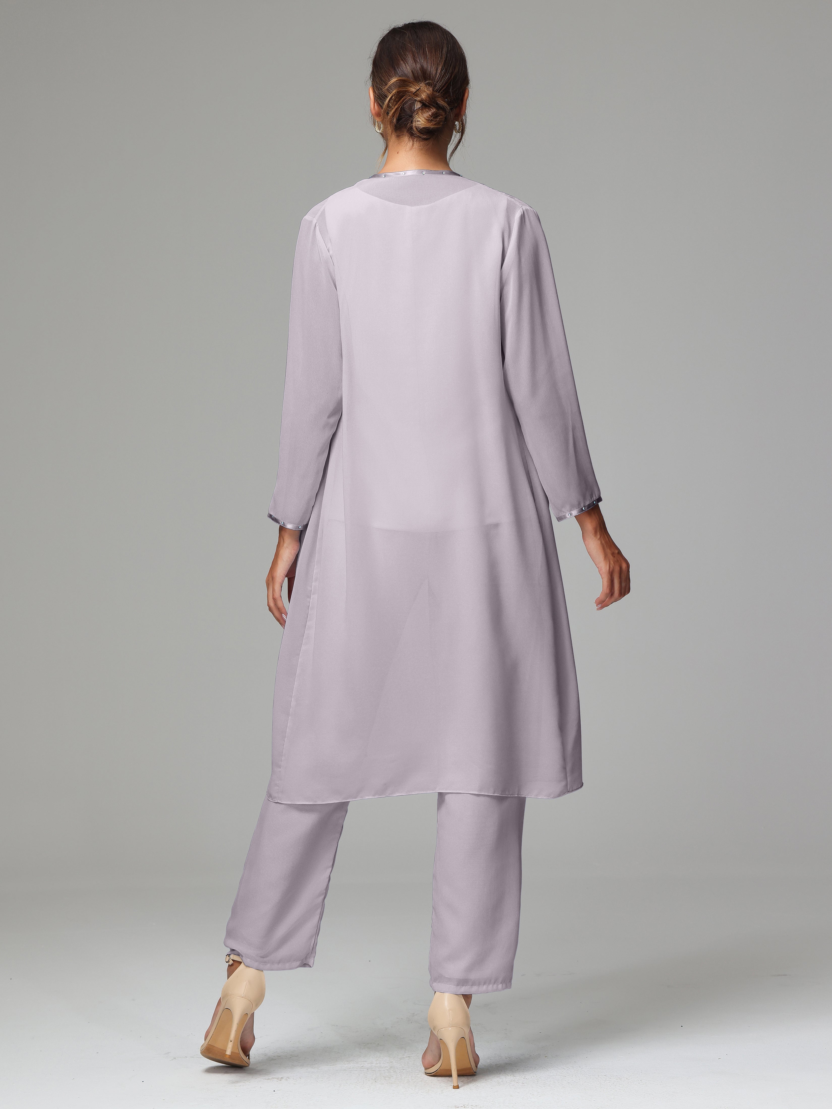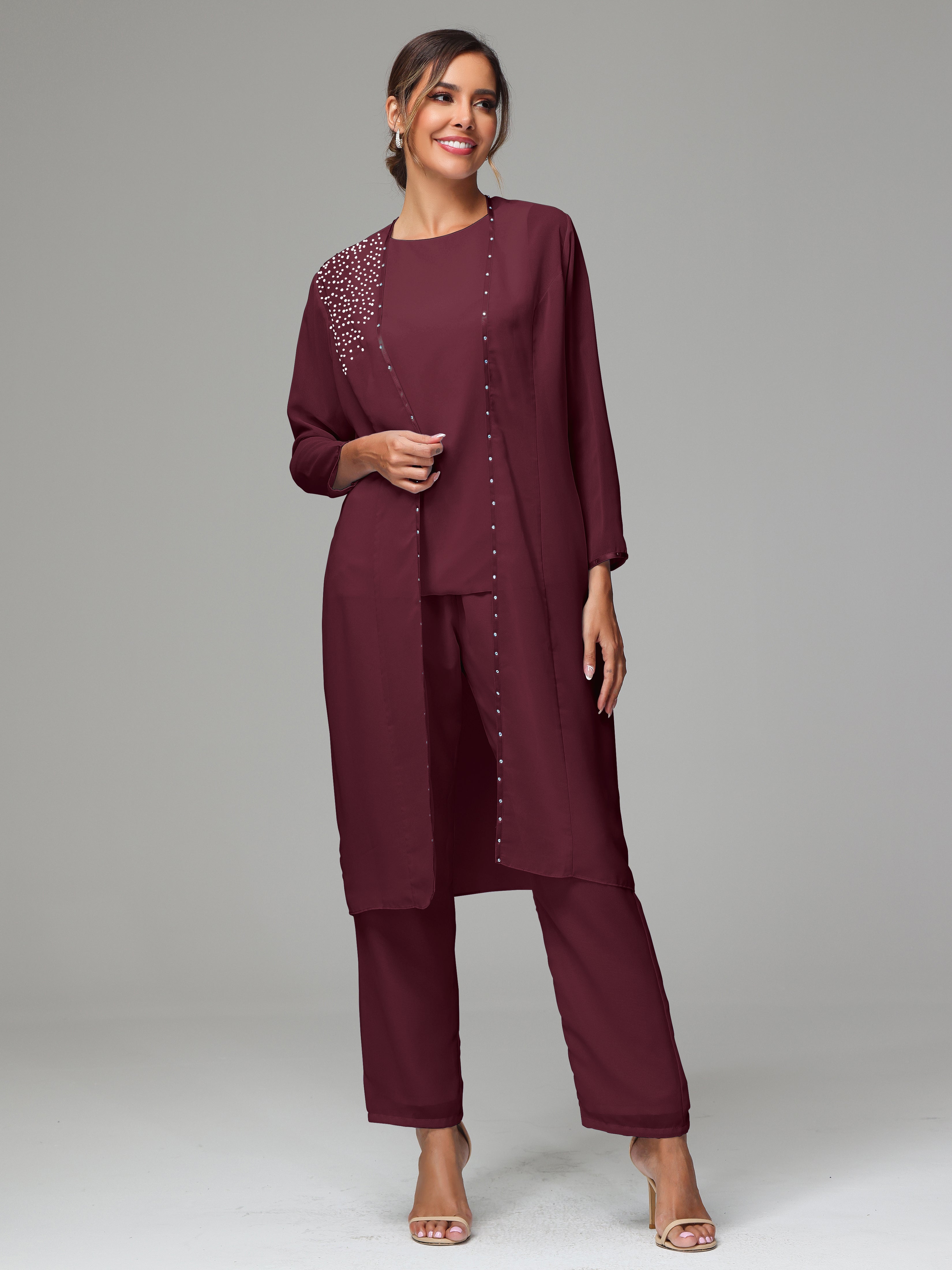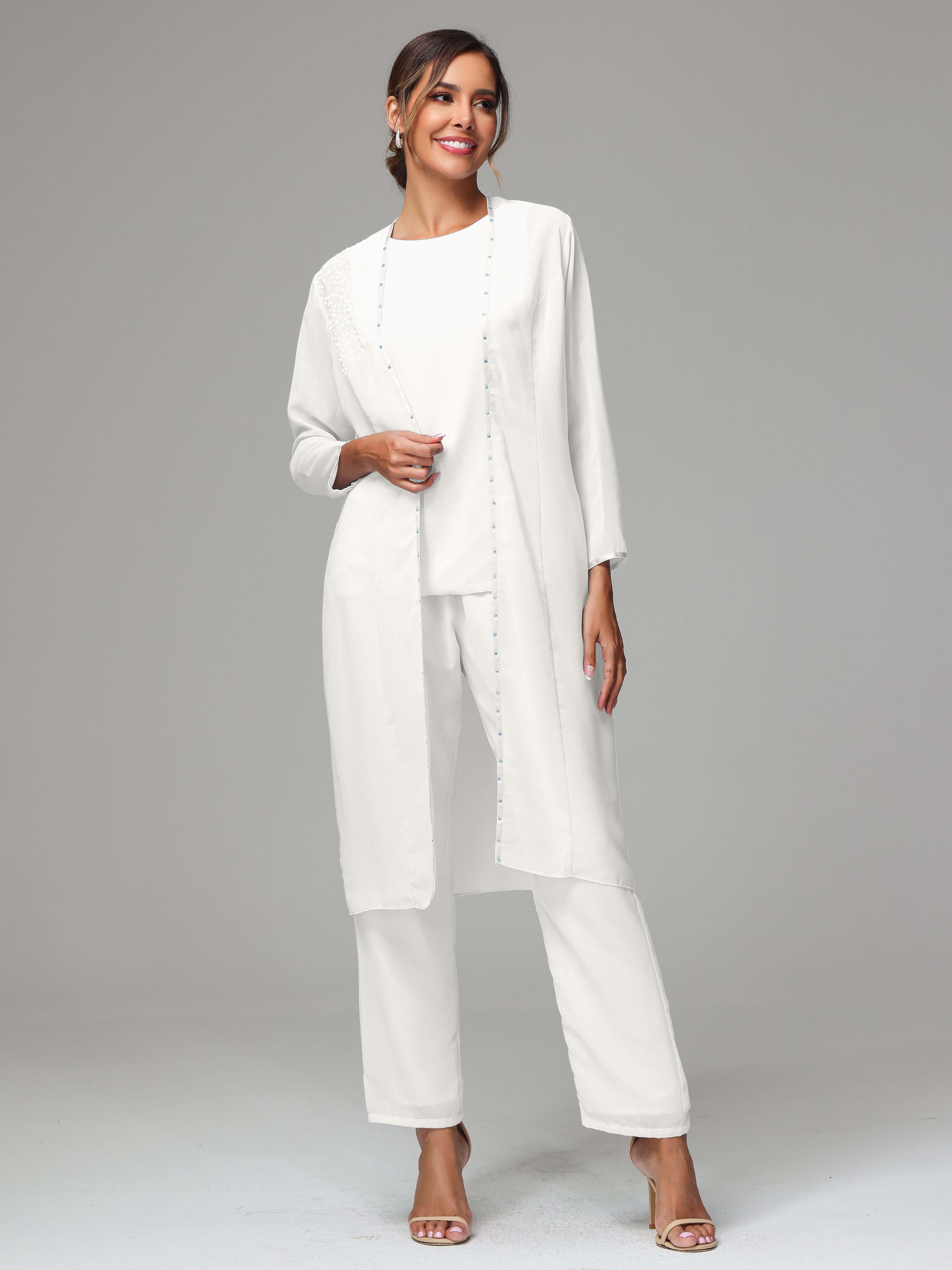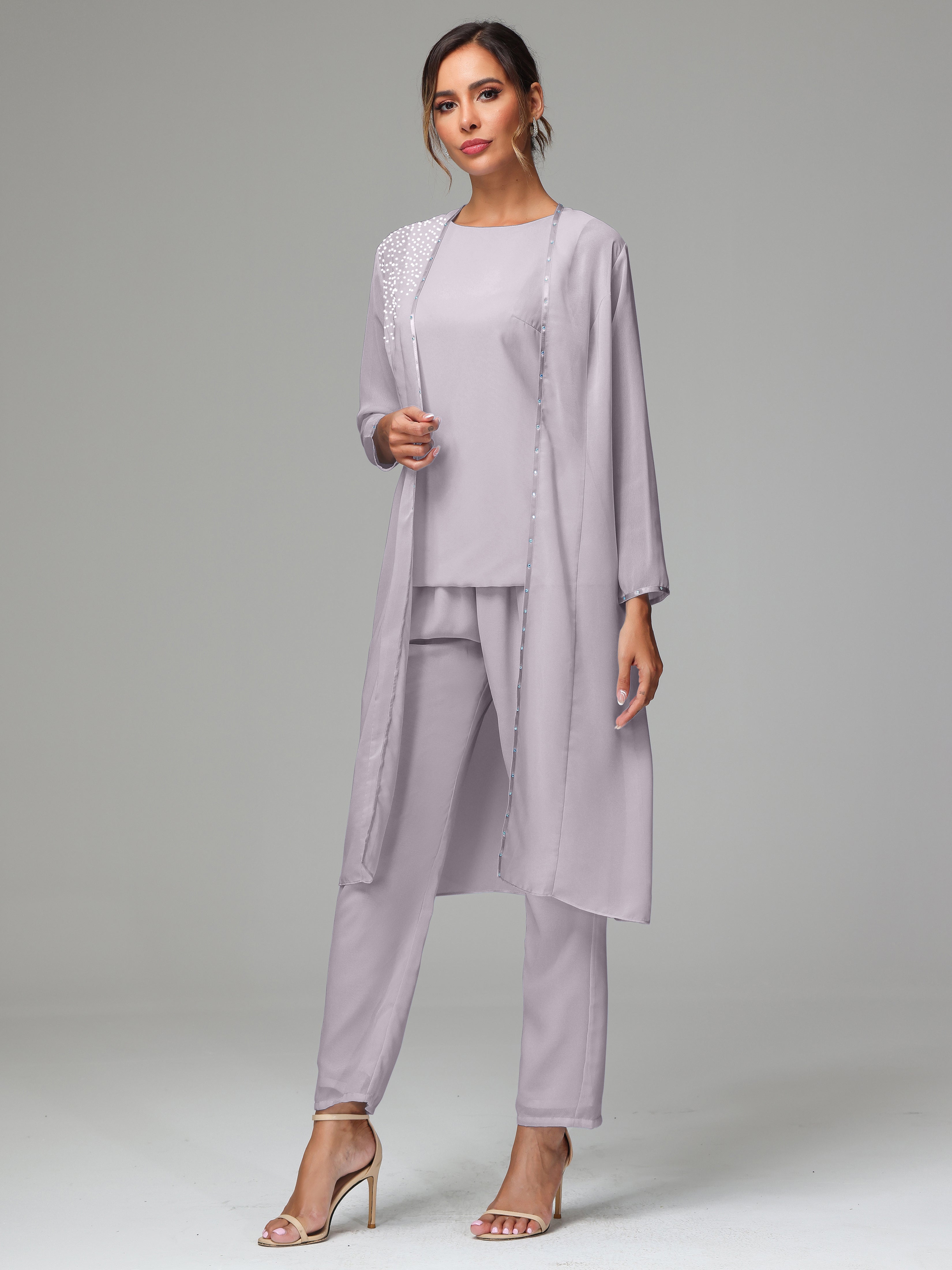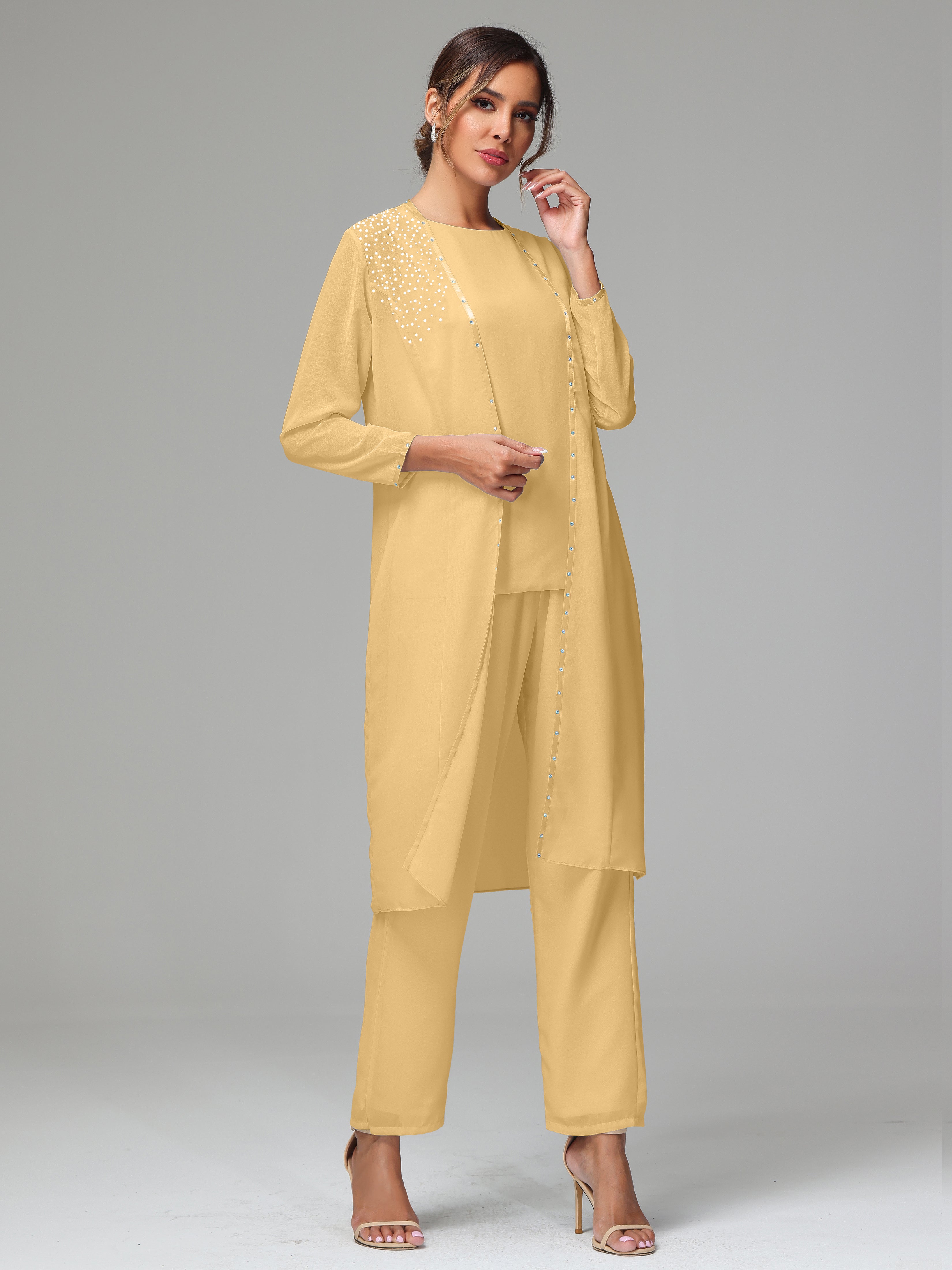 The 3 Pieces Chiffon Fancy Mother Of The Bride Dress Pants Suits is a fashionable yet timeless look for special occasions. It is made from high quality chiffon and features three pieces in the set, with elegant details like a single-breasted jacket, dress, and pants. Perfect for a chic and sophisticated look!