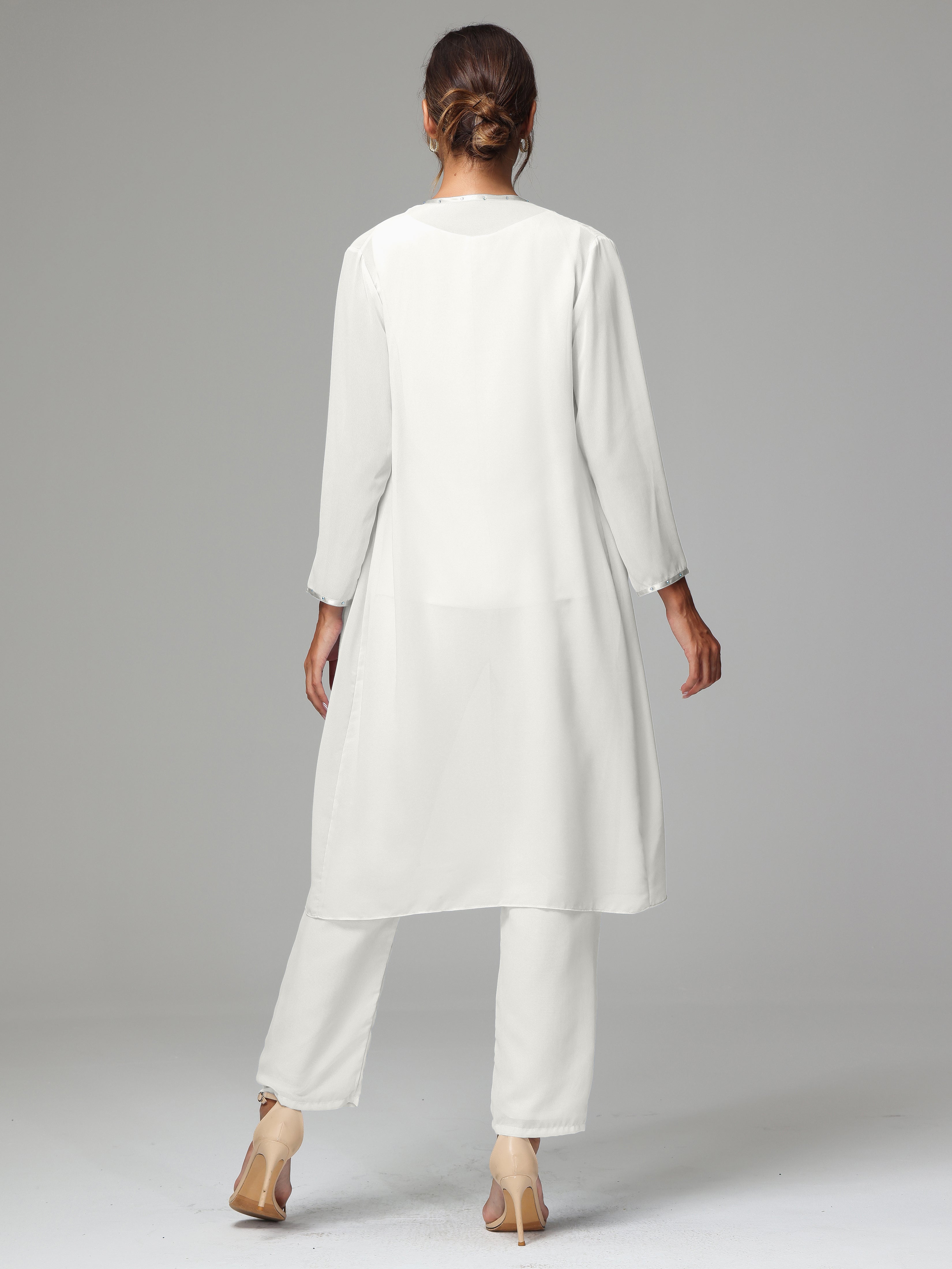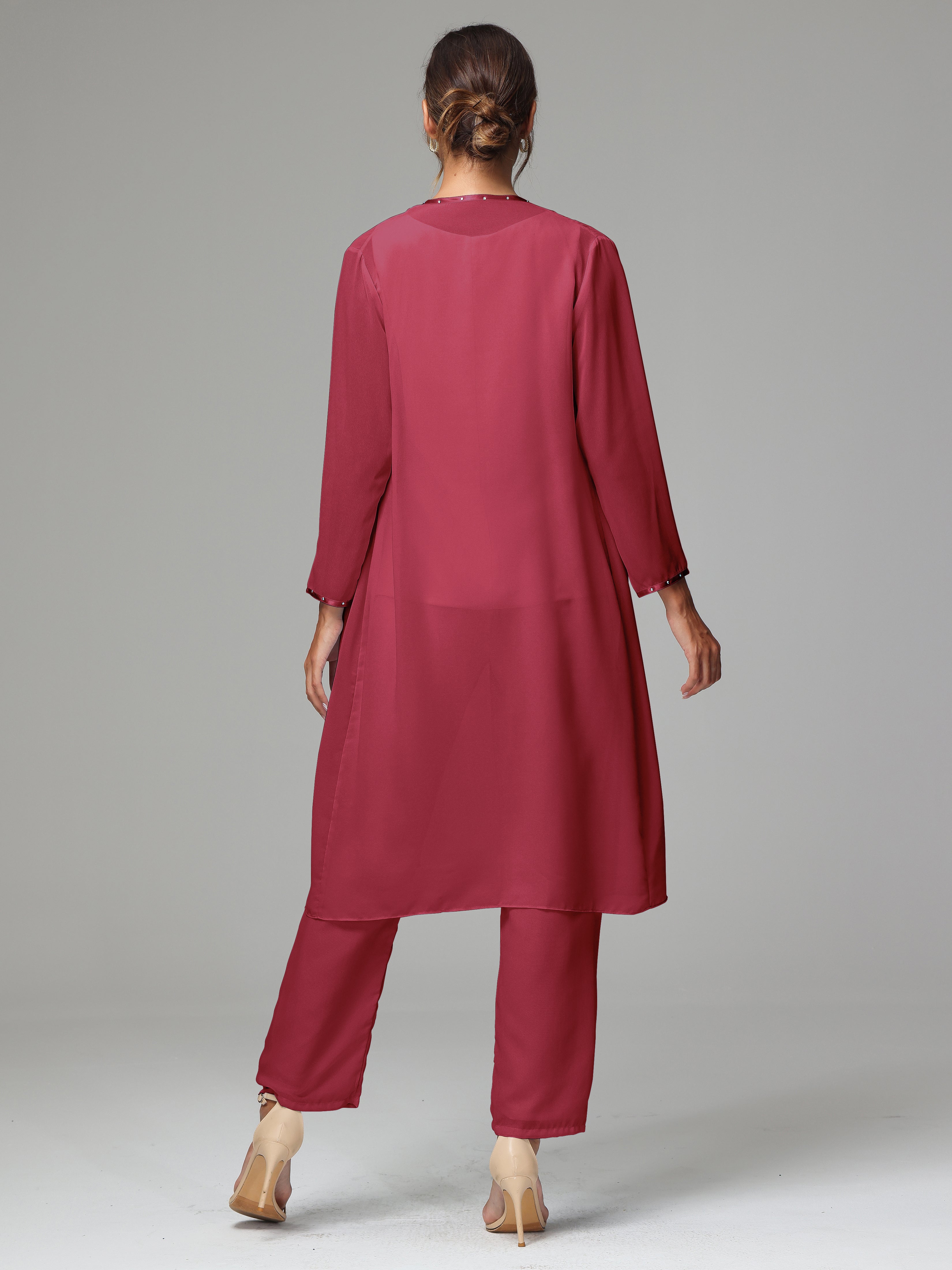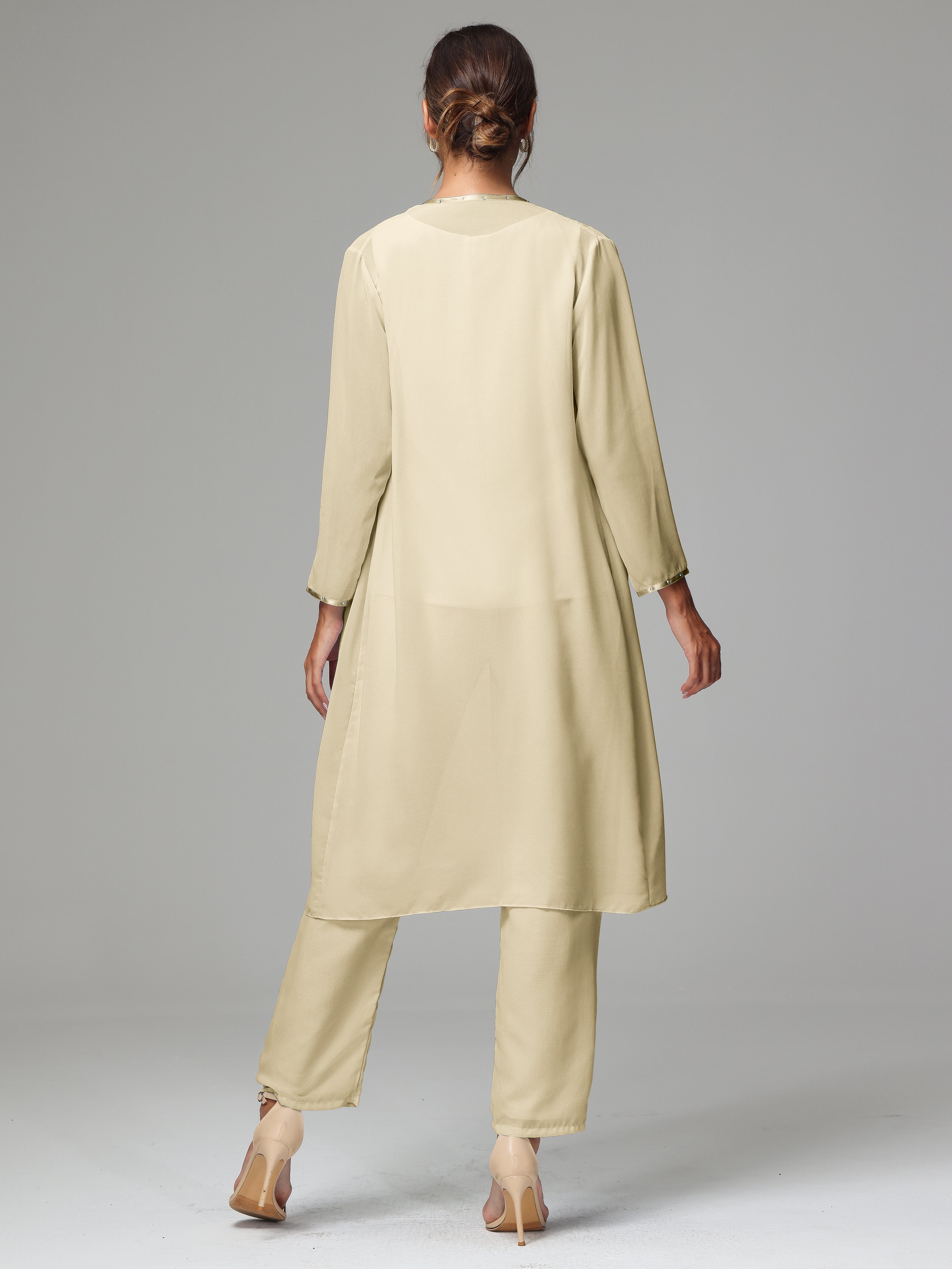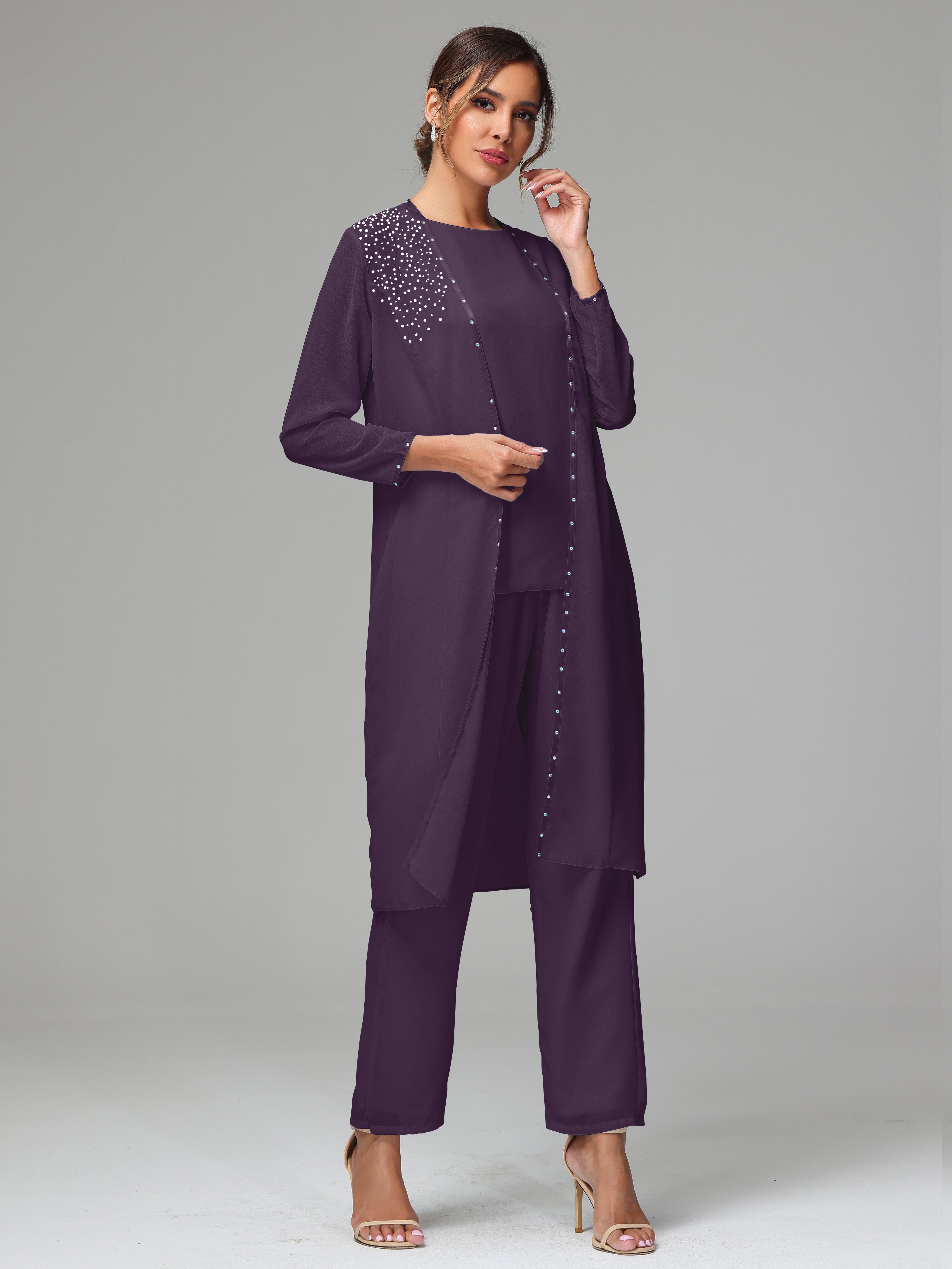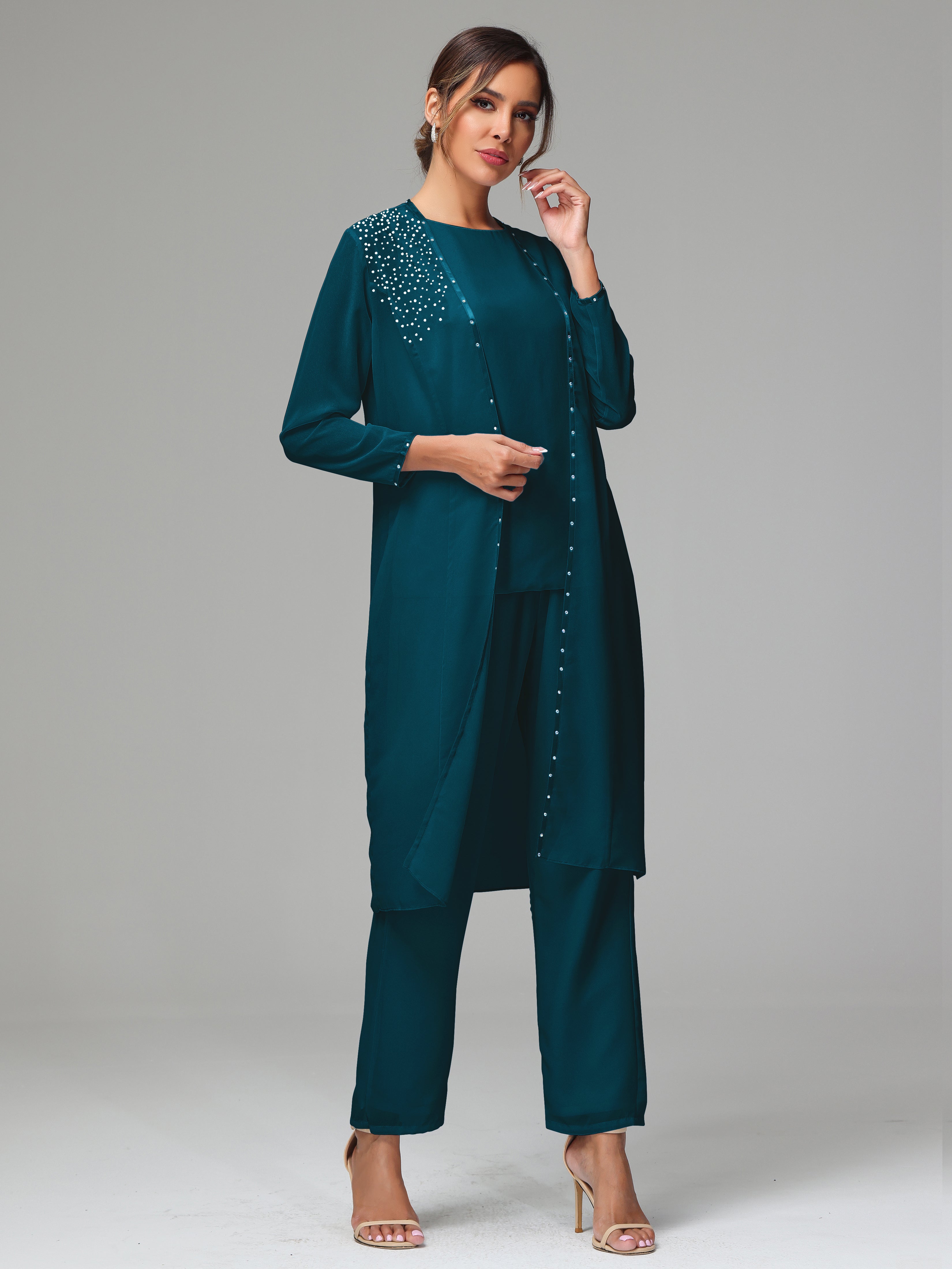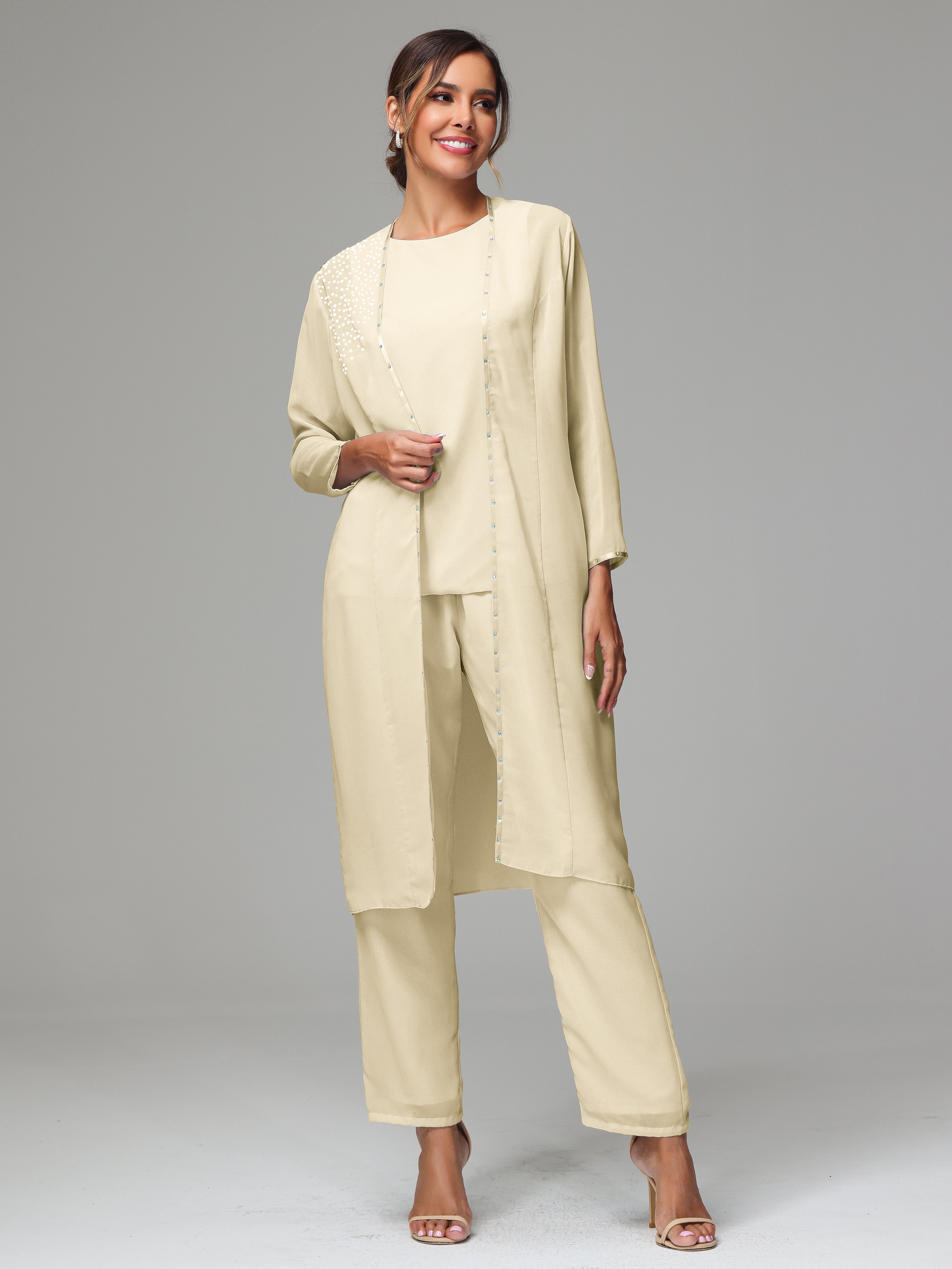 The 3 Pieces Chiffon Fancy Mother Of The Bride Dress Pants Suits is a fashionable yet timeless look for special occasions. It is made from high quality chiffon and features three pieces in the set, with elegant details like a single-breasted jacket, dress, and pants. Perfect for a chic and sophisticated look!