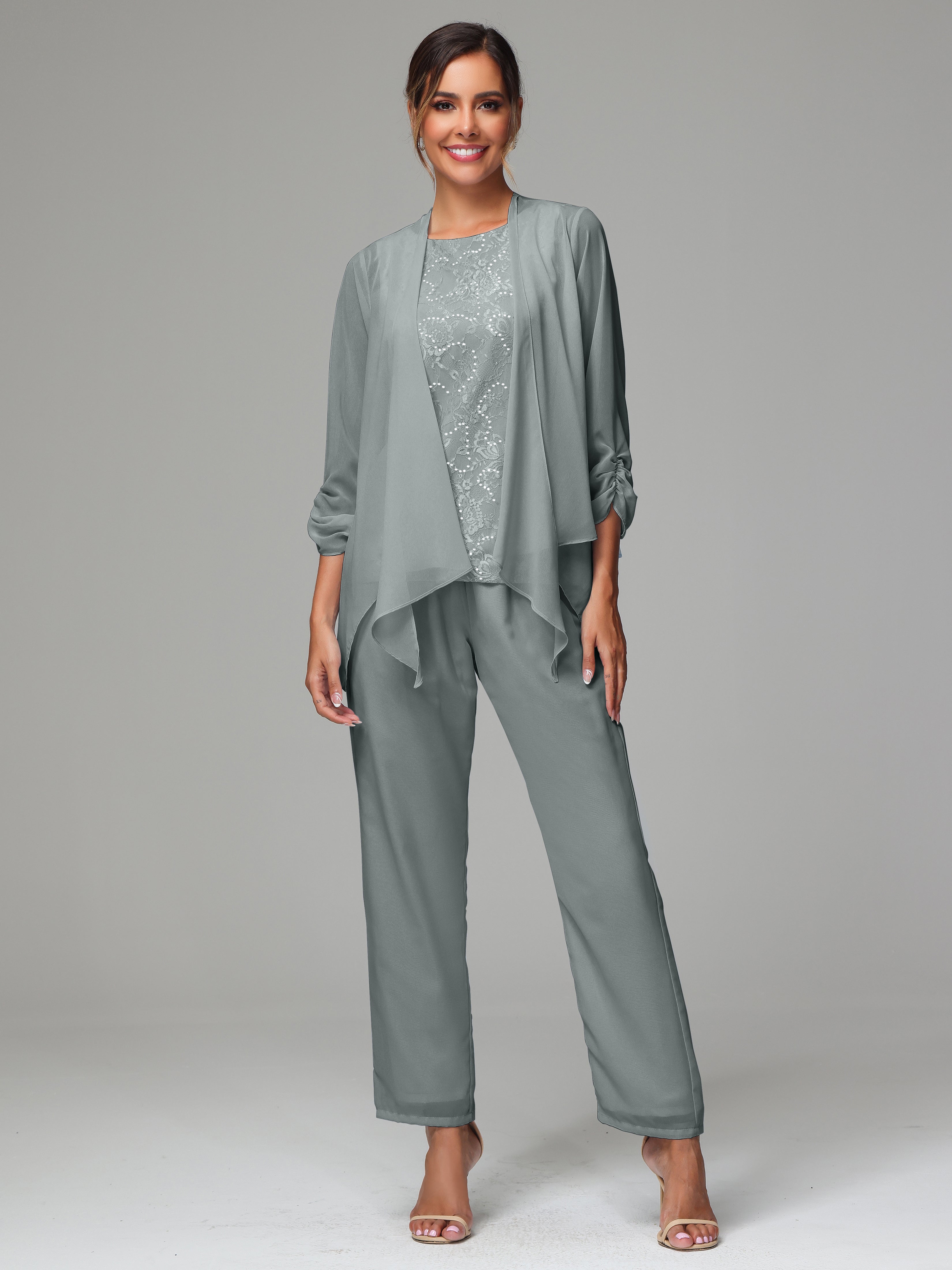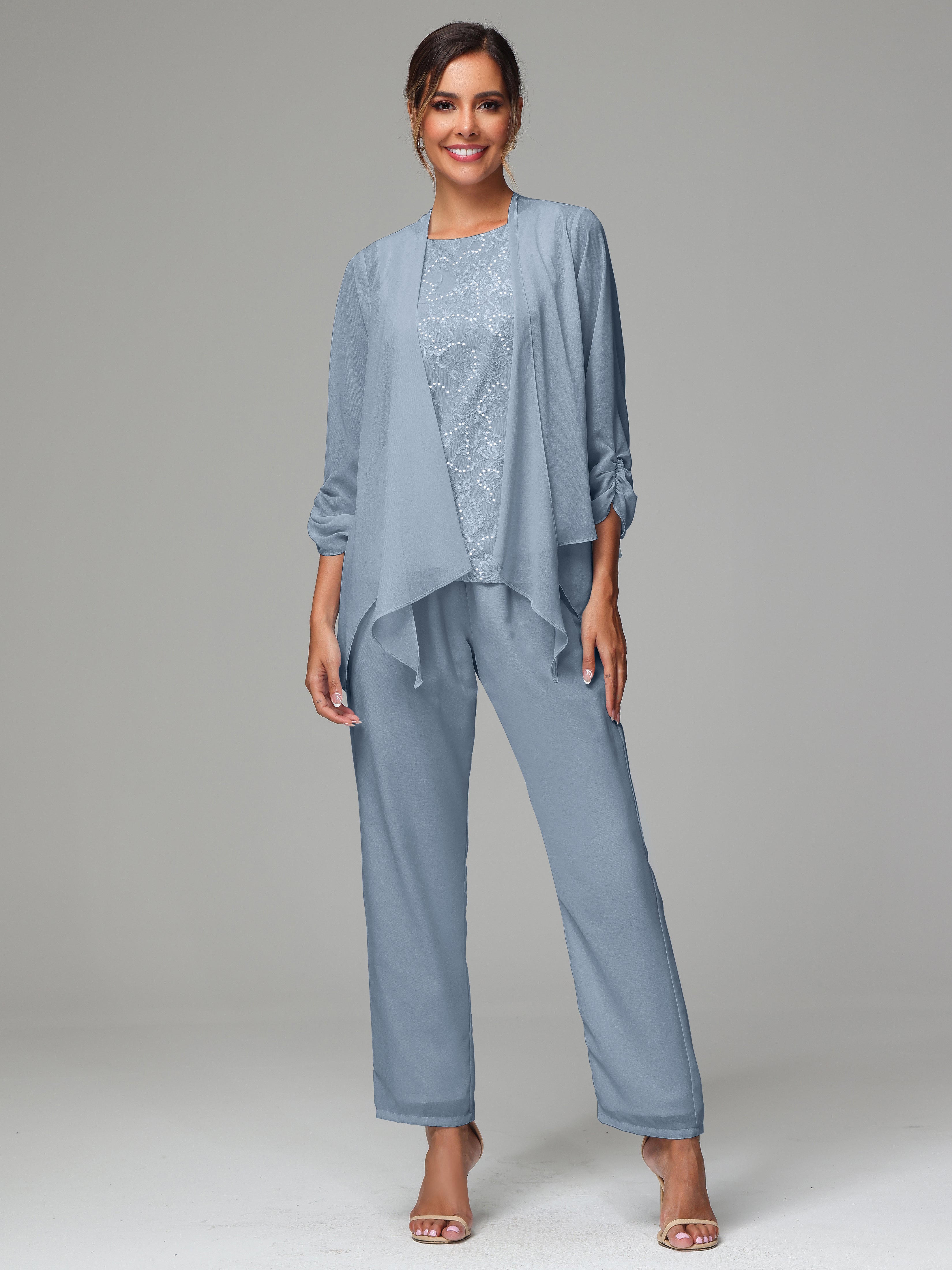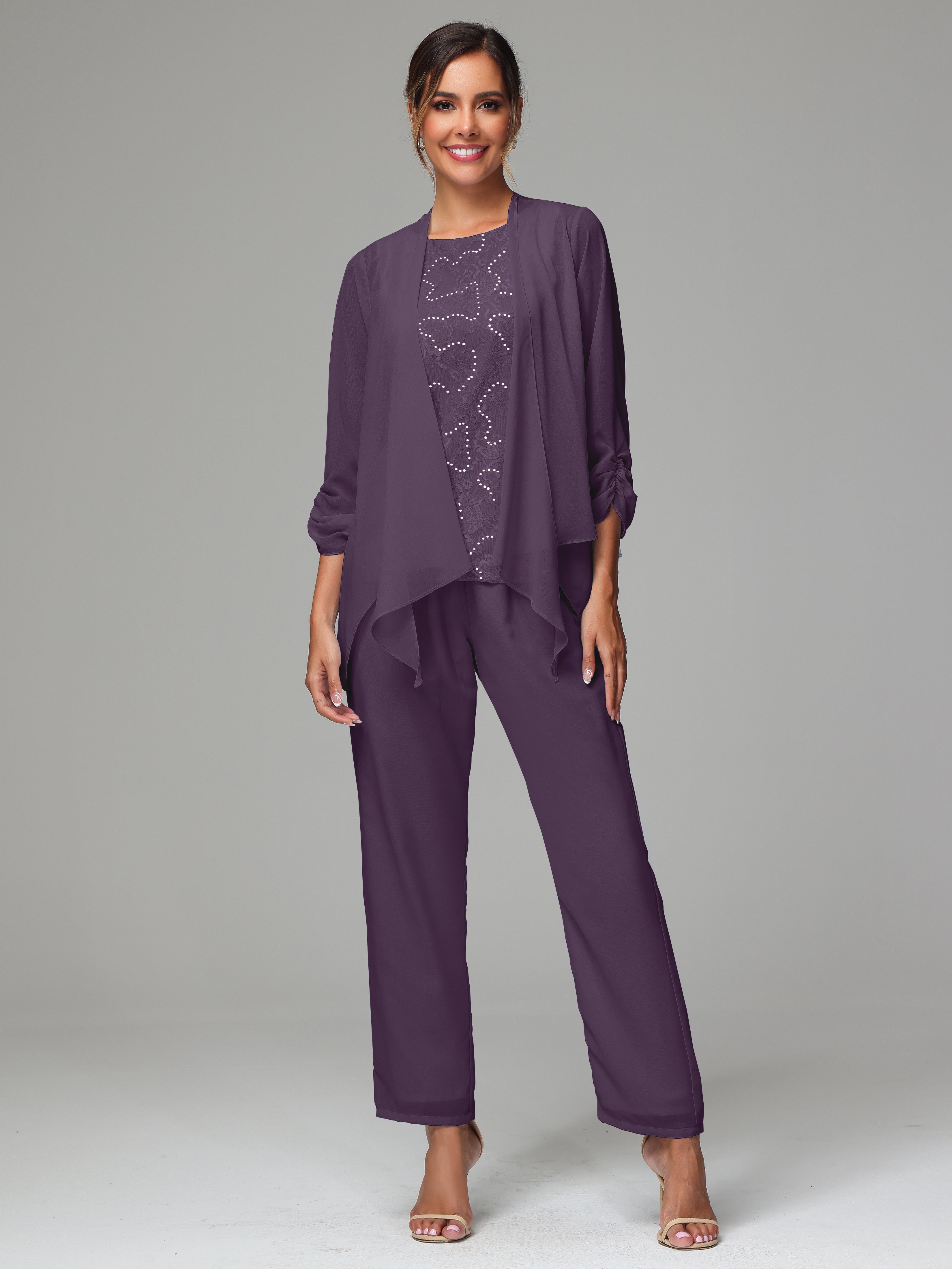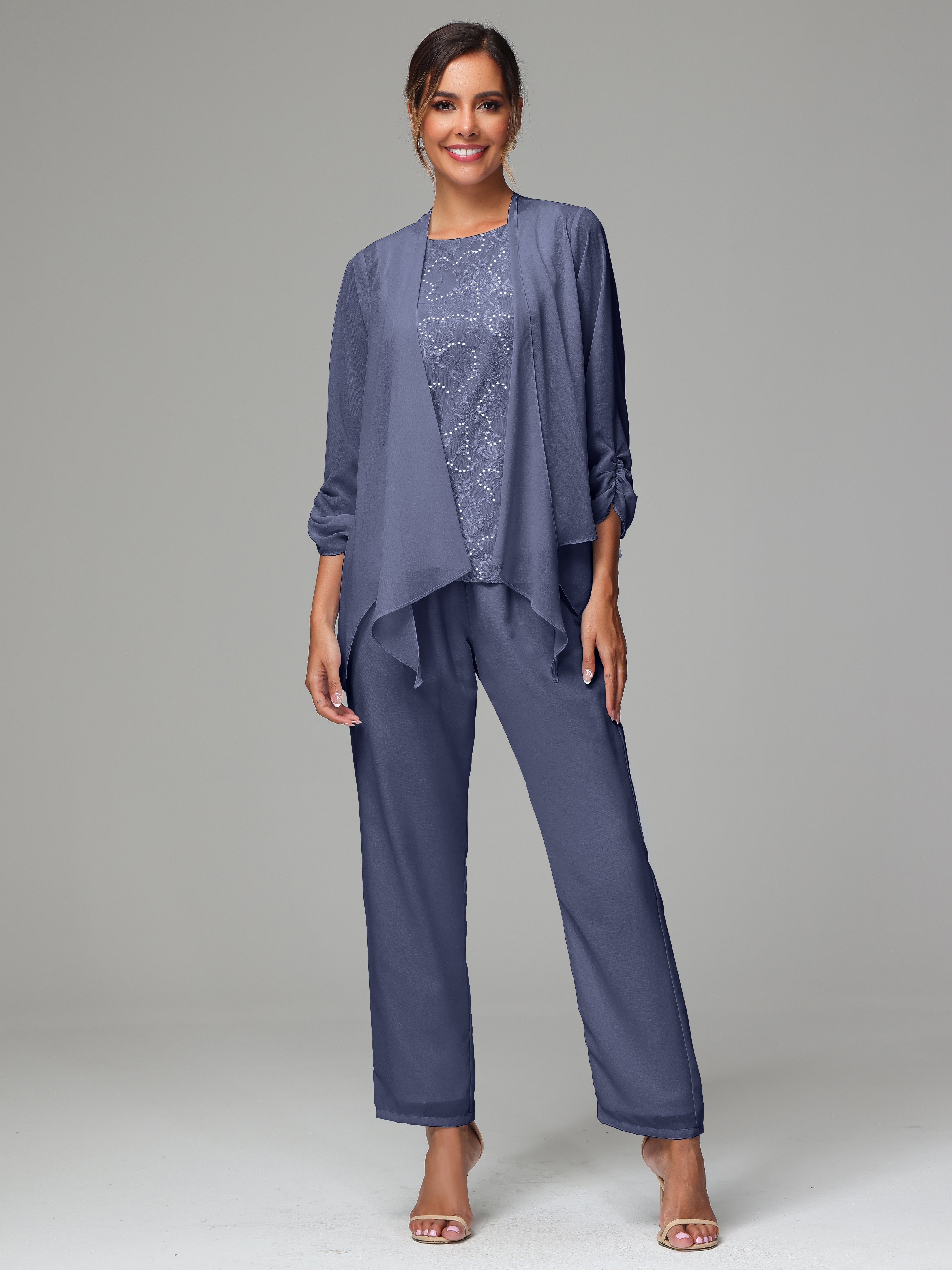 This three-piece chiffon lace mother of the bride dress pants suit offers a graceful, yet versatile look. Featuring long sleeves and a fashionable chiffon lace fabric, this timeless ensemble is perfect for any formal occasion.