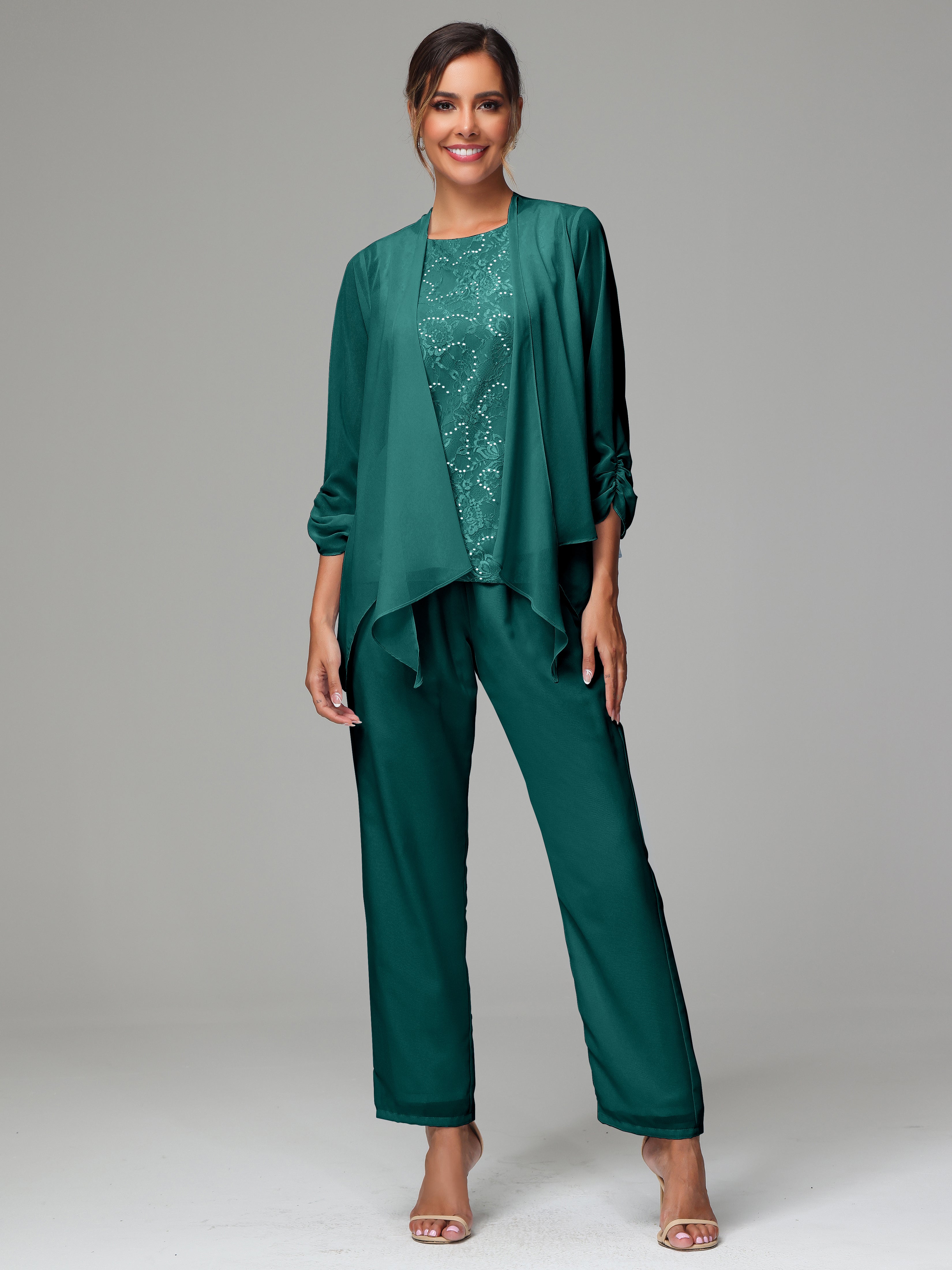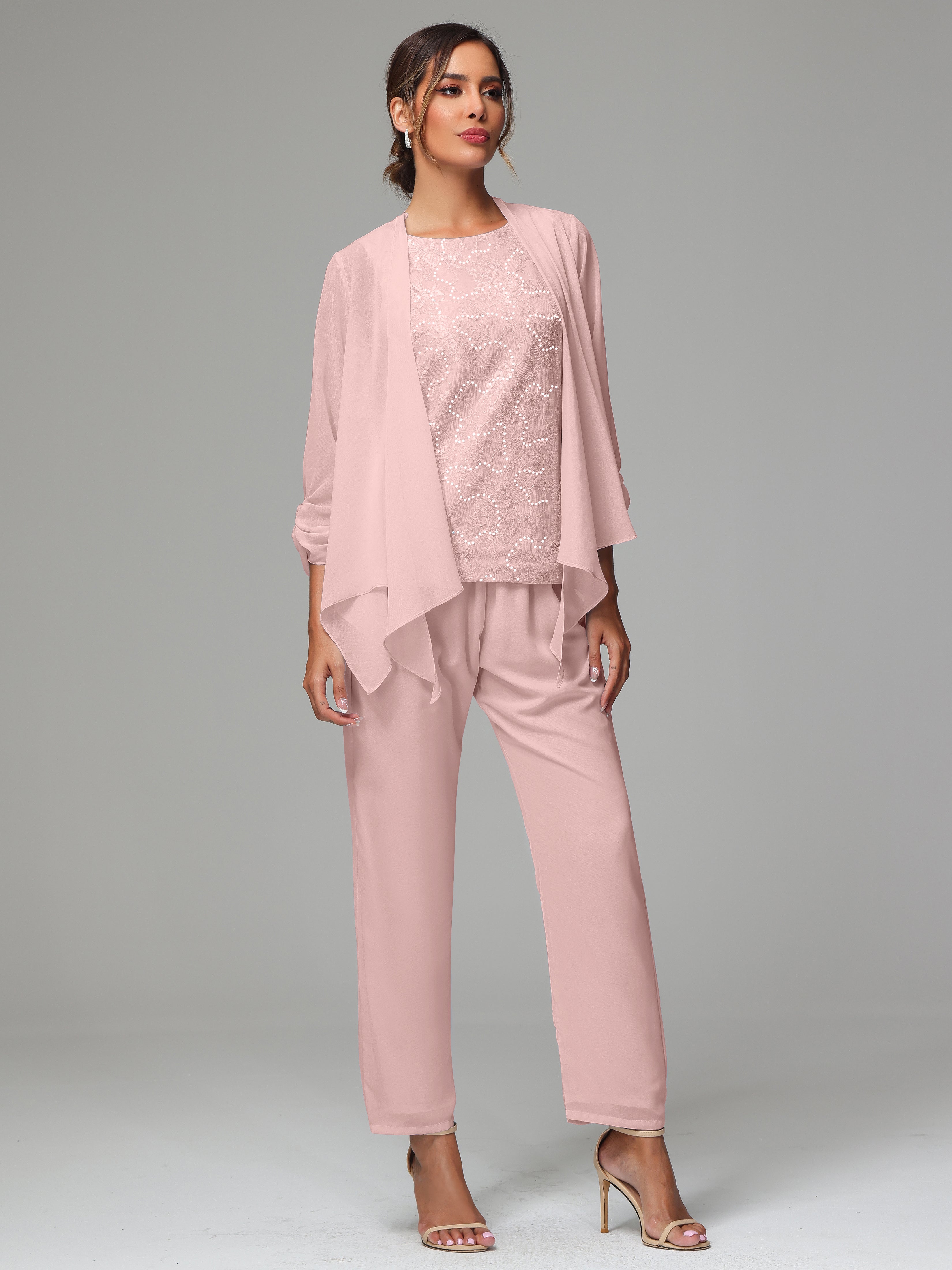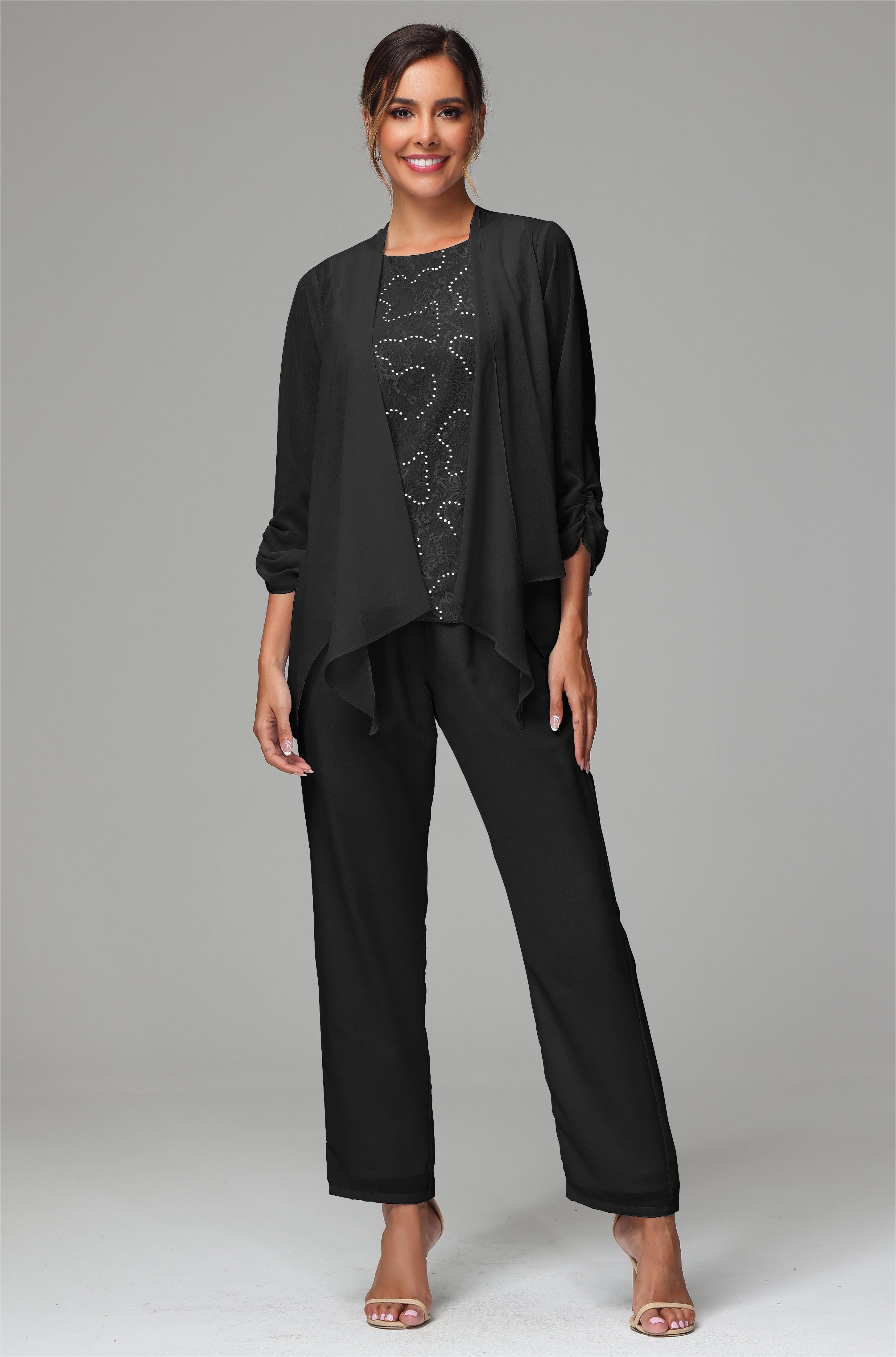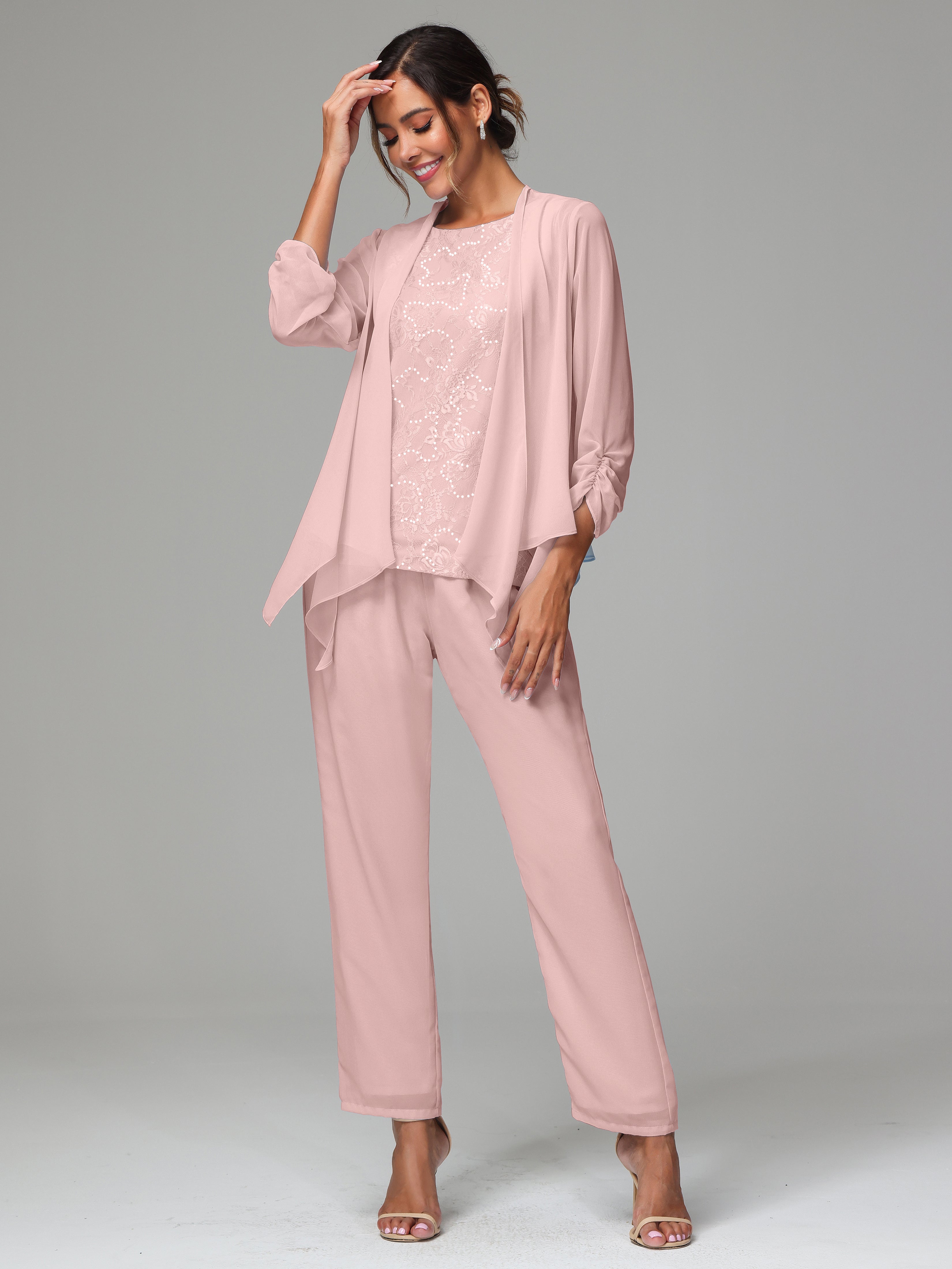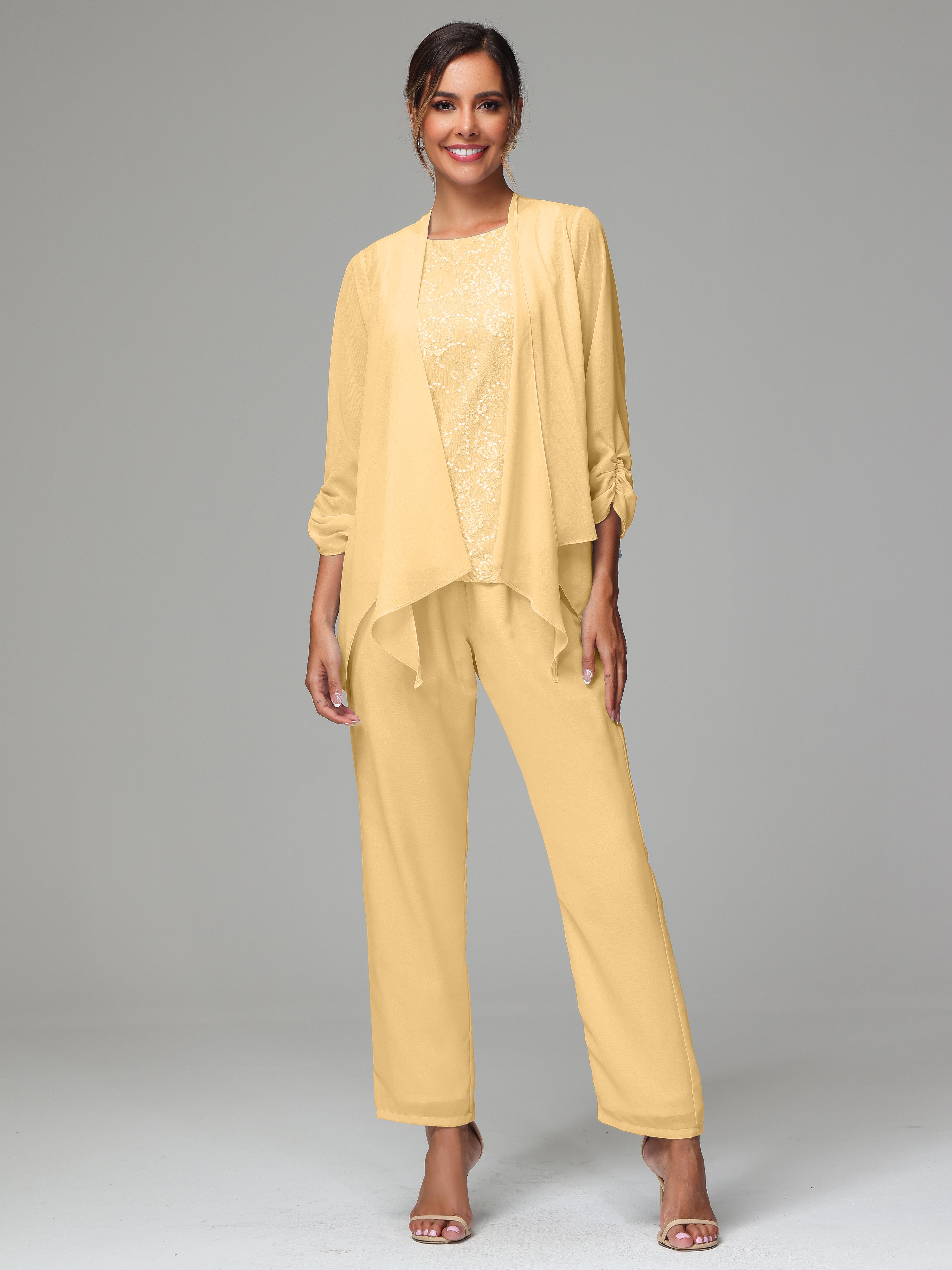 This three-piece chiffon lace mother of the bride dress pants suit offers a graceful, yet versatile look. Featuring long sleeves and a fashionable chiffon lace fabric, this timeless ensemble is perfect for any formal occasion.