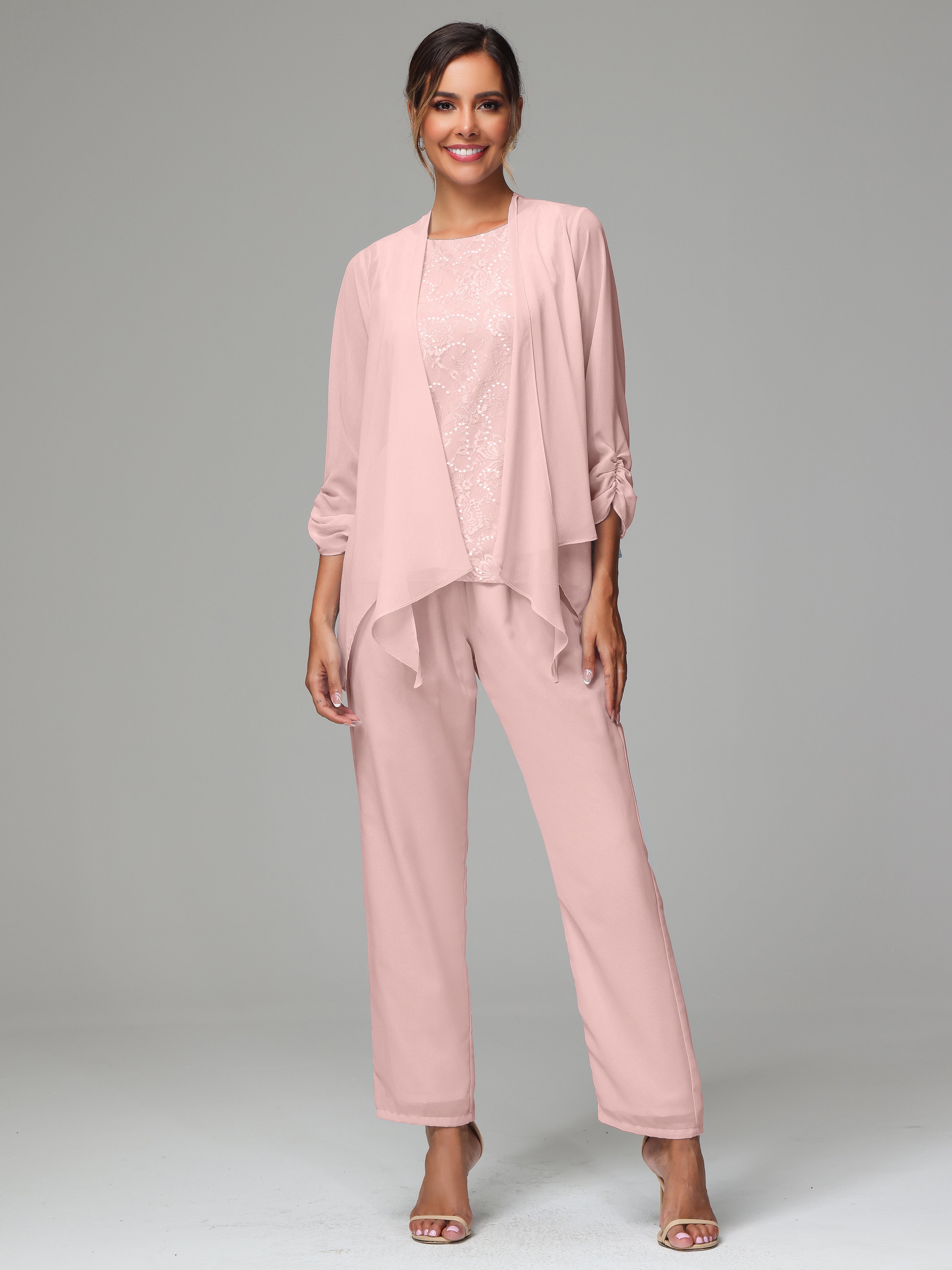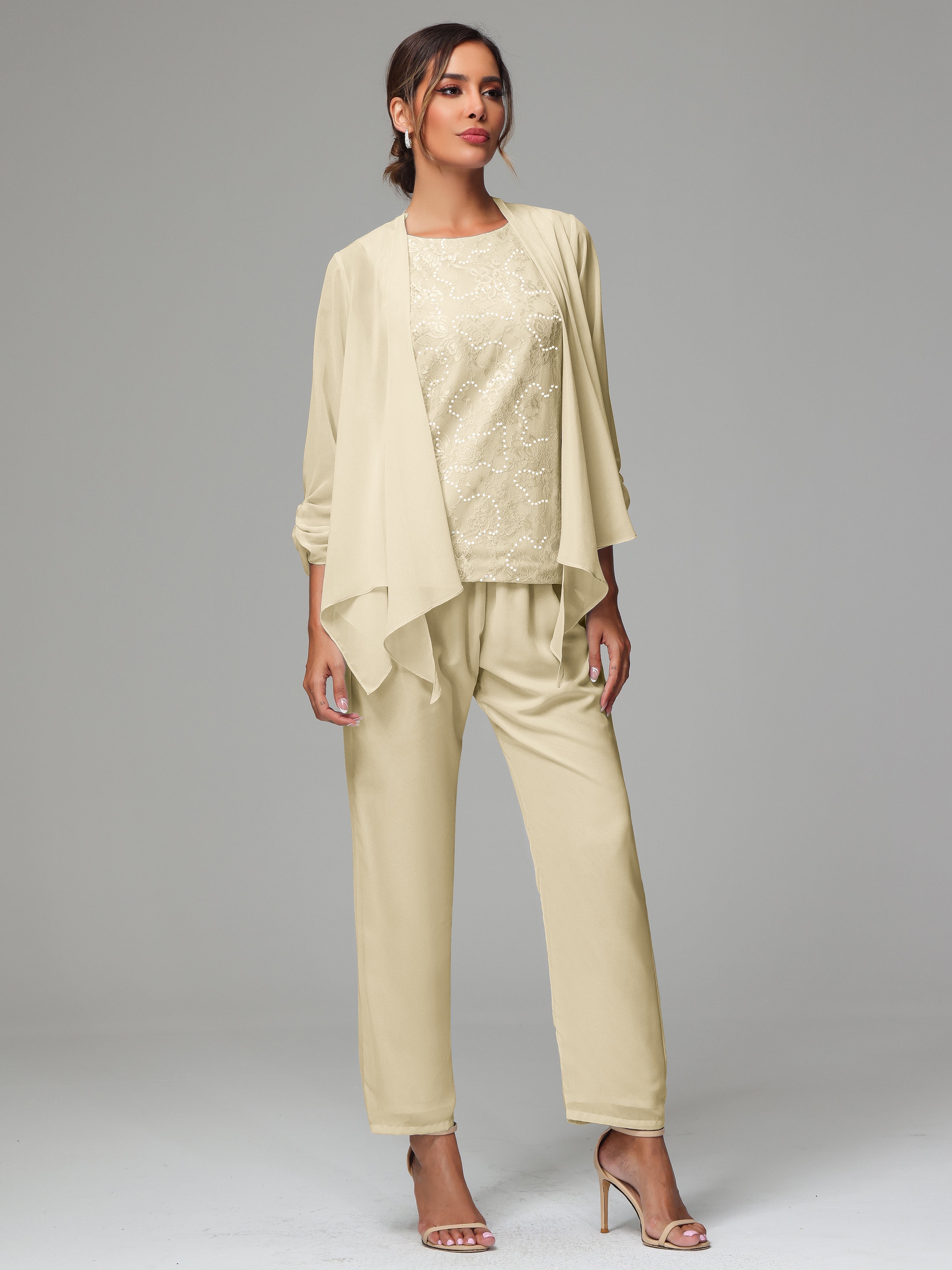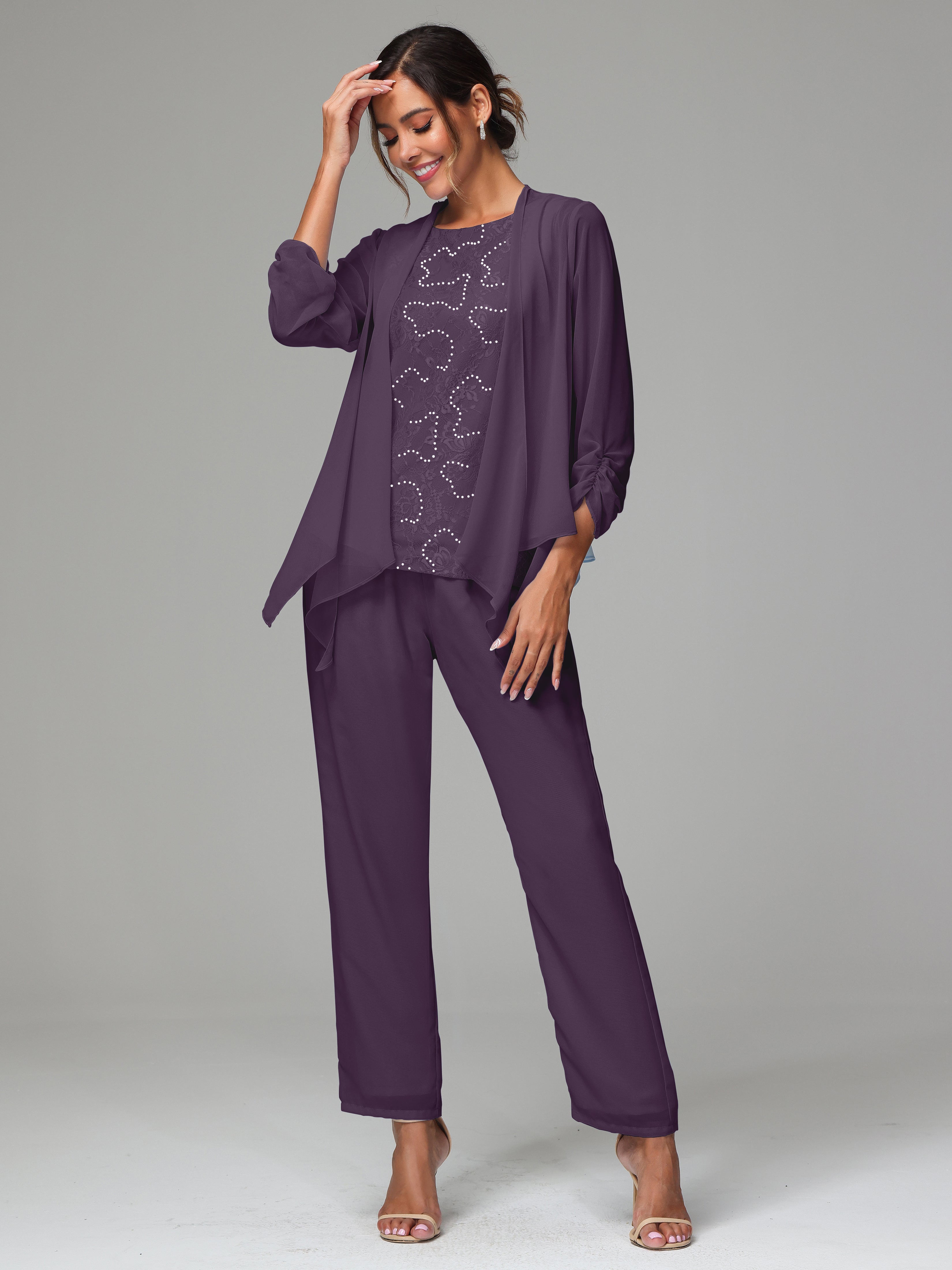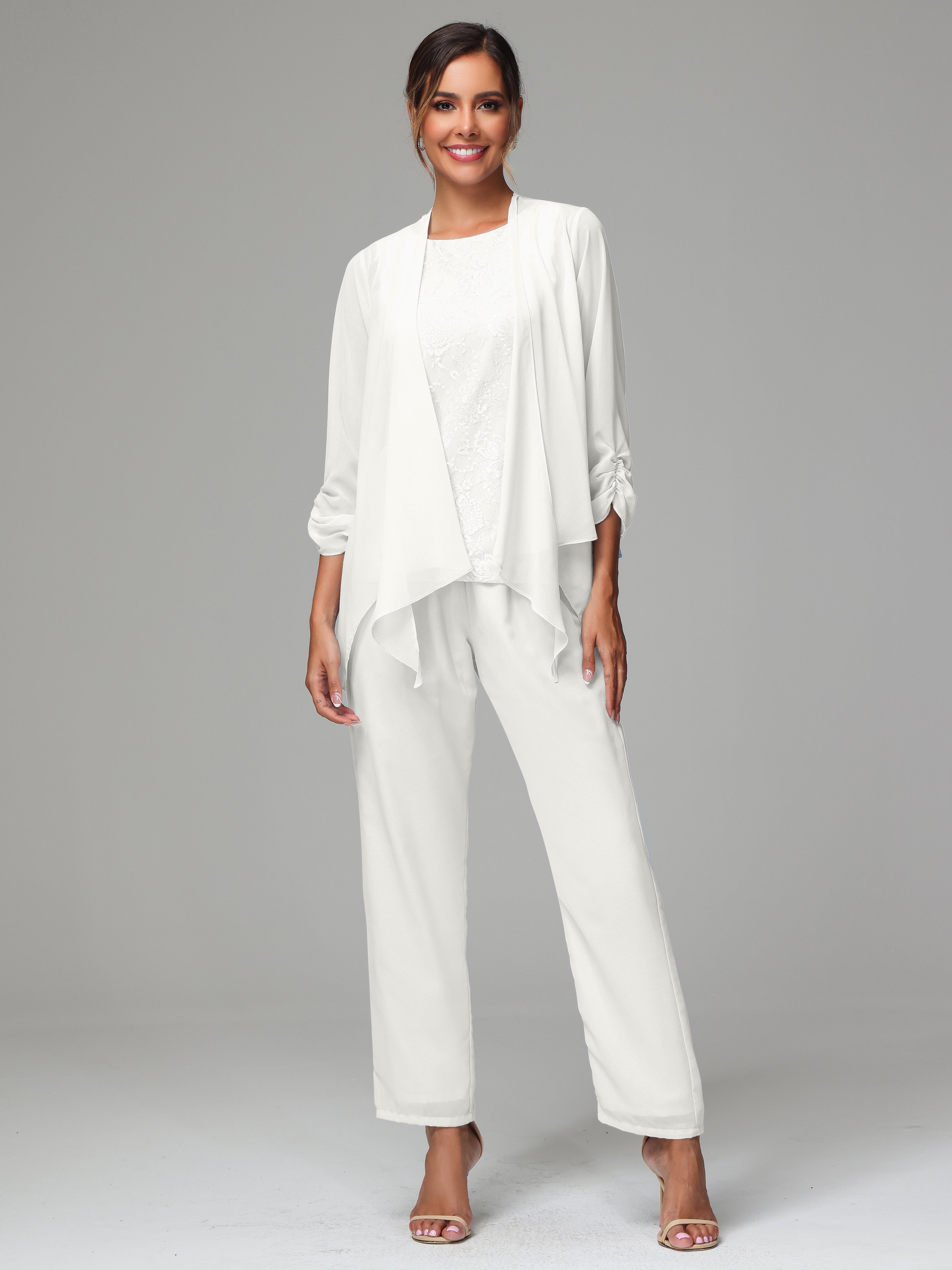 This three-piece chiffon lace mother of the bride dress pants suit offers a graceful, yet versatile look. Featuring long sleeves and a fashionable chiffon lace fabric, this timeless ensemble is perfect for any formal occasion.