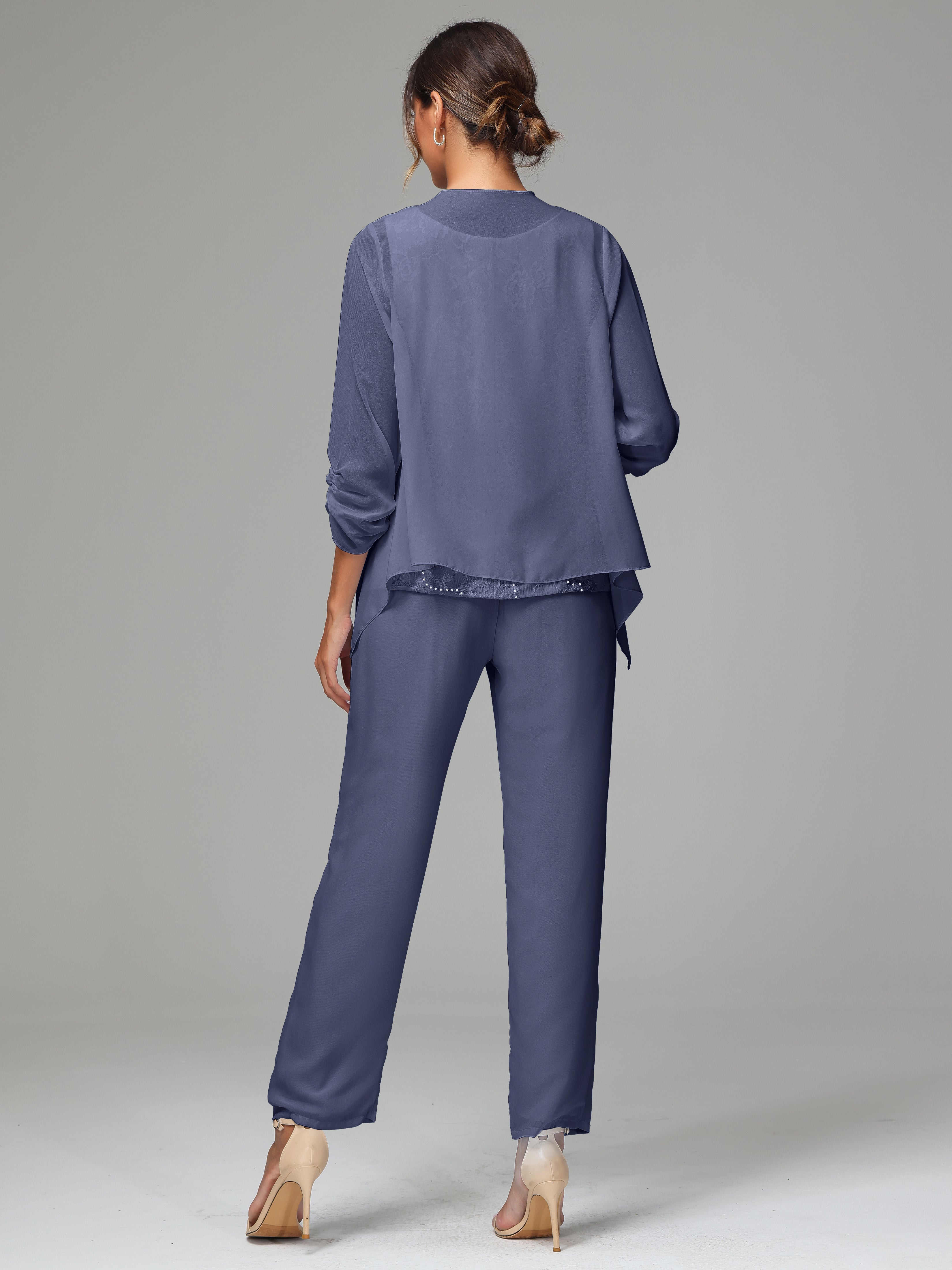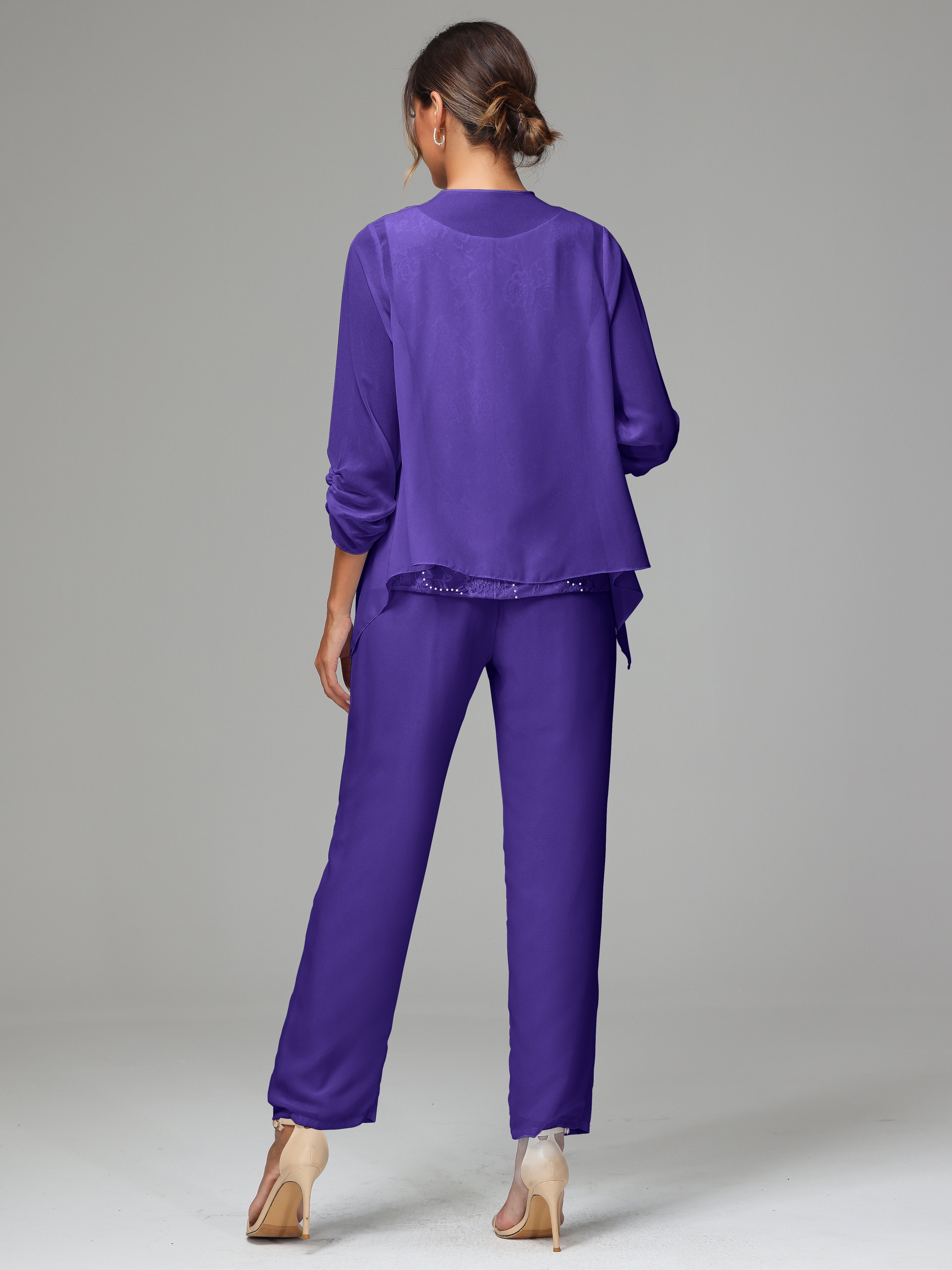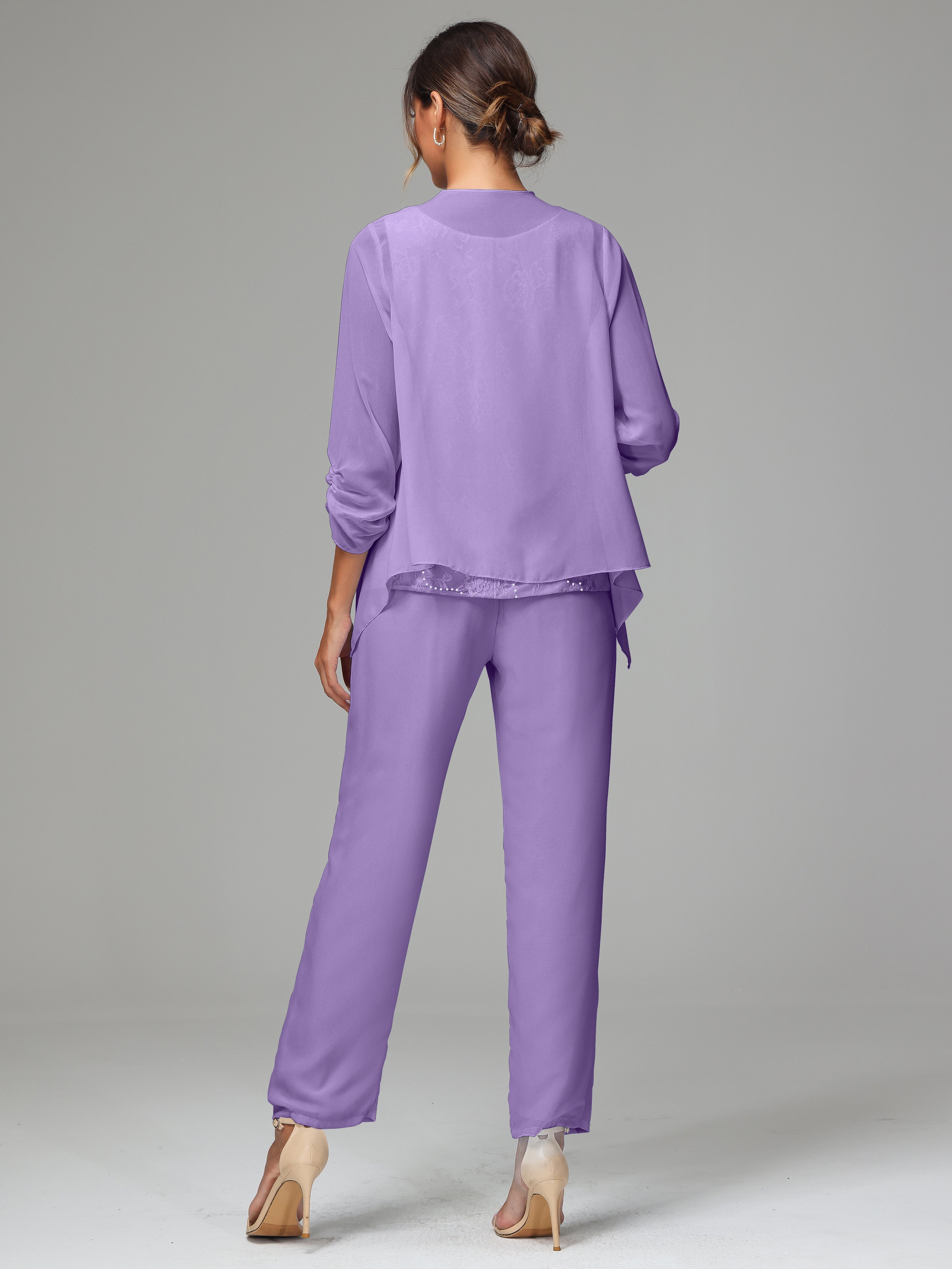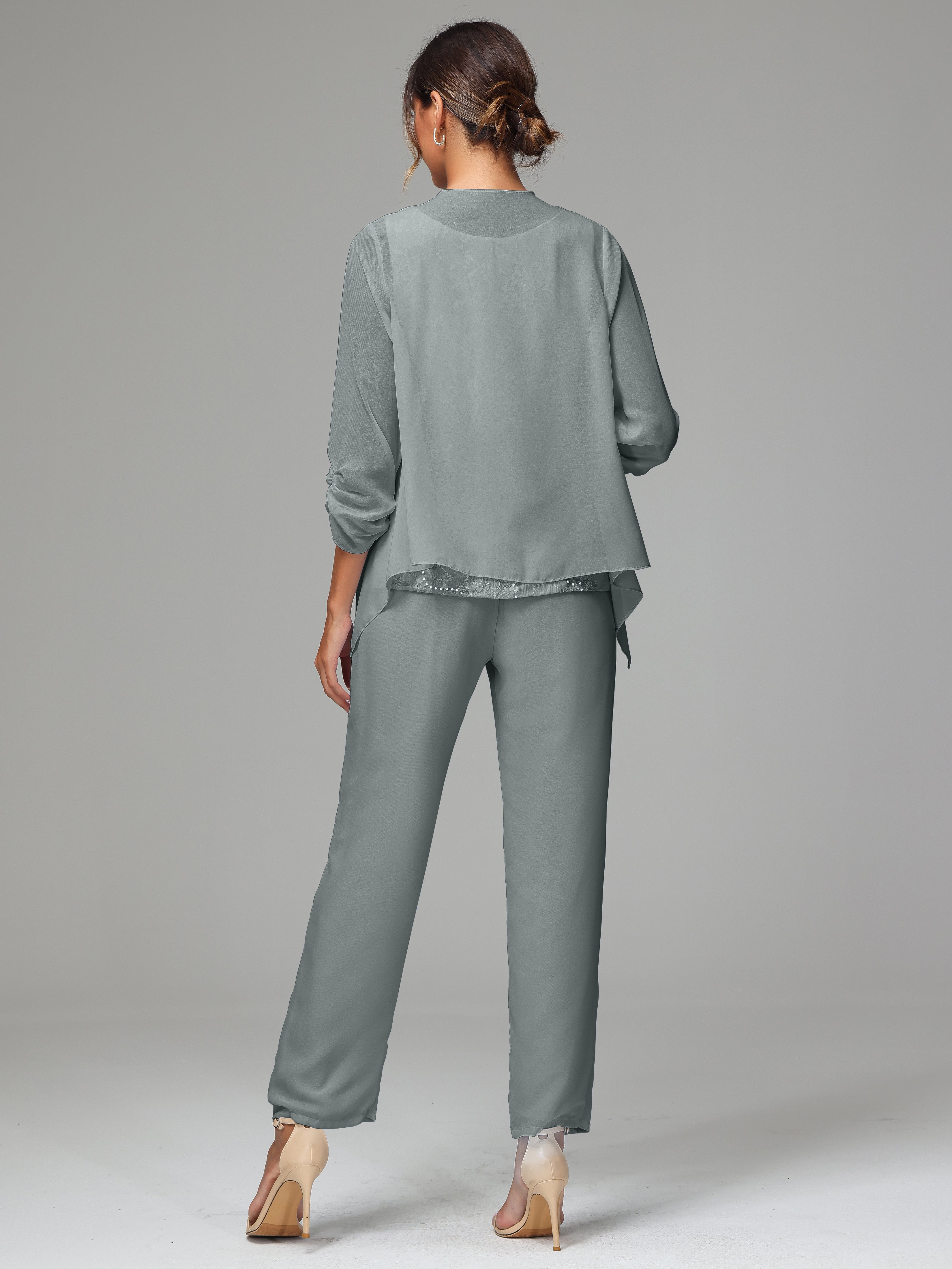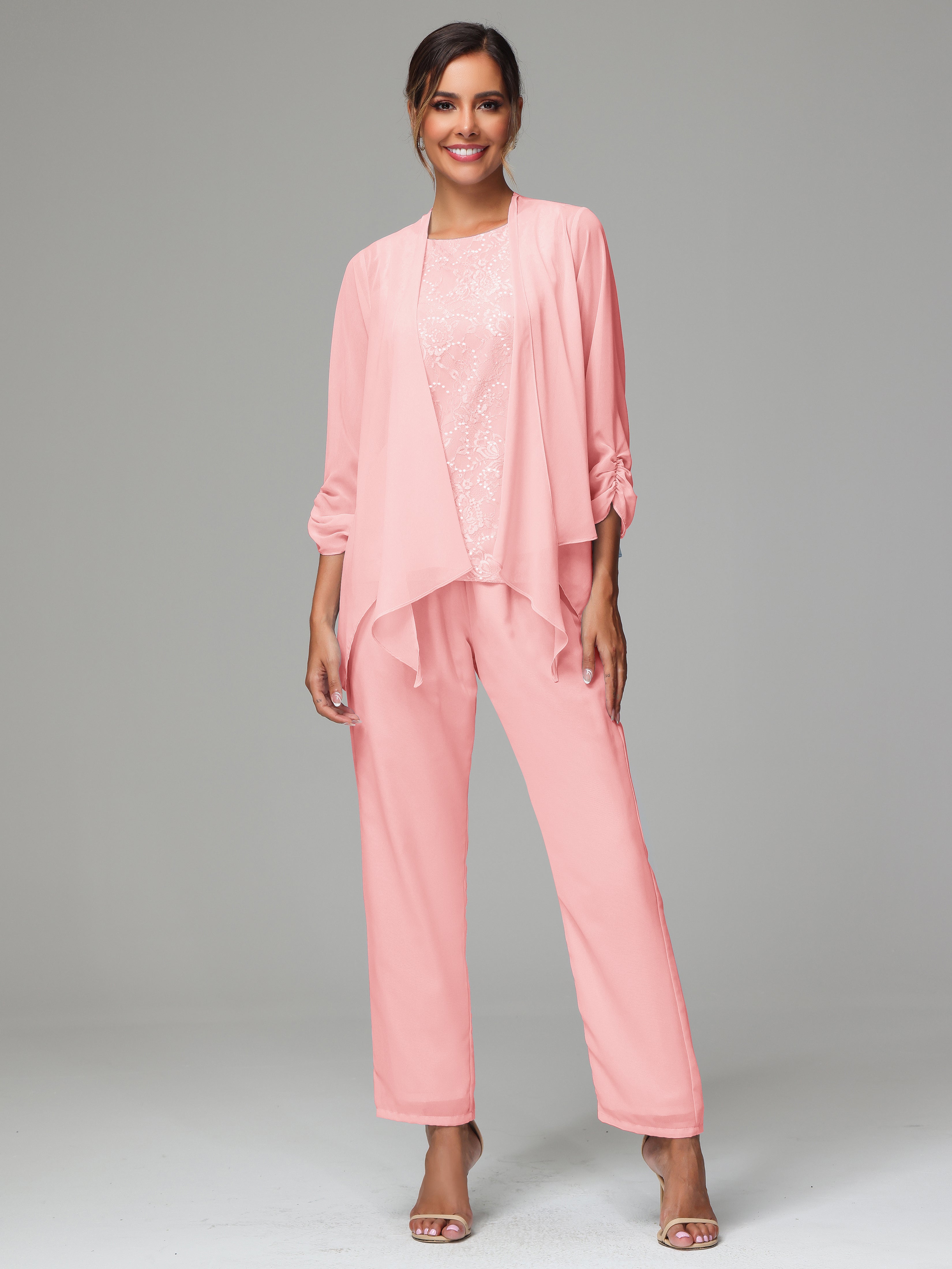 This three-piece chiffon lace mother of the bride dress pants suit offers a graceful, yet versatile look. Featuring long sleeves and a fashionable chiffon lace fabric, this timeless ensemble is perfect for any formal occasion.