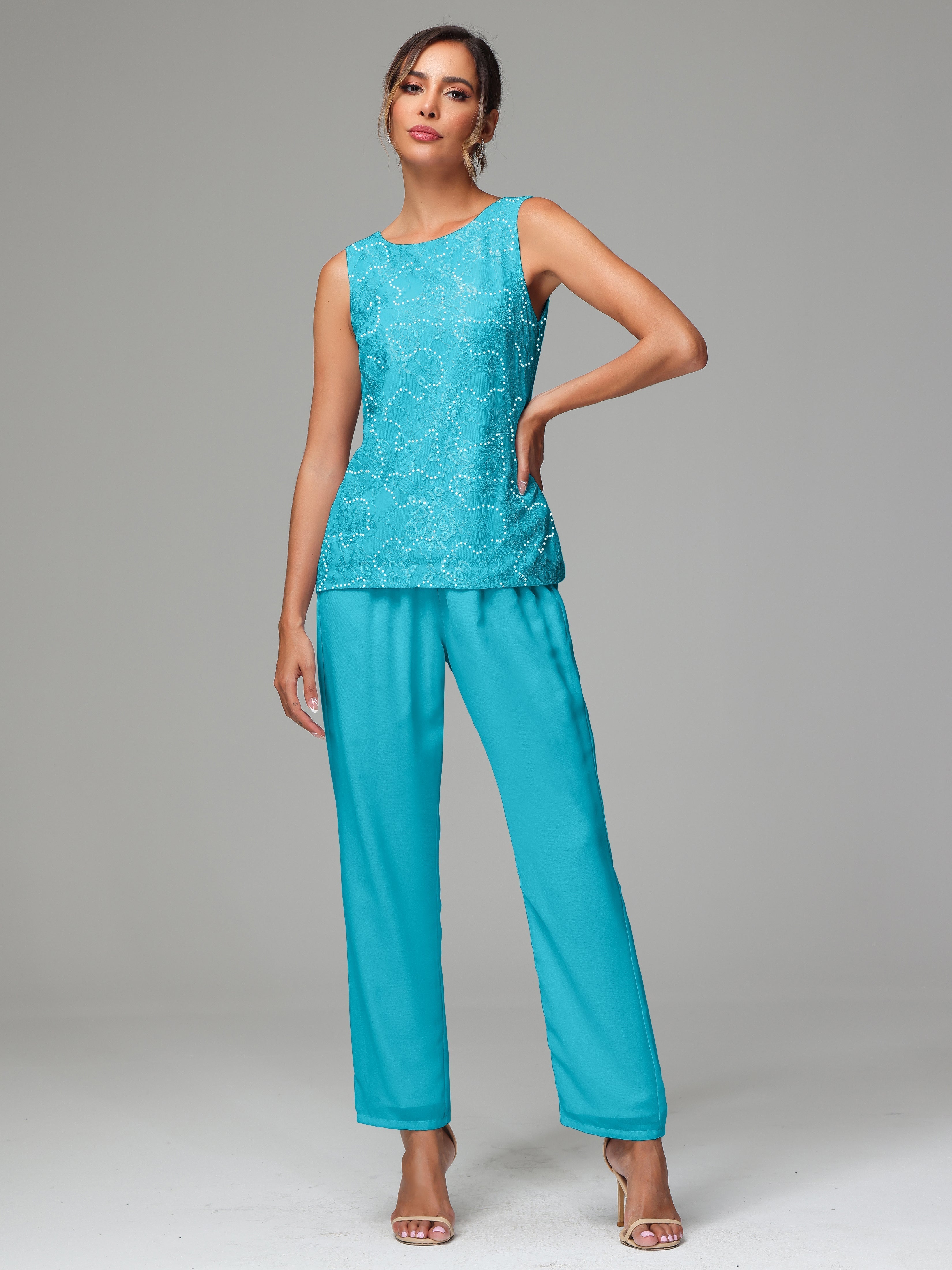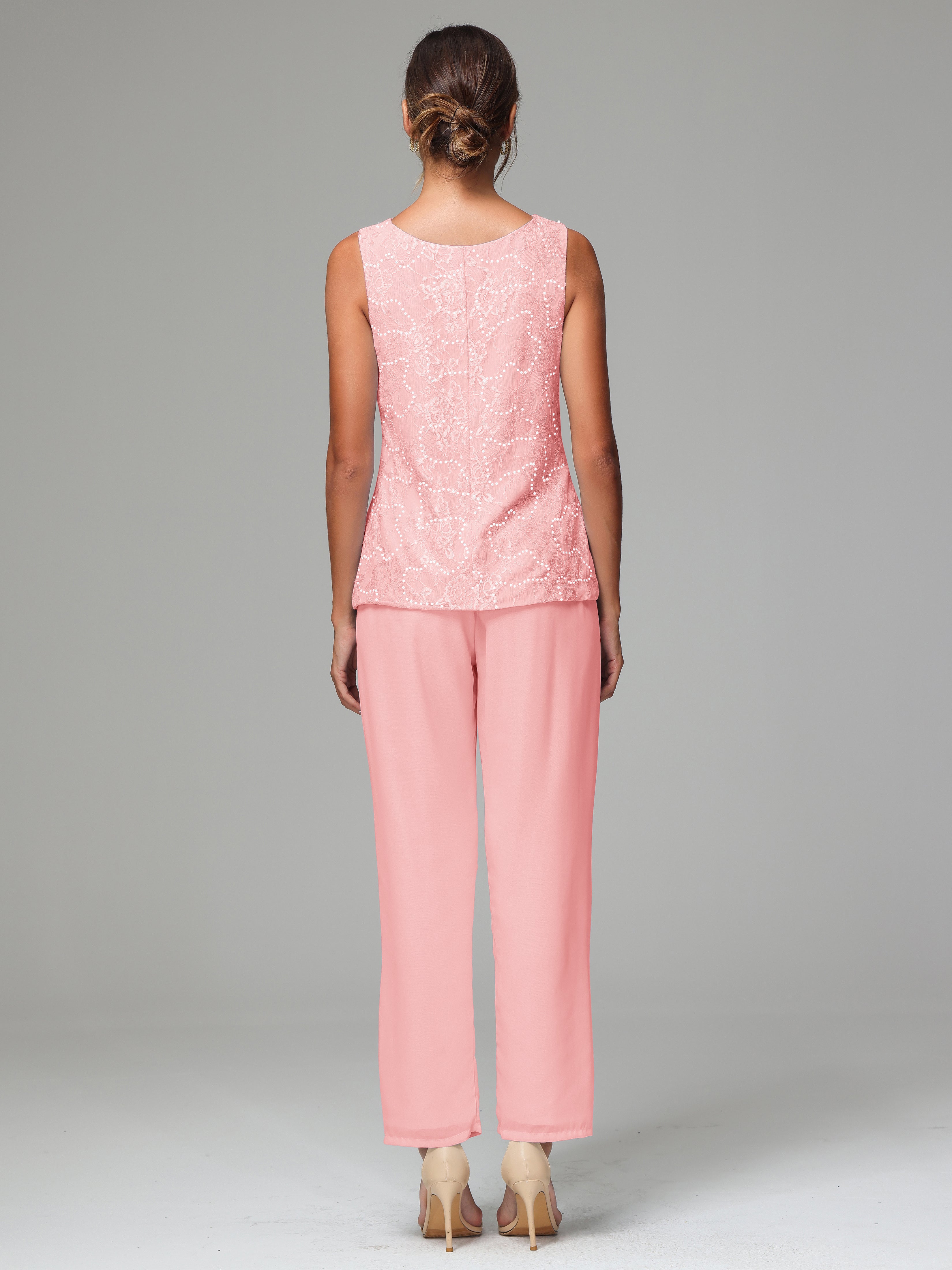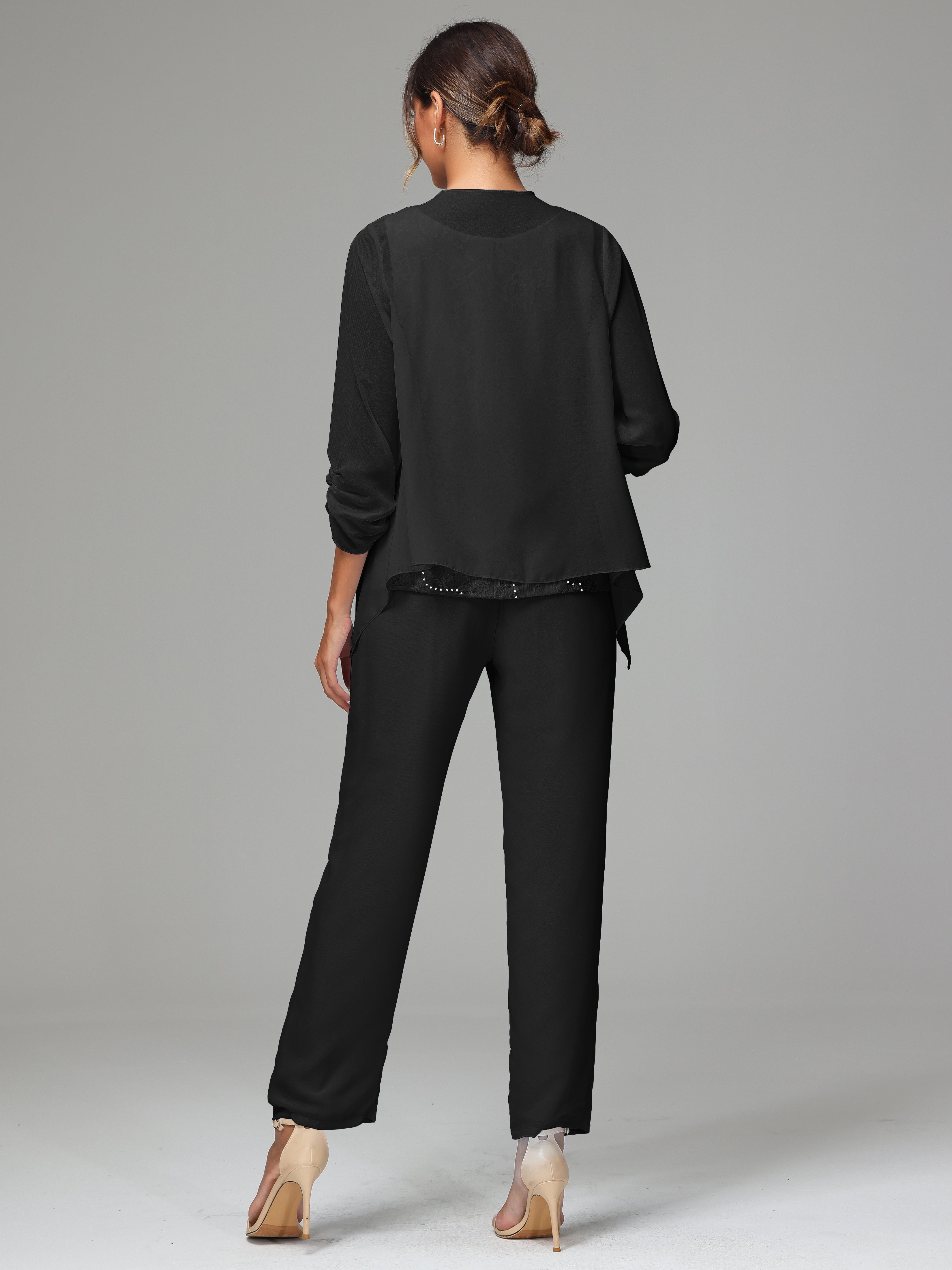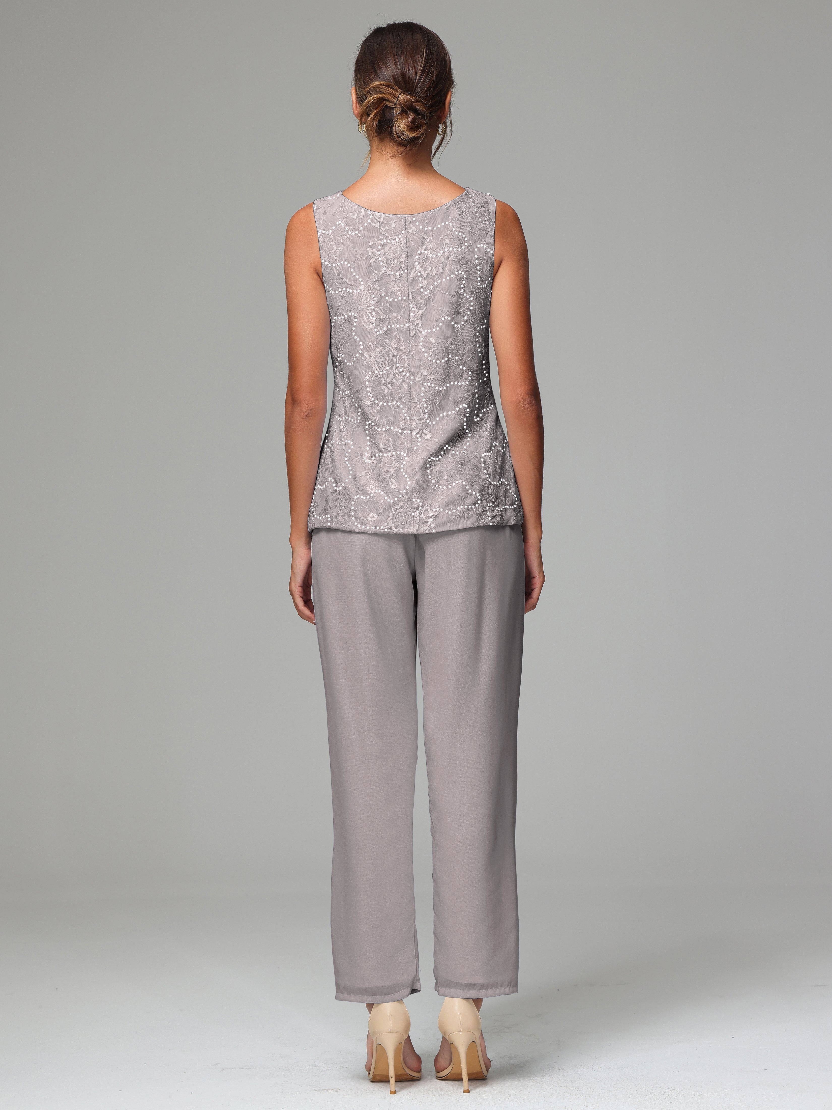 This three-piece chiffon lace mother of the bride dress pants suit offers a graceful, yet versatile look. Featuring long sleeves and a fashionable chiffon lace fabric, this timeless ensemble is perfect for any formal occasion.