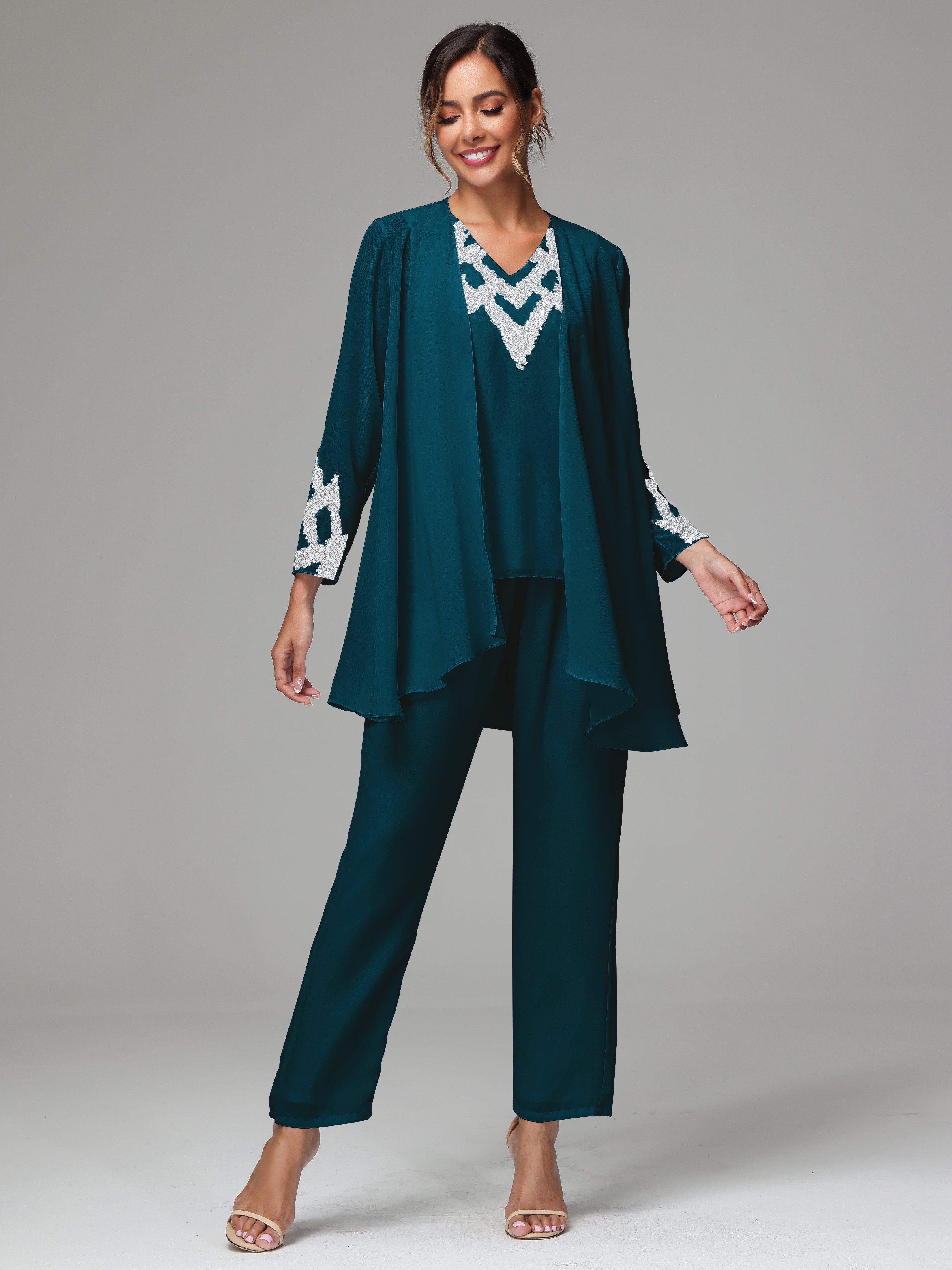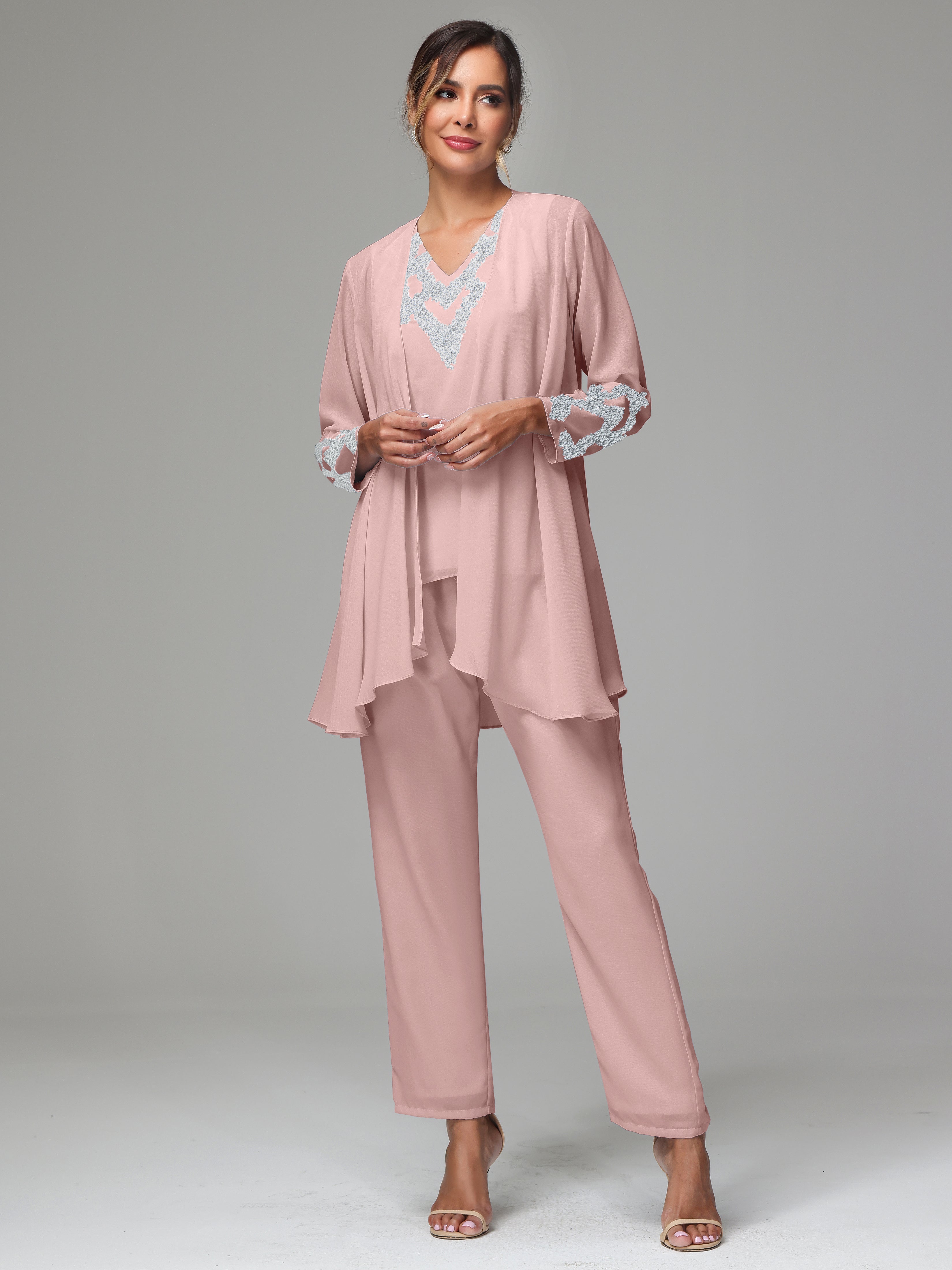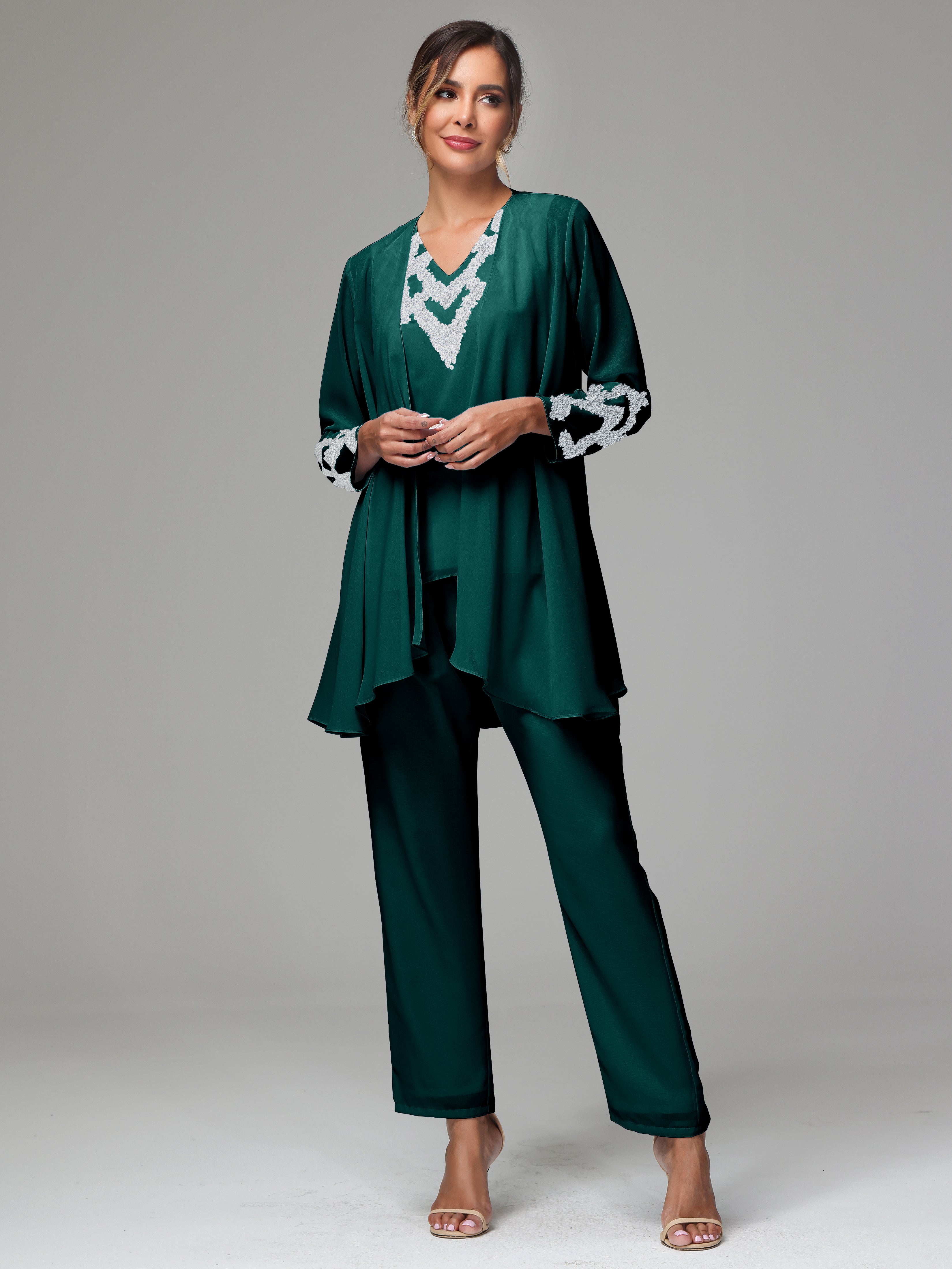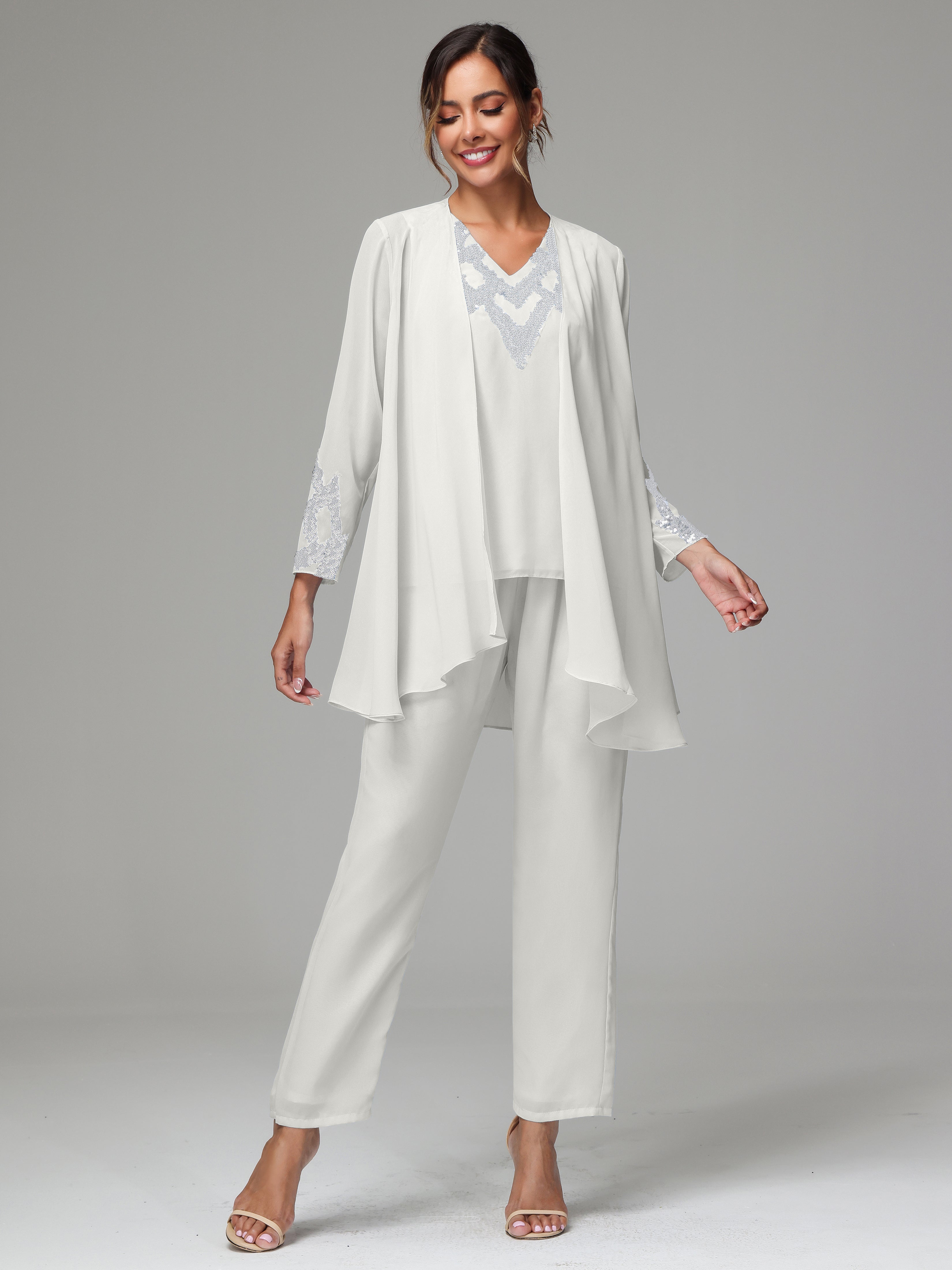 This 3 Pieces Long Sleeves Chiffon Lace Mother Of The Bride Dress Pants Suits is an exquisite ensemble crafted from high-quality chiffon and lace fabric. The set features a long-sleeve jacket, dress, and pants, all exquisitely designed to make you look and feel your best on the big day.