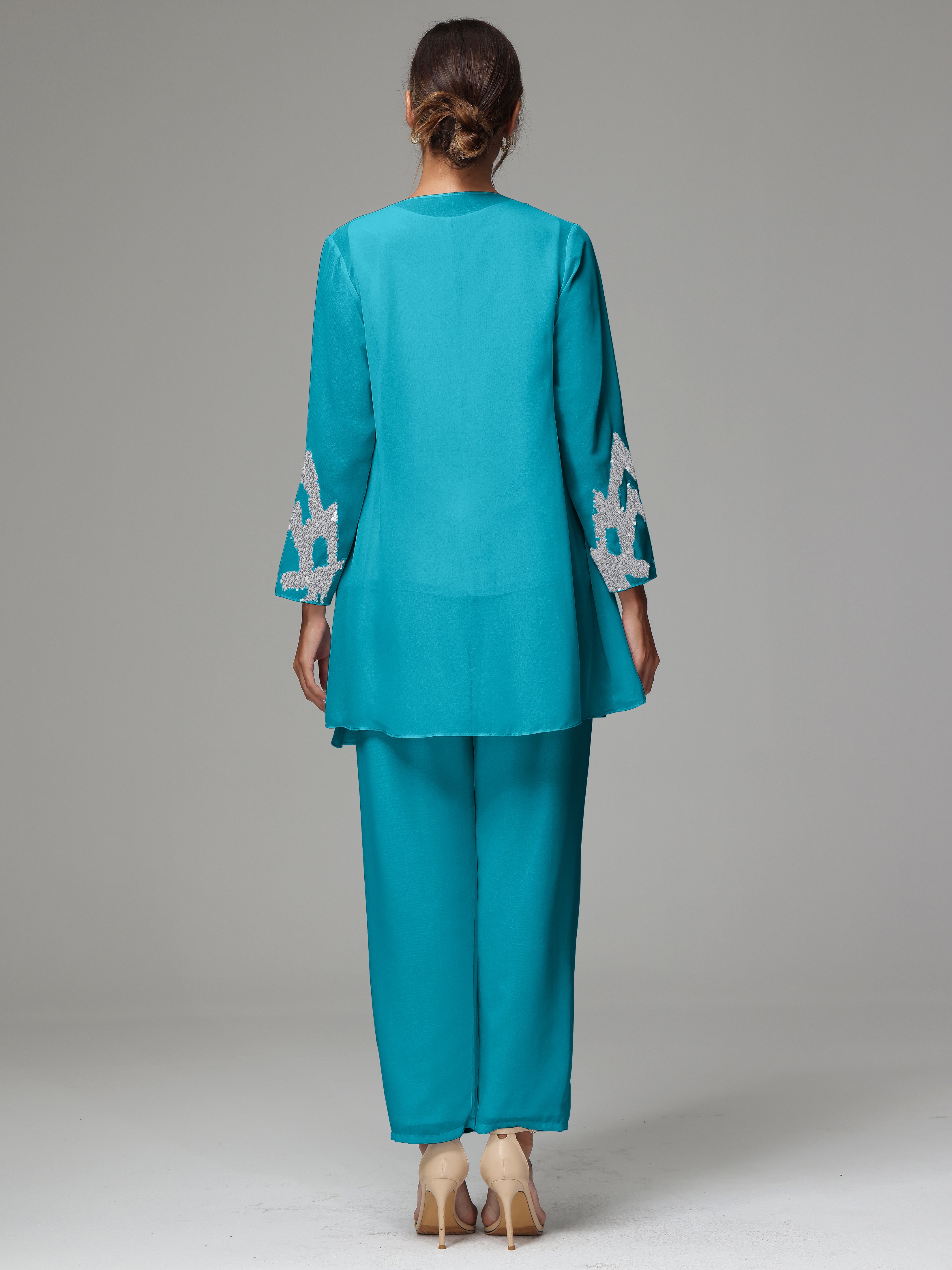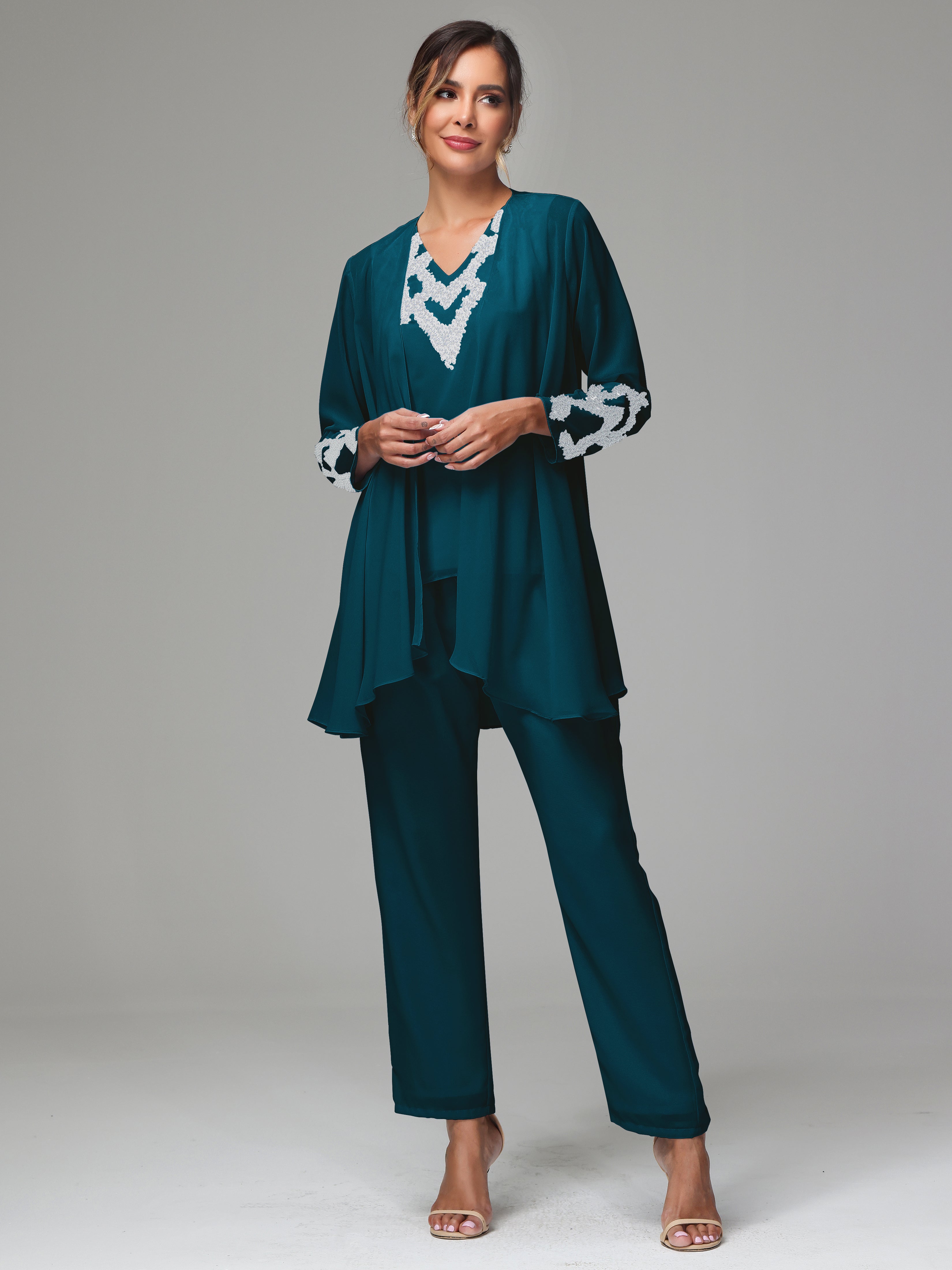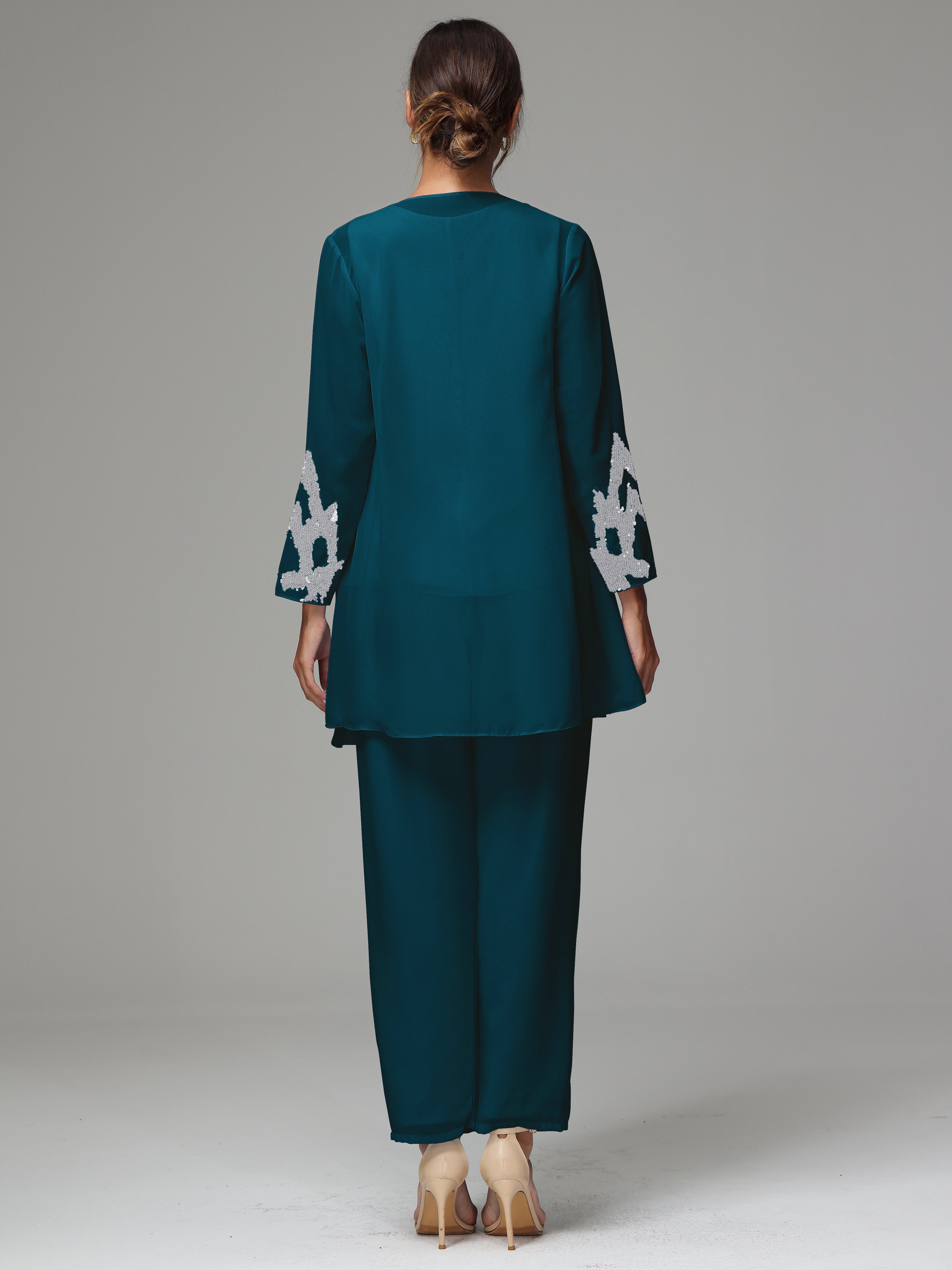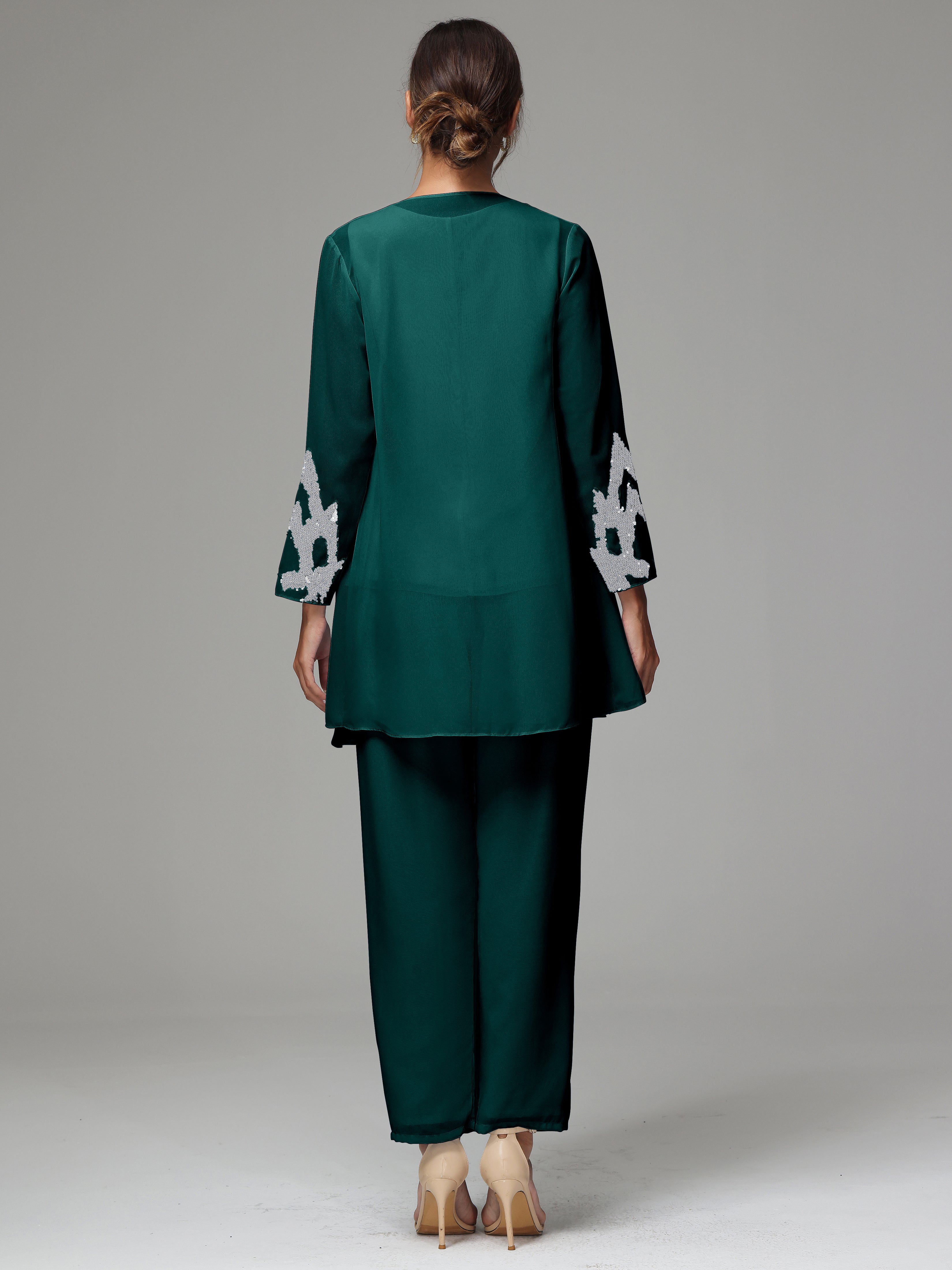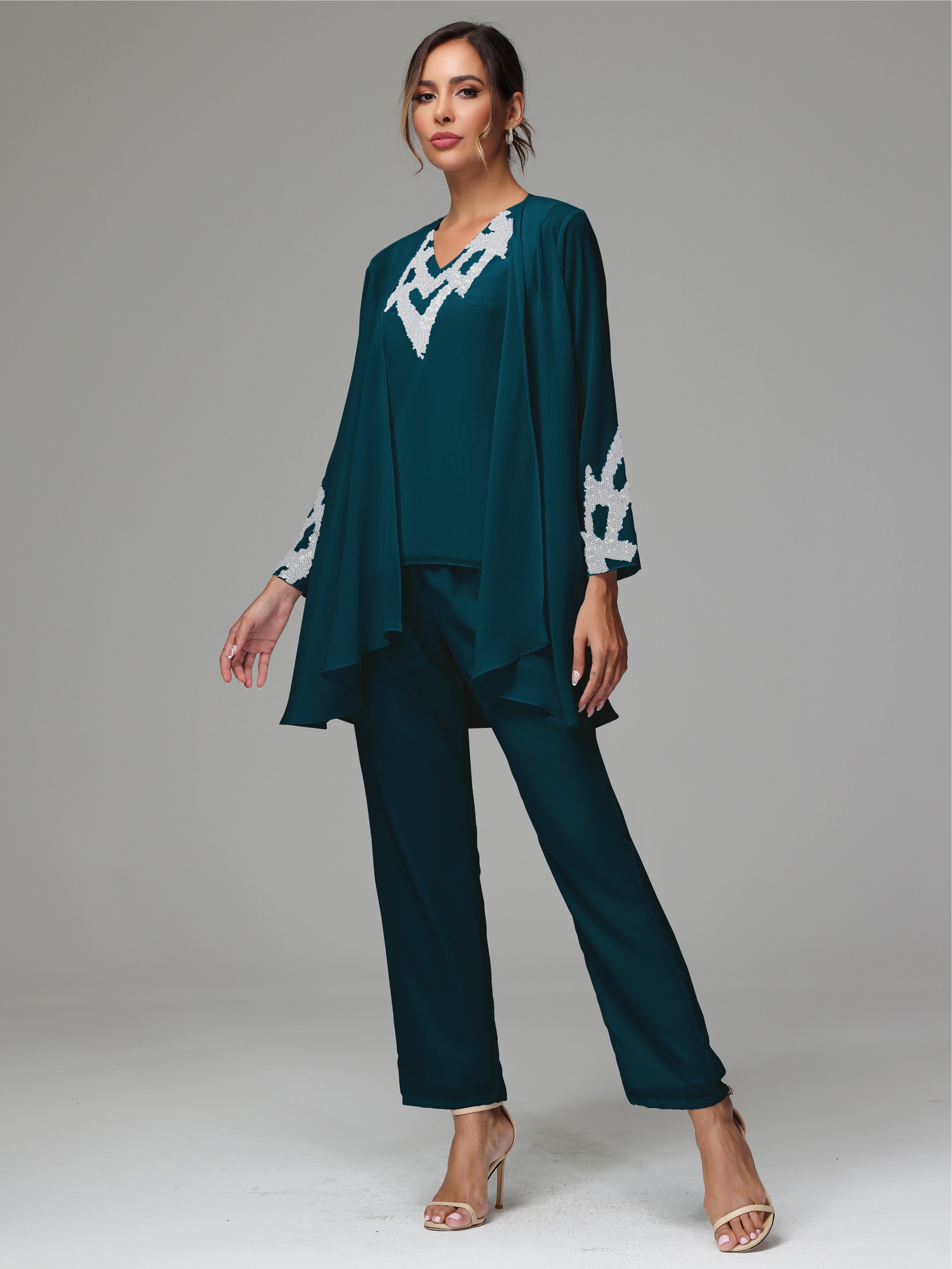 This 3 Pieces Long Sleeves Chiffon Lace Mother Of The Bride Dress Pants Suits is an exquisite ensemble crafted from high-quality chiffon and lace fabric. The set features a long-sleeve jacket, dress, and pants, all exquisitely designed to make you look and feel your best on the big day.