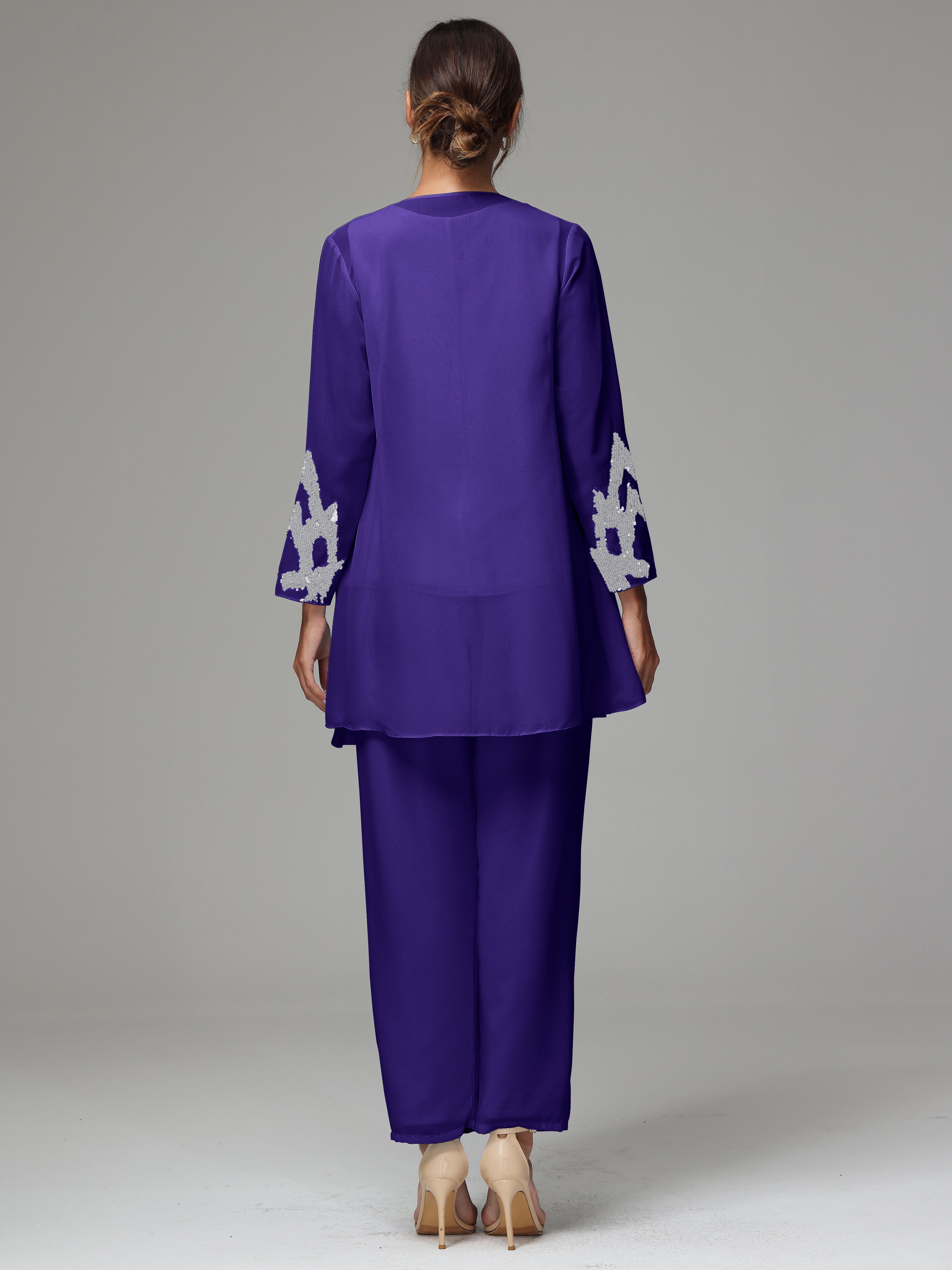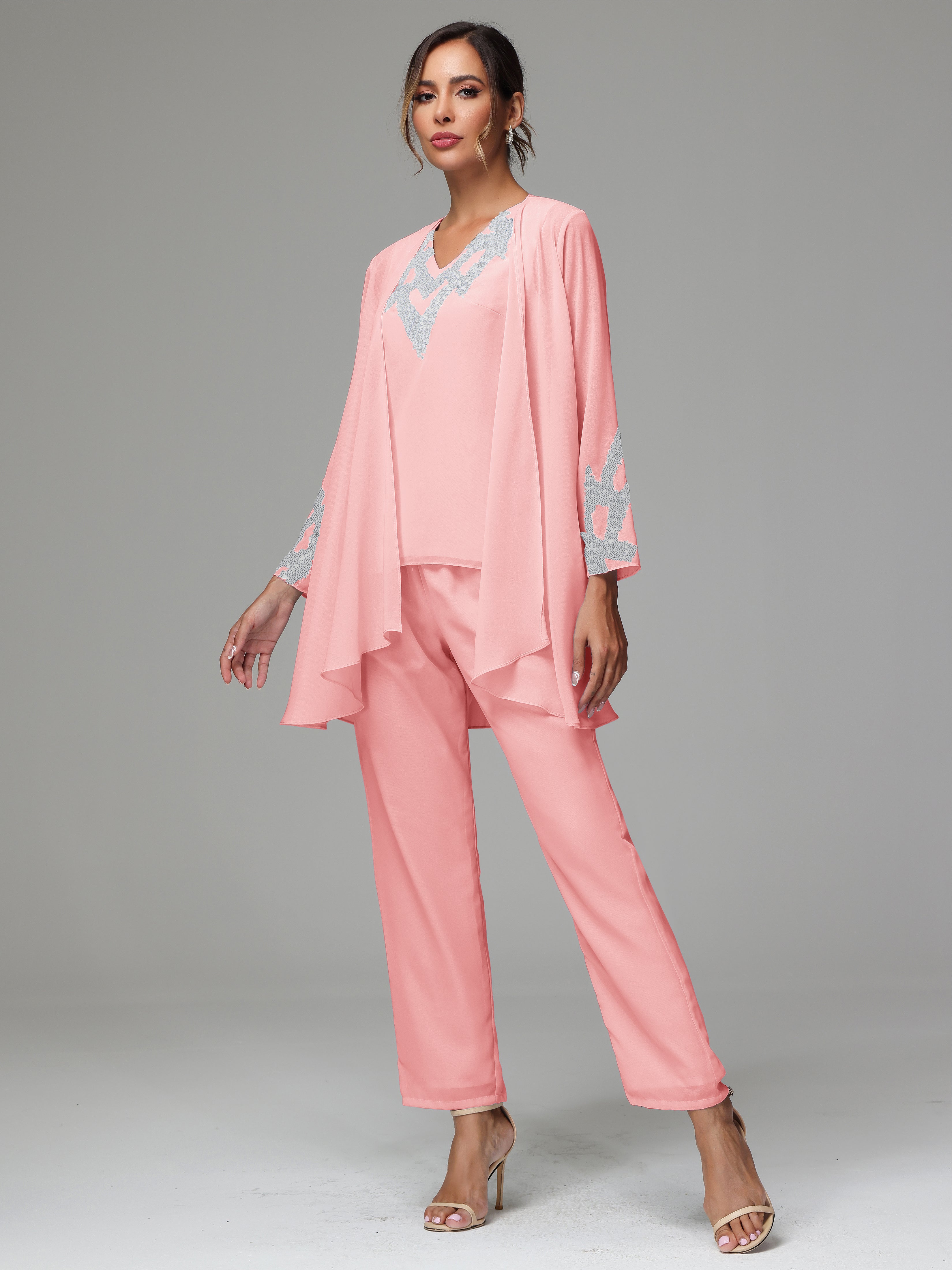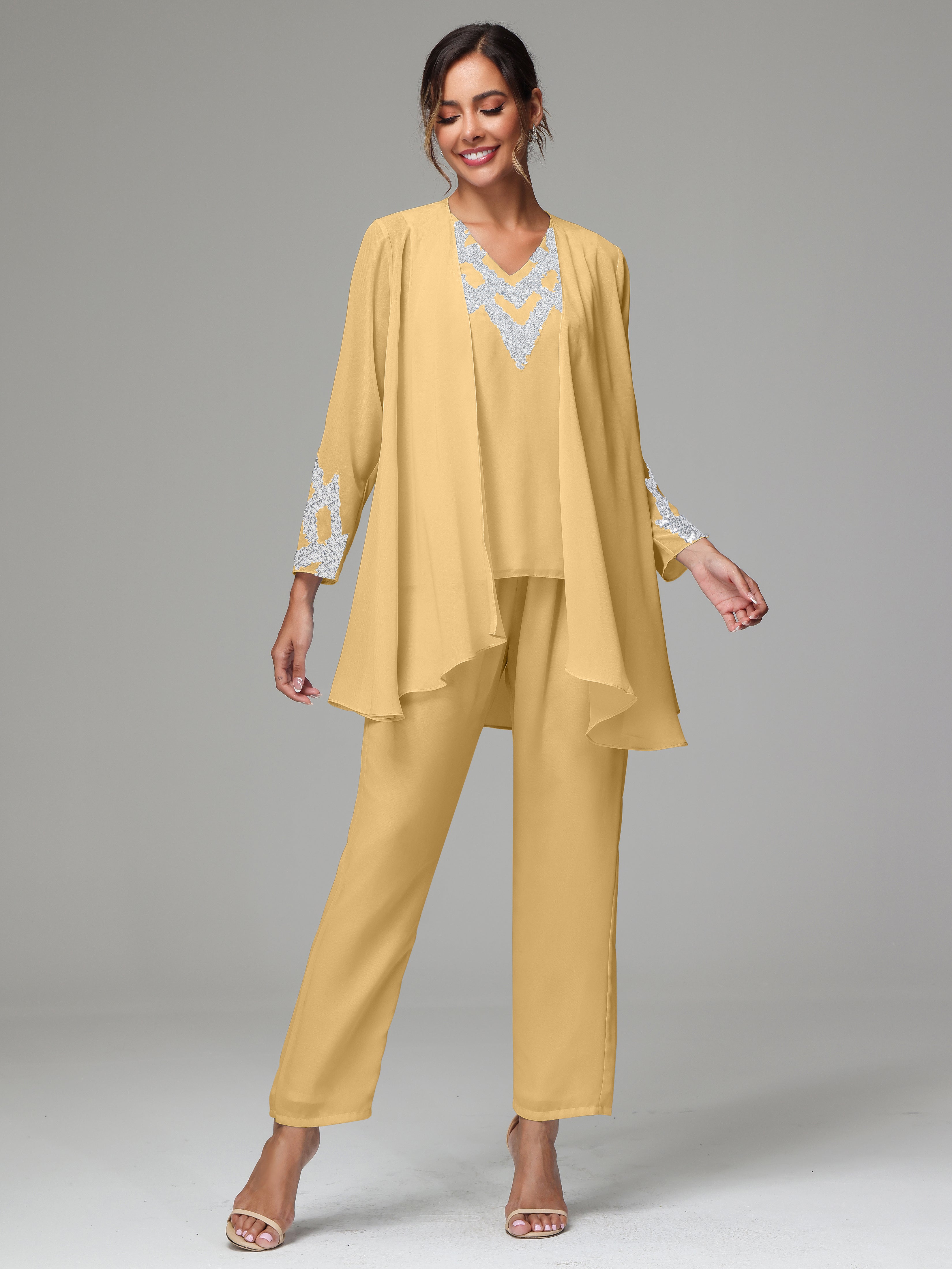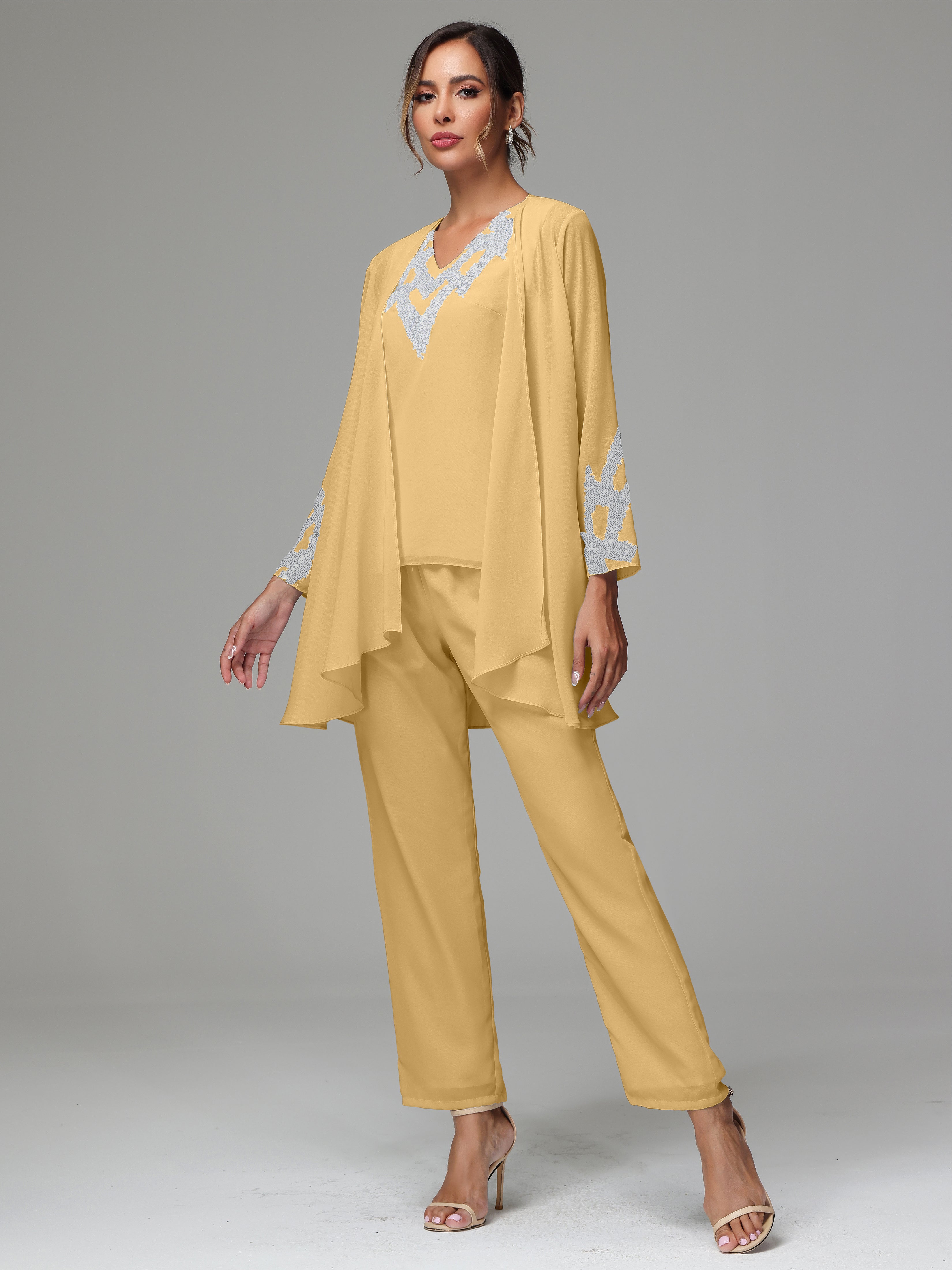 This 3 Pieces Long Sleeves Chiffon Lace Mother Of The Bride Dress Pants Suits is an exquisite ensemble crafted from high-quality chiffon and lace fabric. The set features a long-sleeve jacket, dress, and pants, all exquisitely designed to make you look and feel your best on the big day.