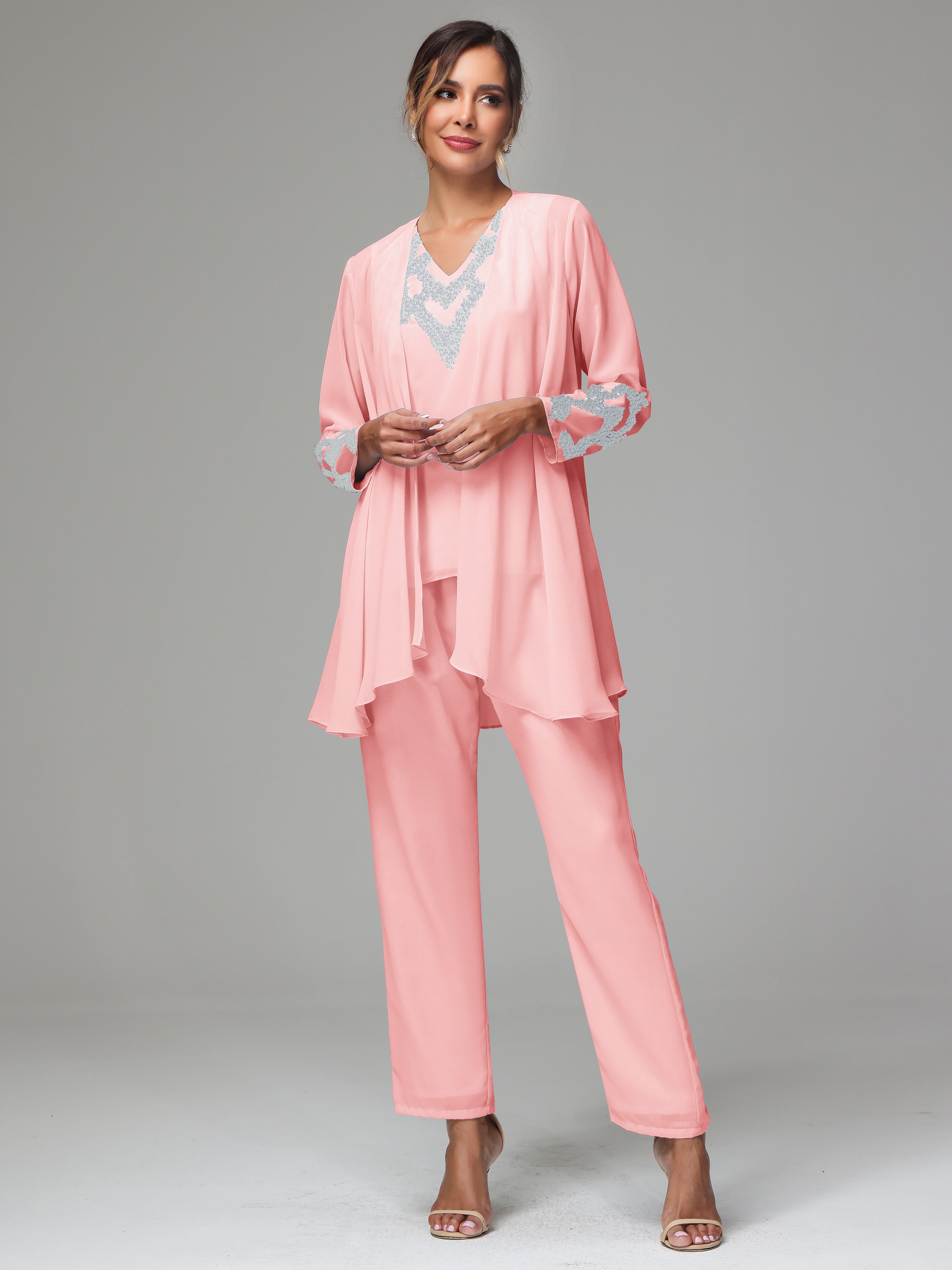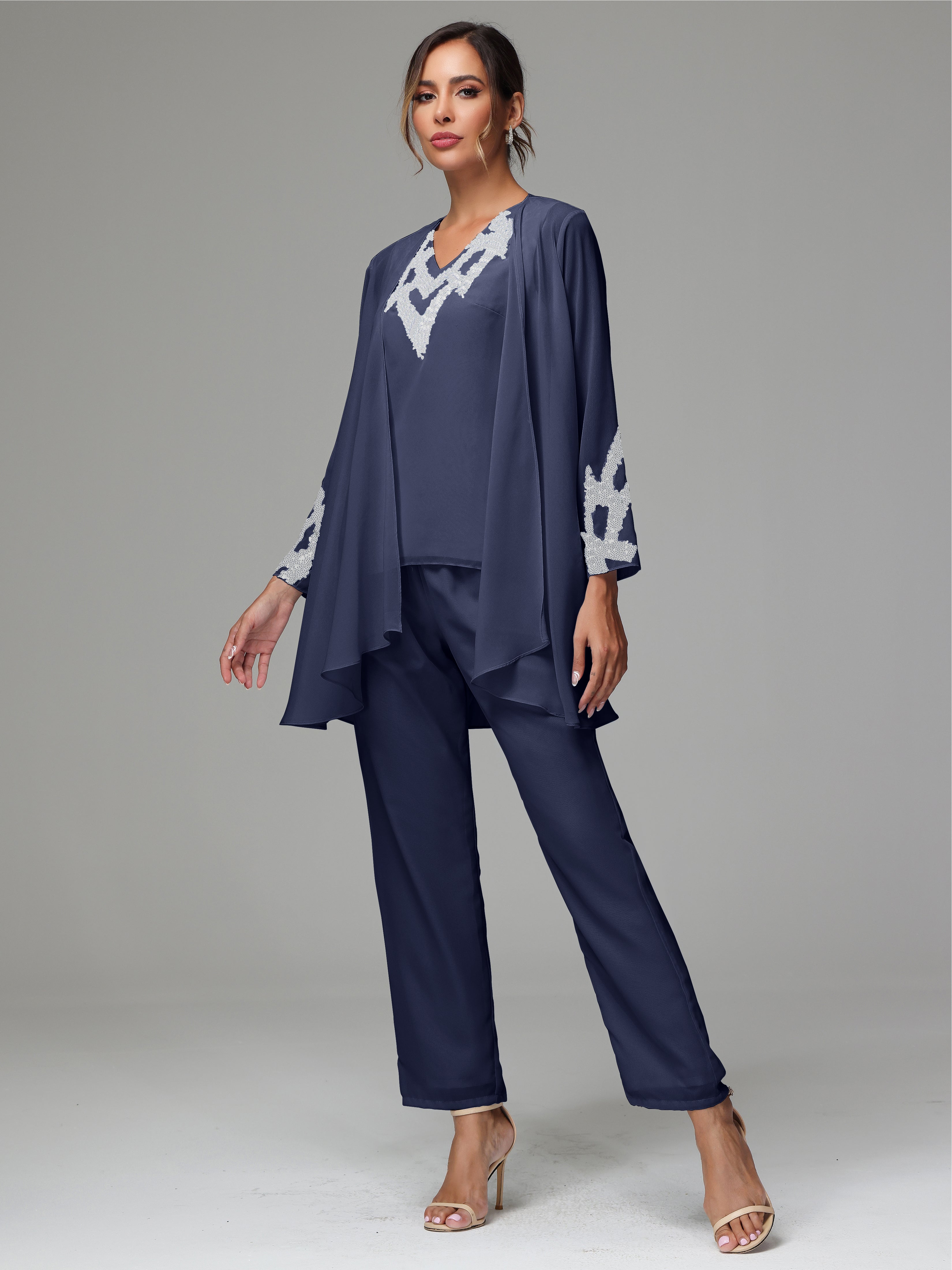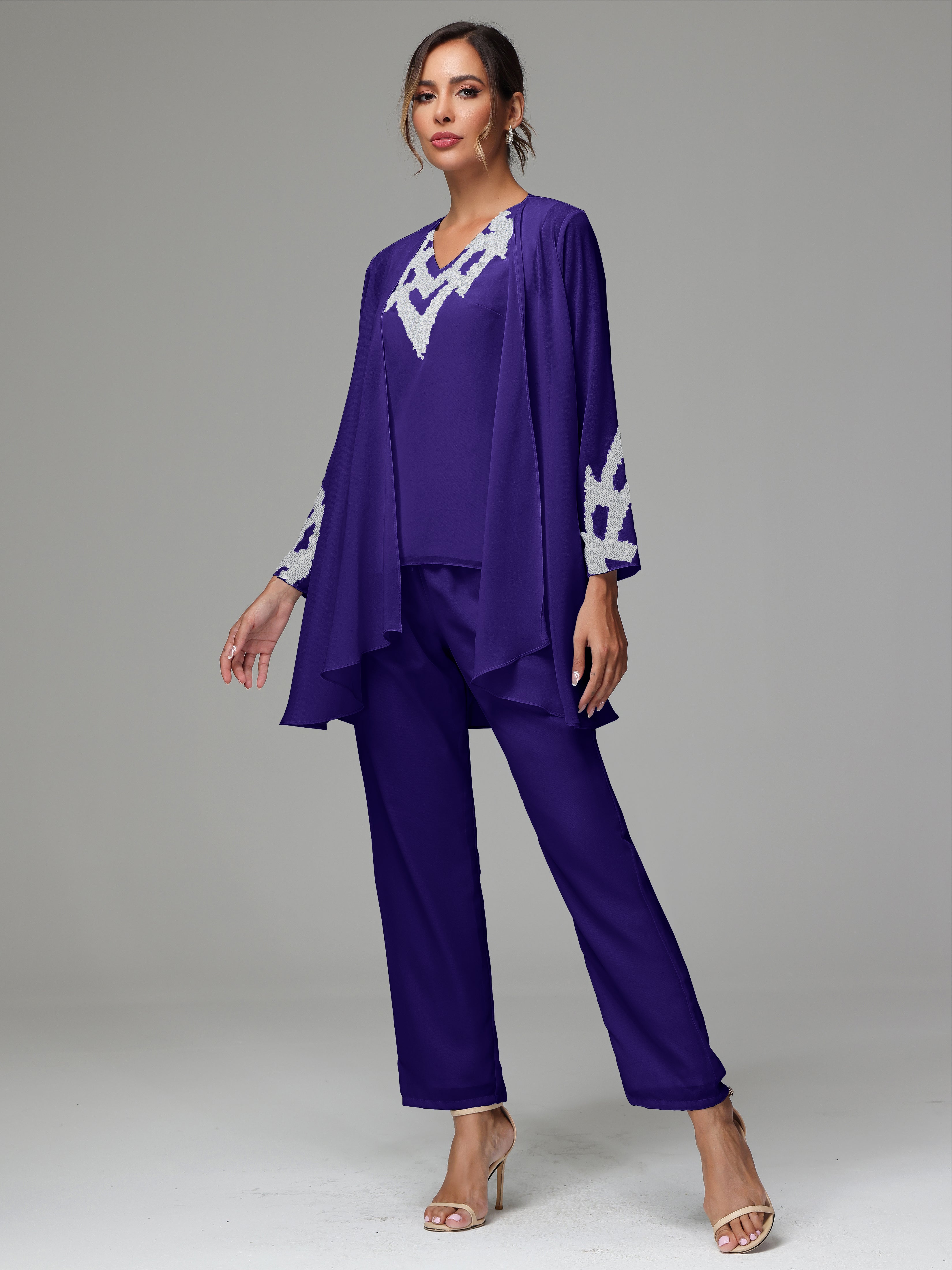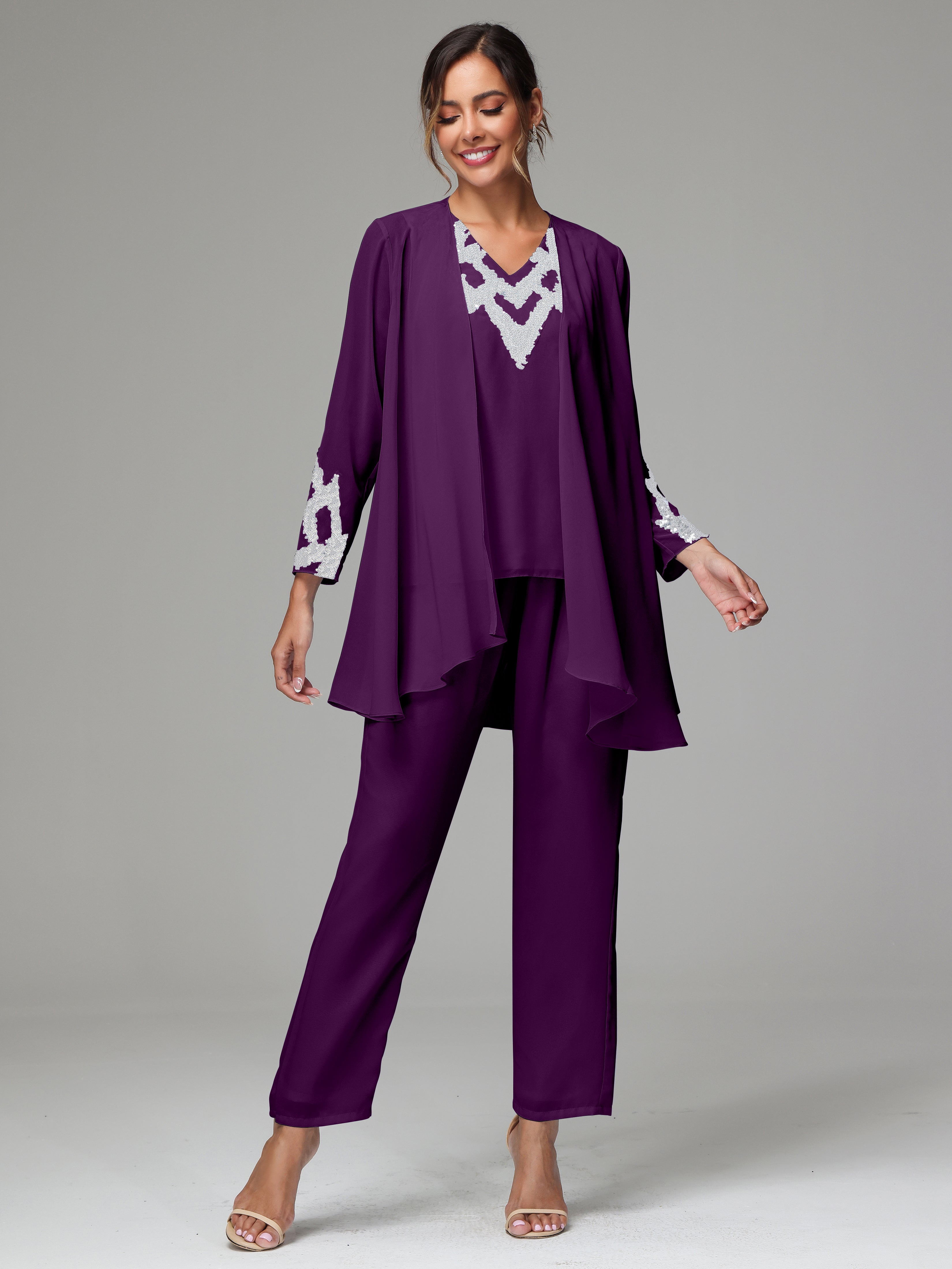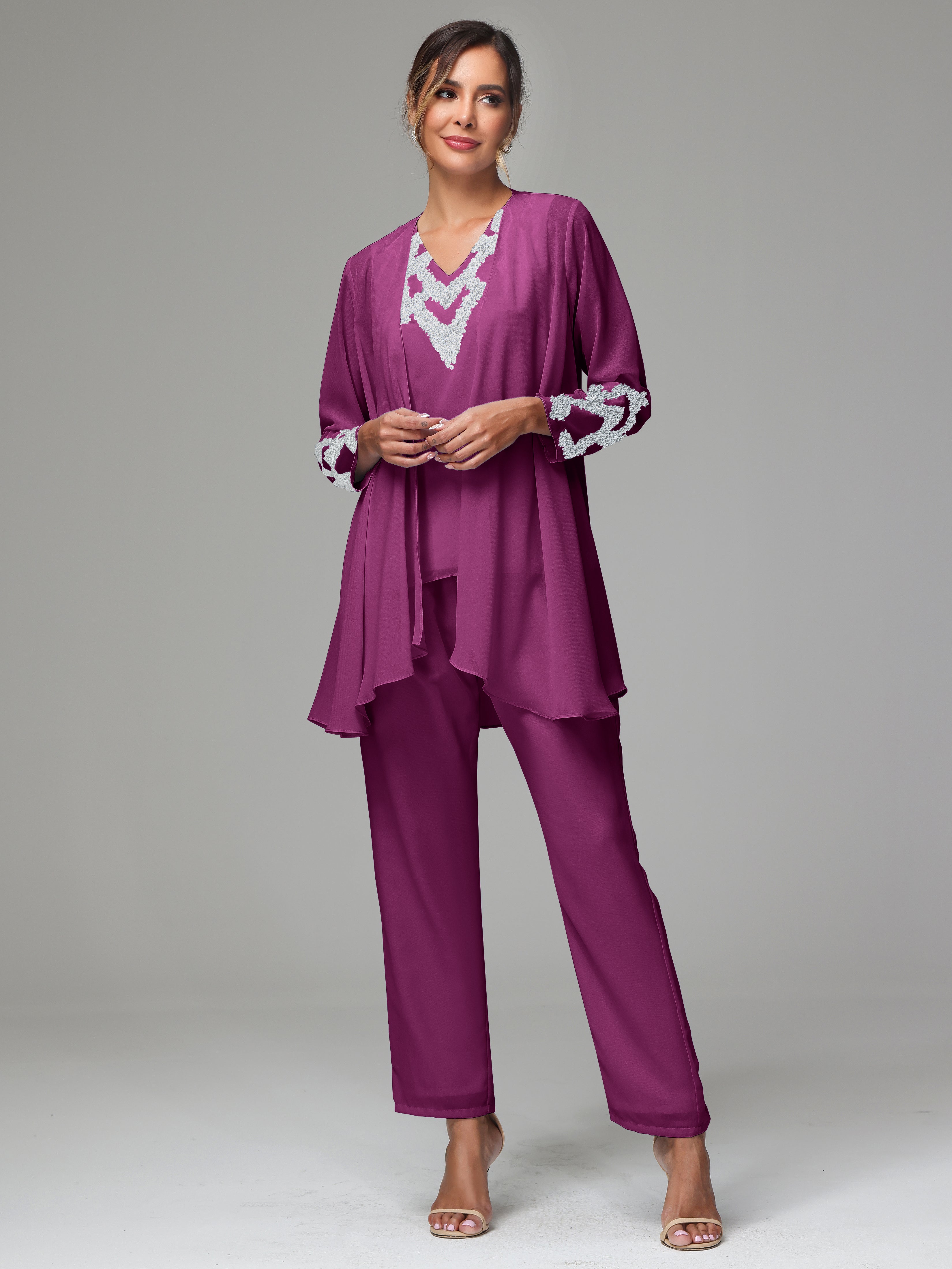 This 3 Pieces Long Sleeves Chiffon Lace Mother Of The Bride Dress Pants Suits is an exquisite ensemble crafted from high-quality chiffon and lace fabric. The set features a long-sleeve jacket, dress, and pants, all exquisitely designed to make you look and feel your best on the big day.