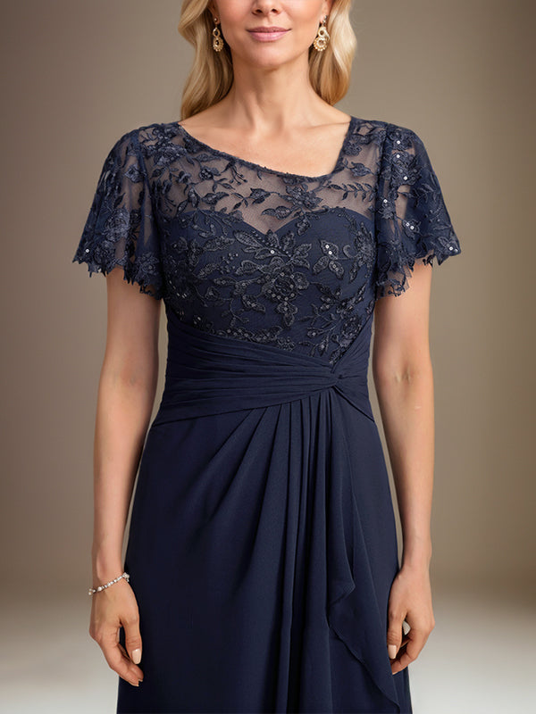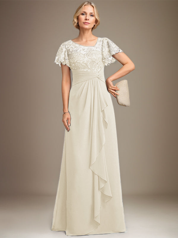 A-line Asymmetrical Illusion Floor-Length Lace Chiffon Mother of the Bride Dress With Cascading Ruffles Sequins