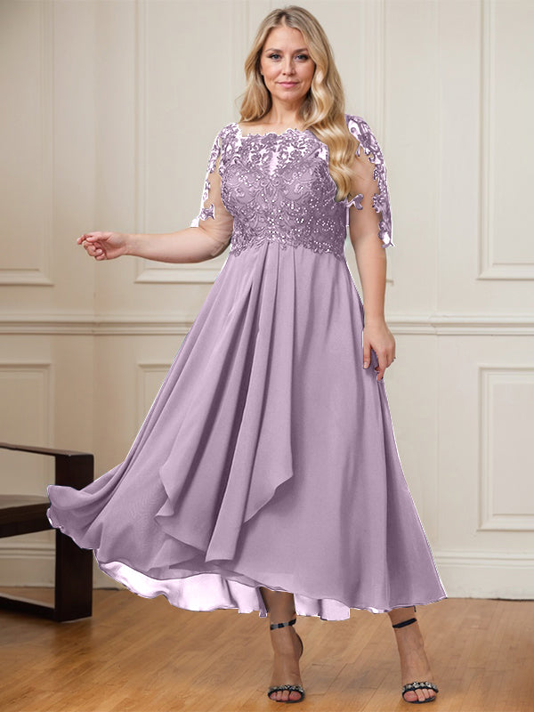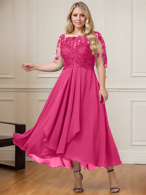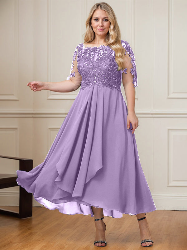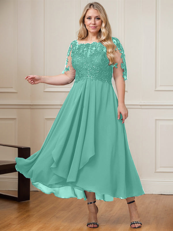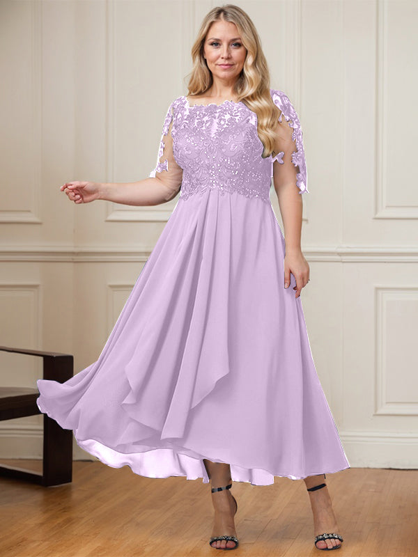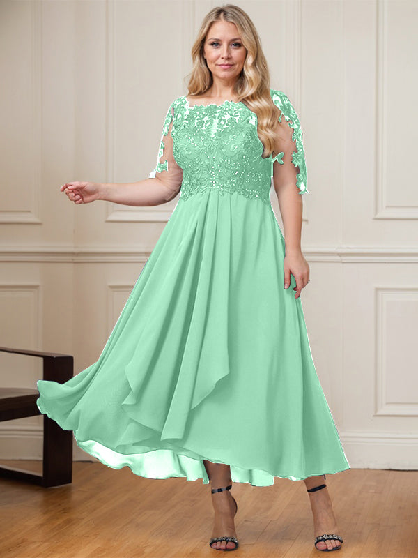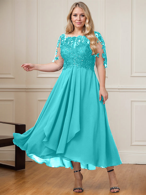 A-line Boat Neck Illusion Asymmetrical Lace Chiffon Mother of the Bride Dress With Cascading Ruffles Sequins