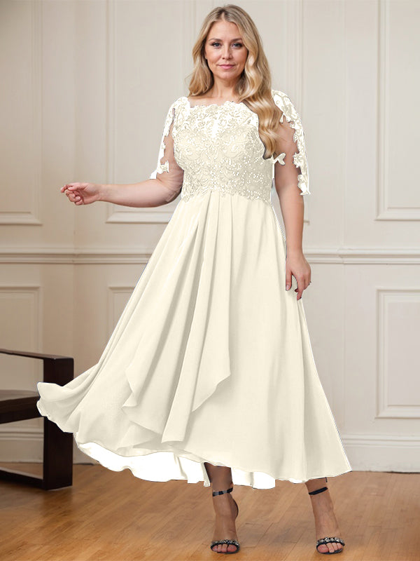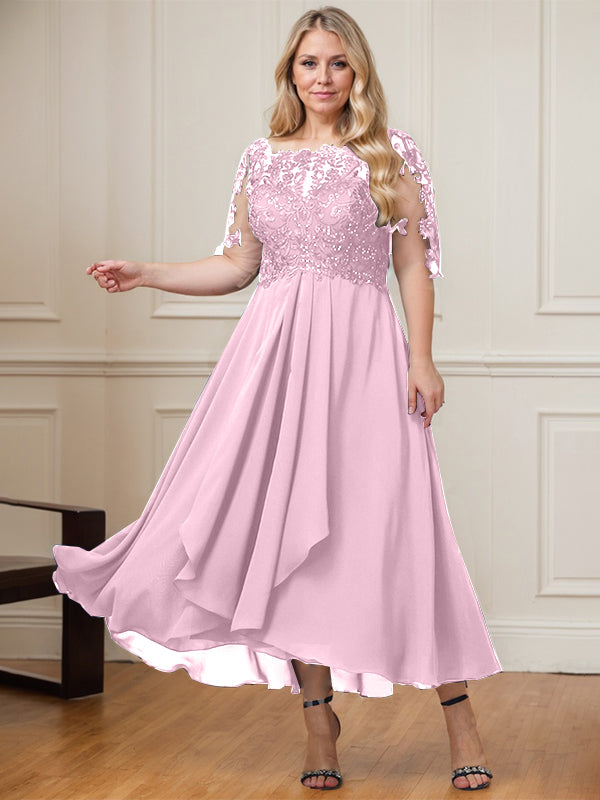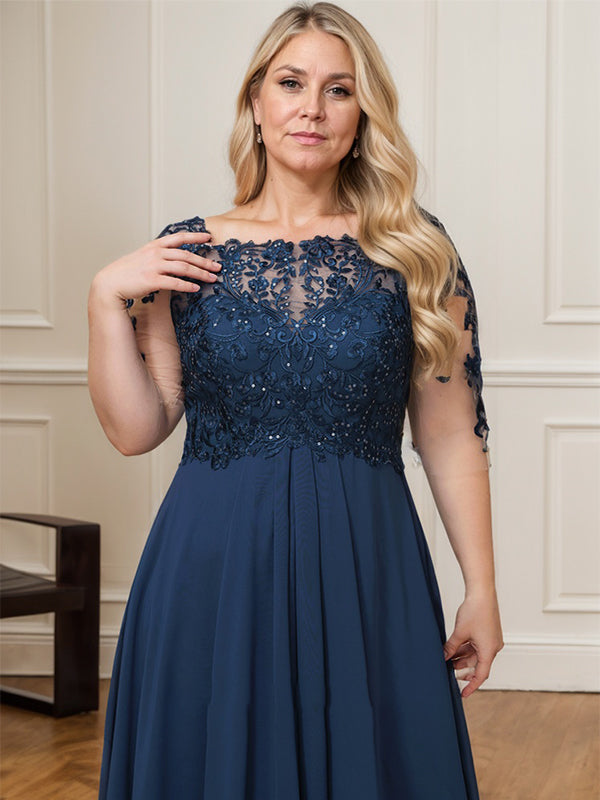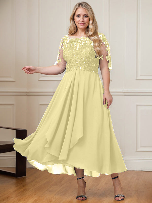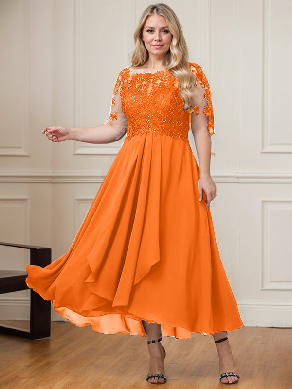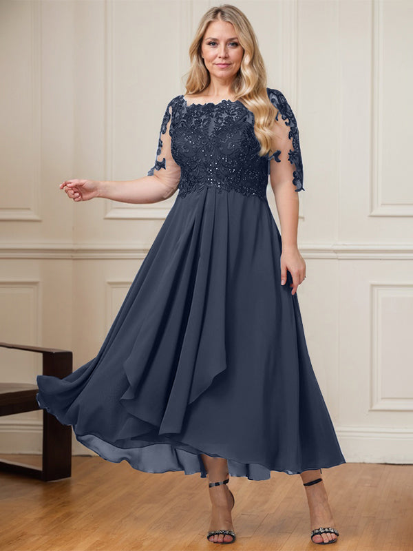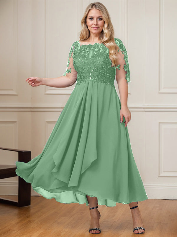 A-line Boat Neck Illusion Asymmetrical Lace Chiffon Mother of the Bride Dress With Cascading Ruffles Sequins
