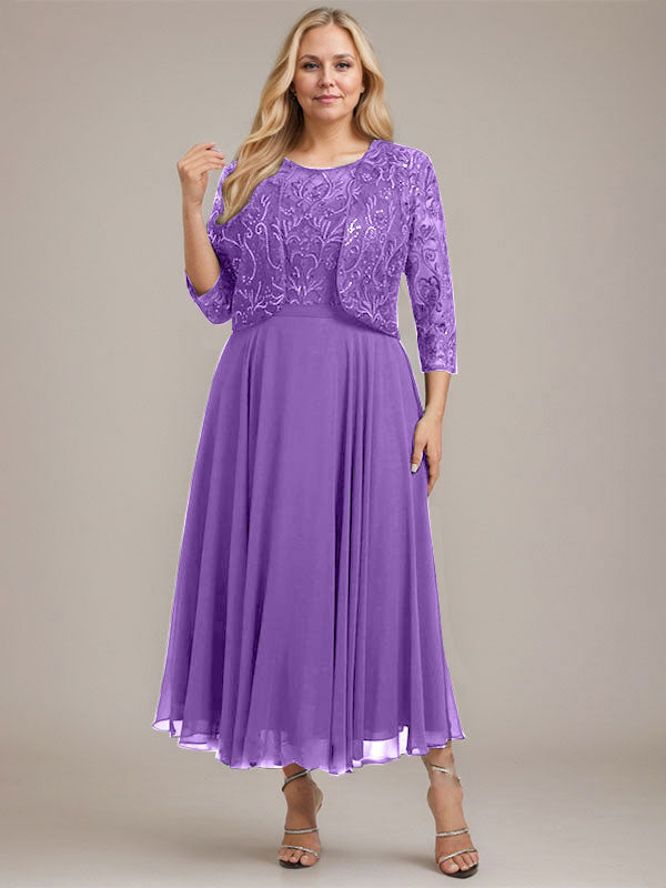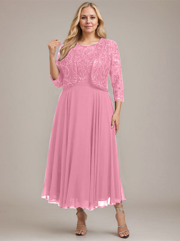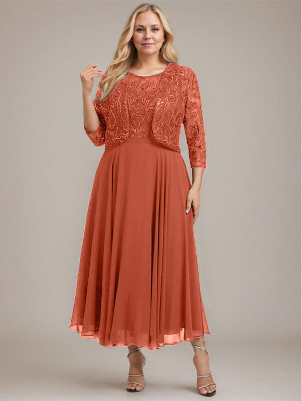 A-line Boat Neck Illusion Tea-Length Lace Chiffon Mother of the Bride Dress With Sequins