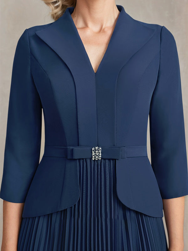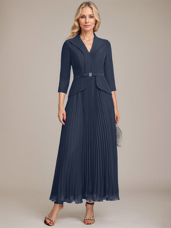 A-line Collared V-Neck Ankle-Length Chiffon Mother of the Bride Dress With Beading Pleated