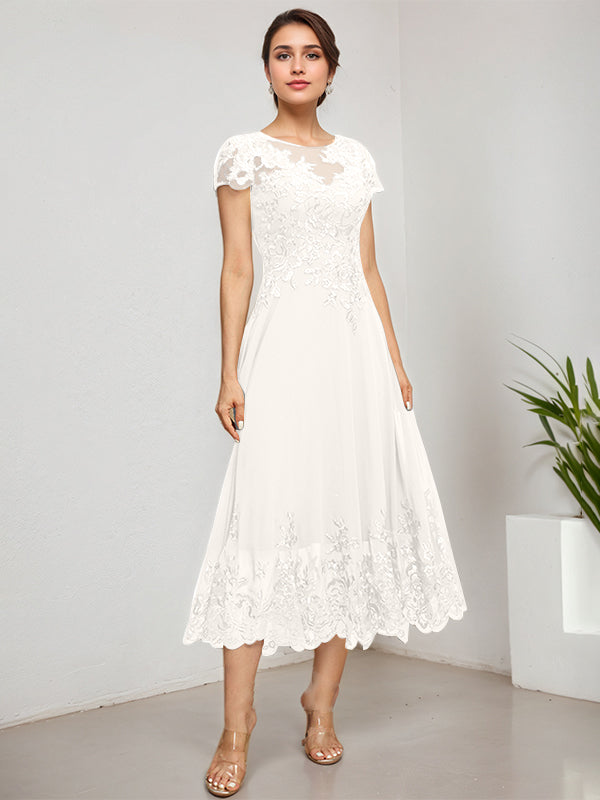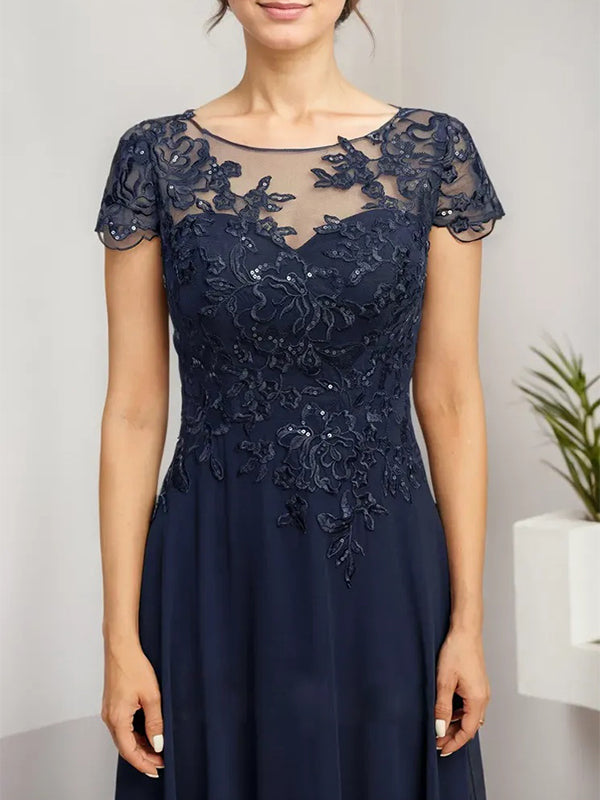 A-line Scoop Illusion Tea-Length Lace Chiffon Mother of the Bride Dress With Sequins