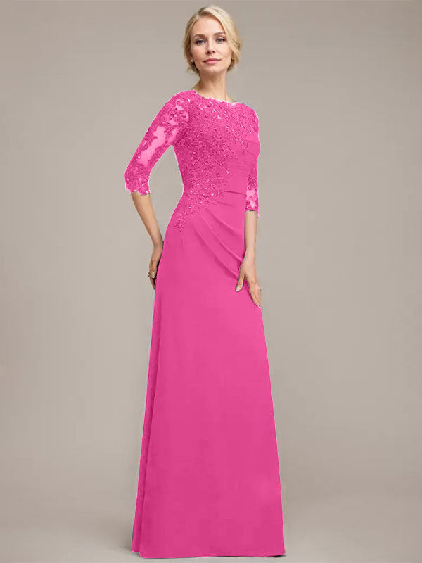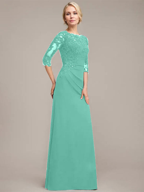 A-line Scoop Floor-Length Chiffon Lace Mother of the Bride Dress With Sequins Beading Pleated