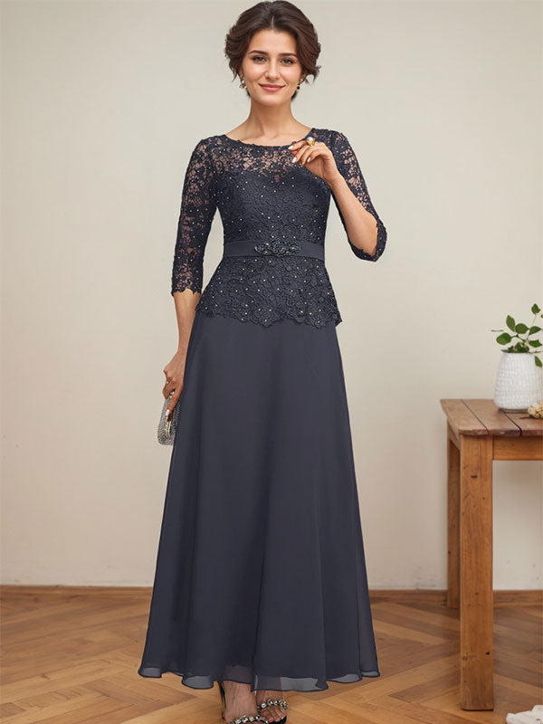 A-line Scoop Illusion Ankle-Length Chiffon Lace Mother of the Bride Dress With Rhinestone Beading
