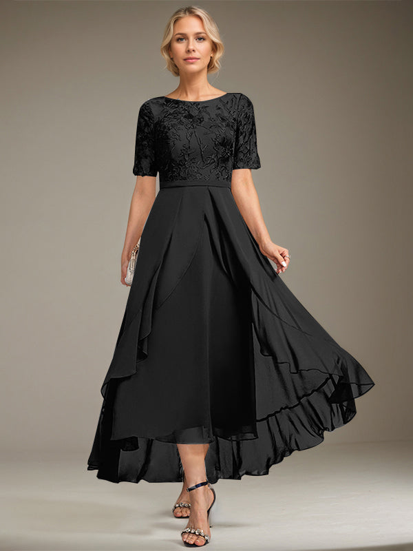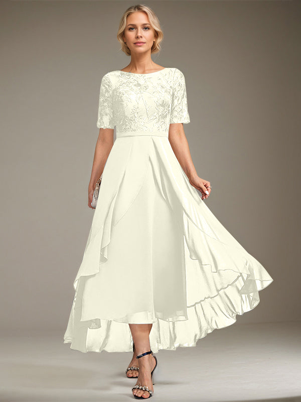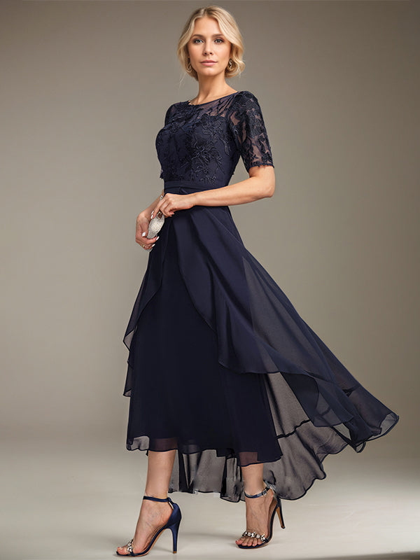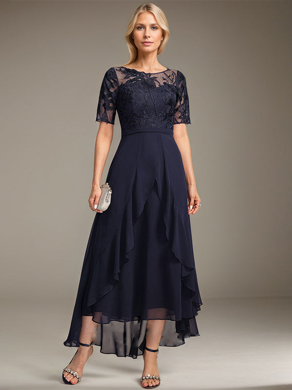 A-line Scoop Illusion Asymmetrical Lace Chiffon Mother of the Bride Dress