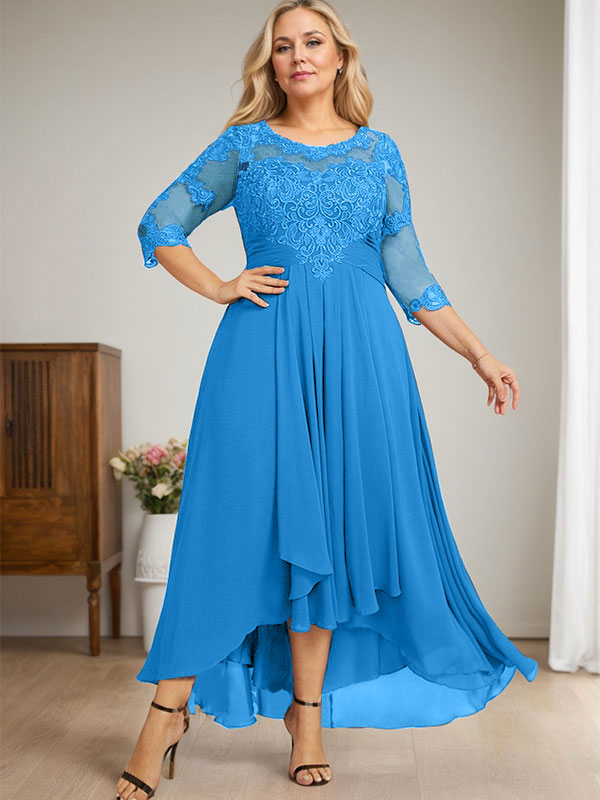 A-line Scoop Illusion Asymmetrical Lace Chiffon Mother of the Bride Dress With Cascading Ruffles