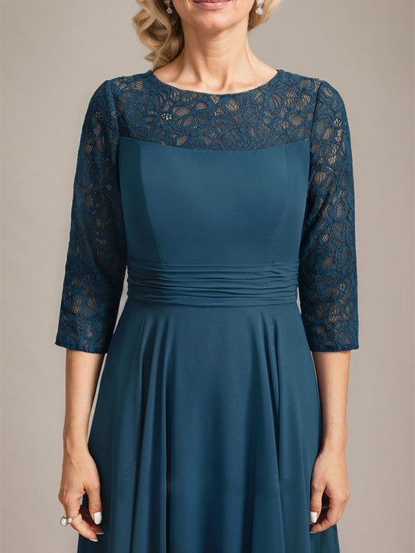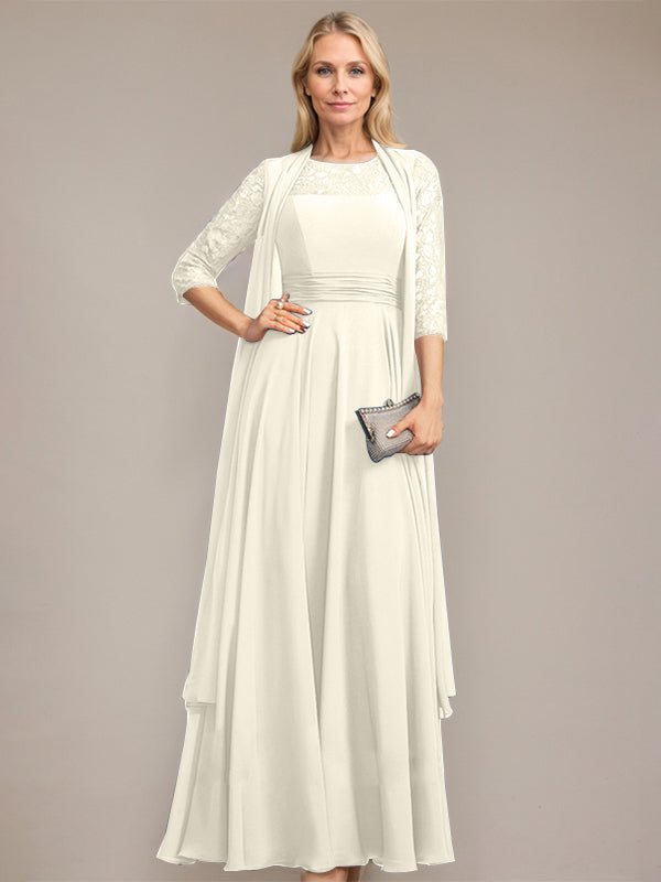 A-line Scoop Illusion Floor-Length Lace Chiffon Mother of the Bride Dress With Pleated