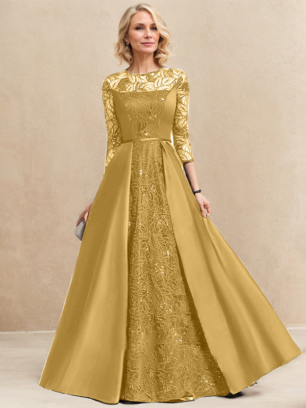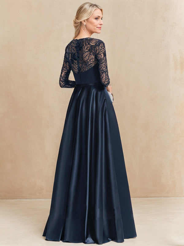 A-line Scoop Illusion Floor-Length Satin Lace Mother of the Bride Dress With Sequins