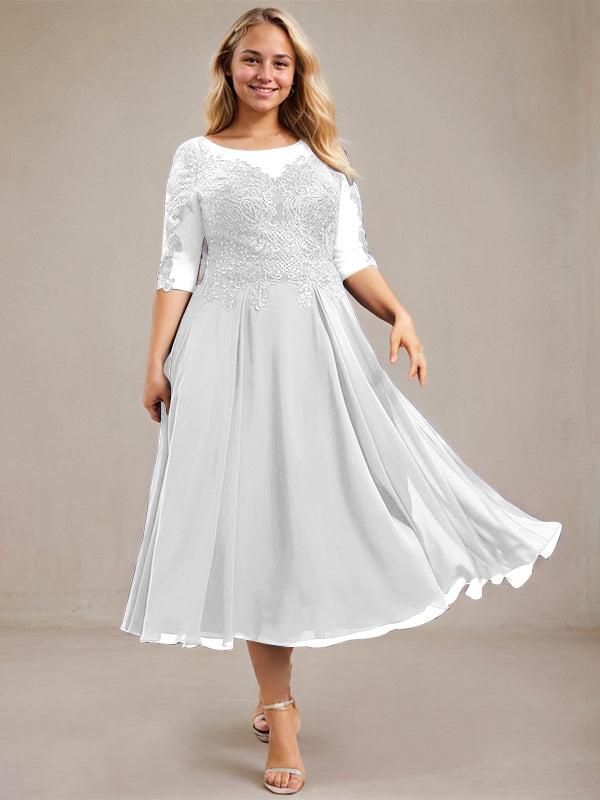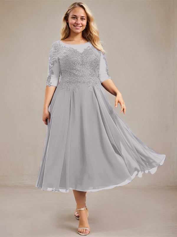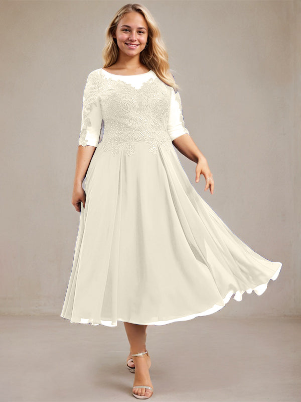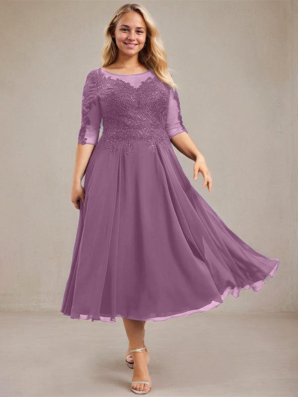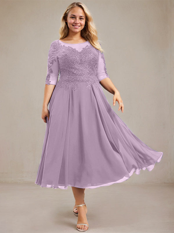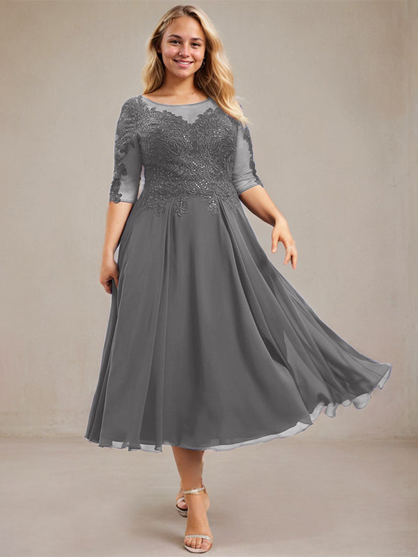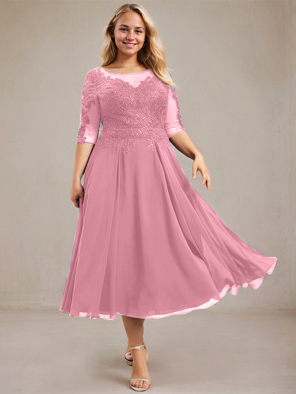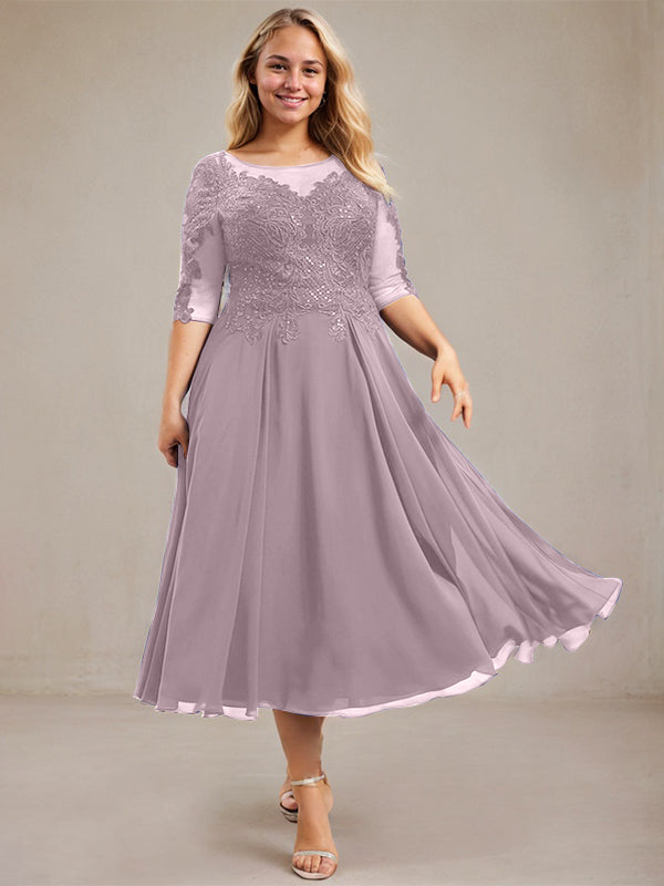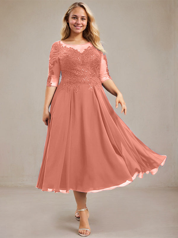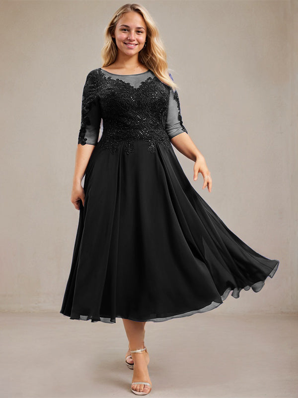 A-line Scoop Illusion Tea-Length Lace Chiffon Mother of the Bride Dress With Sequins
