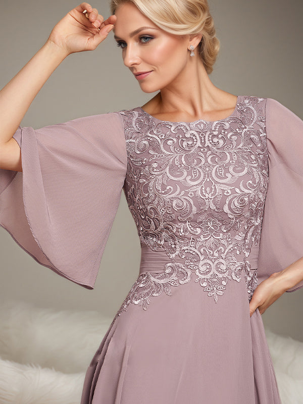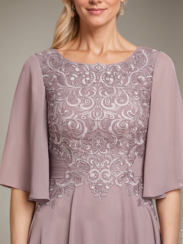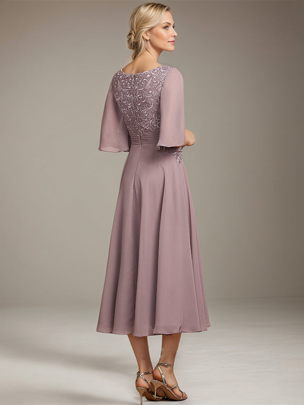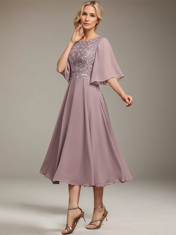 A-line Scoop Tea-Length Lace Chiffon Mother of the Bride Dress