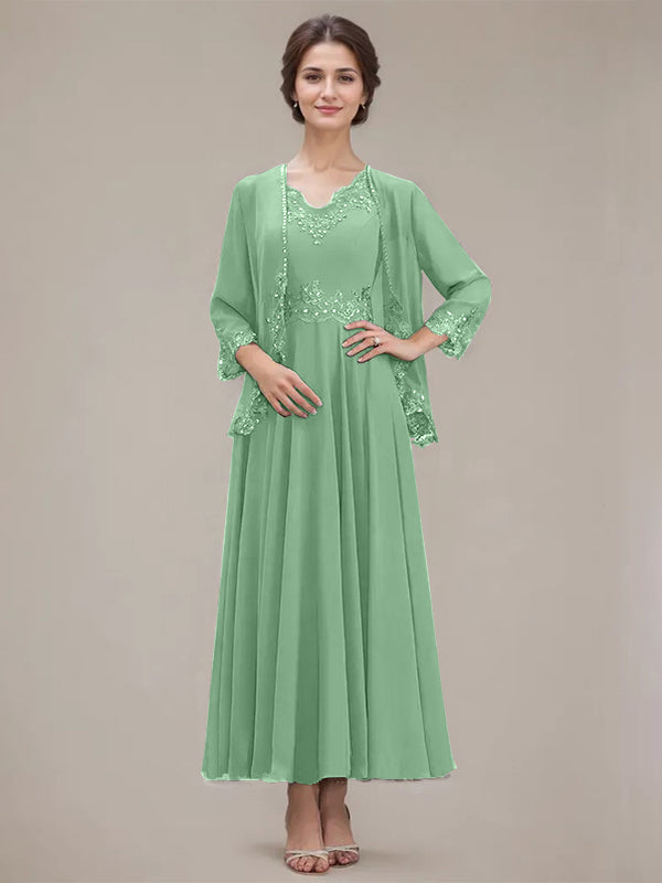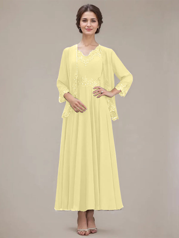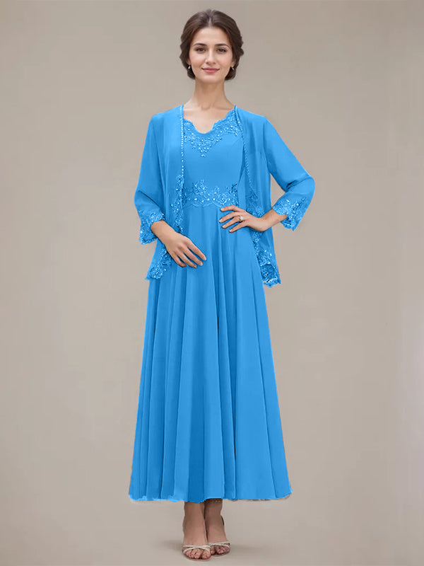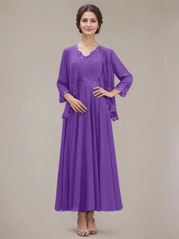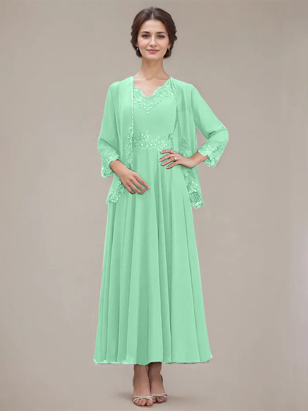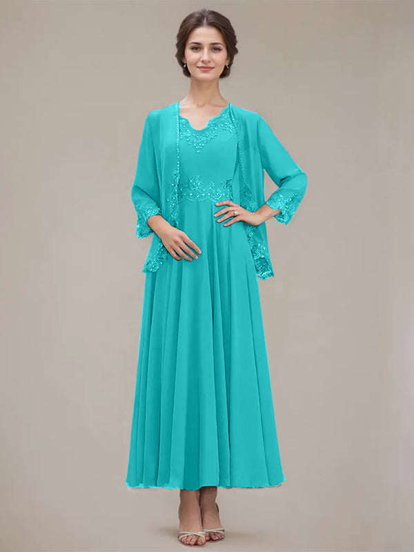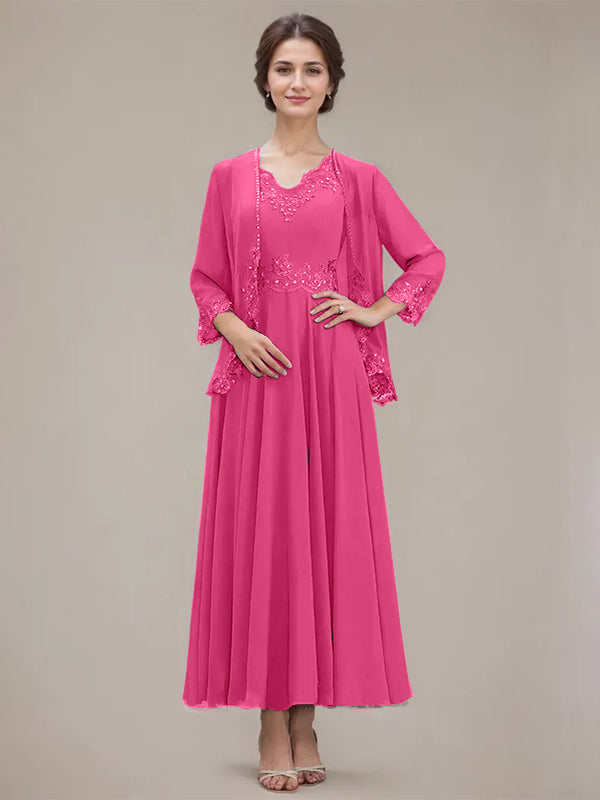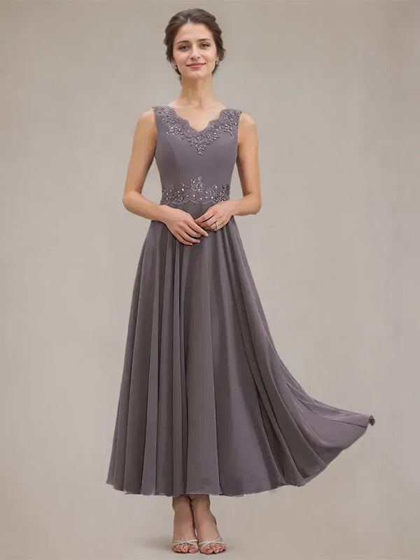 A-line V-Neck Ankle-Length Chiffon Mother of the Bride Dress With Sequins Appliques Lace Beading