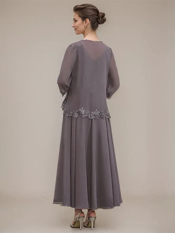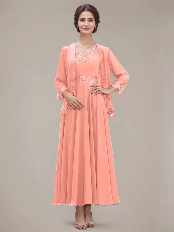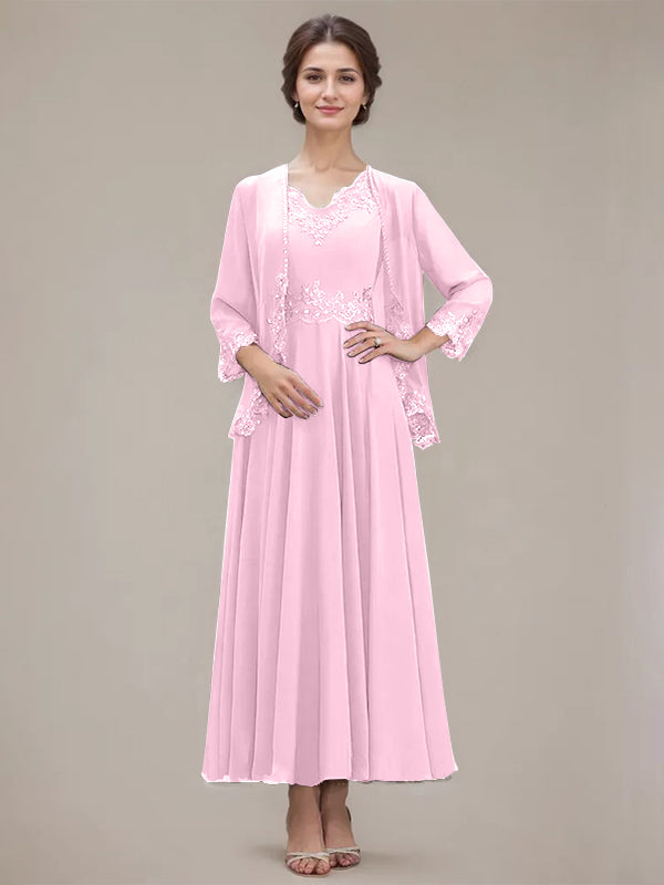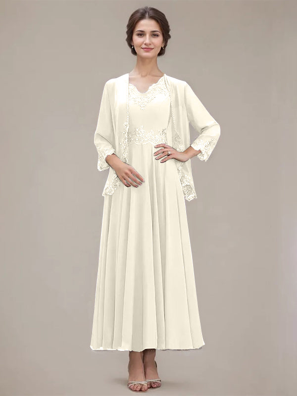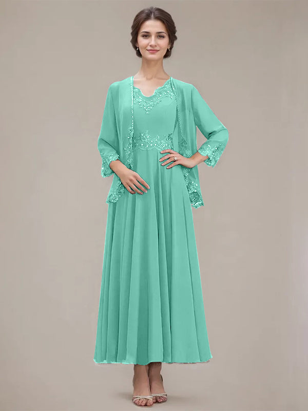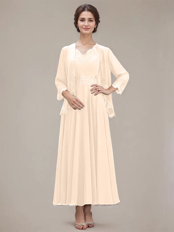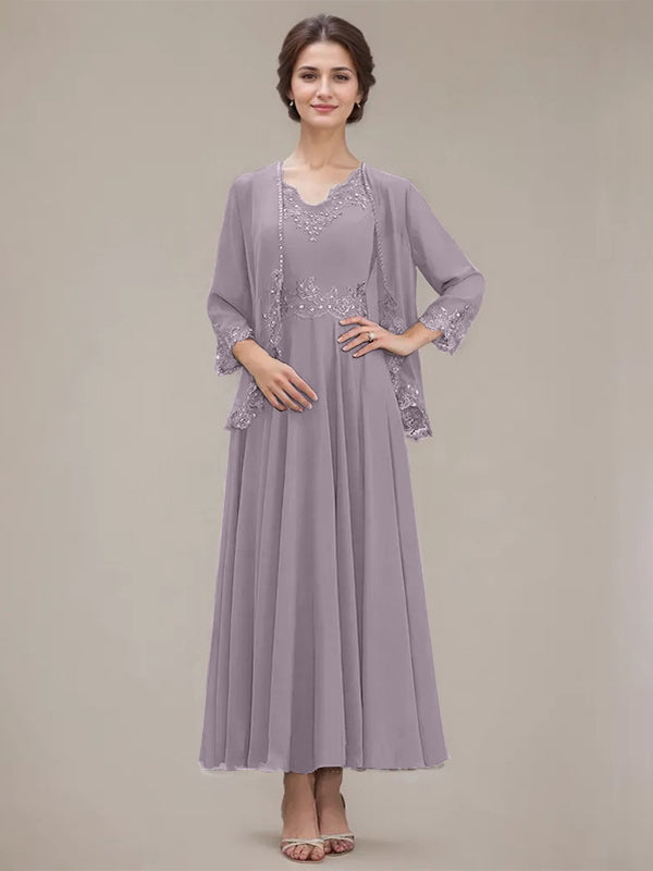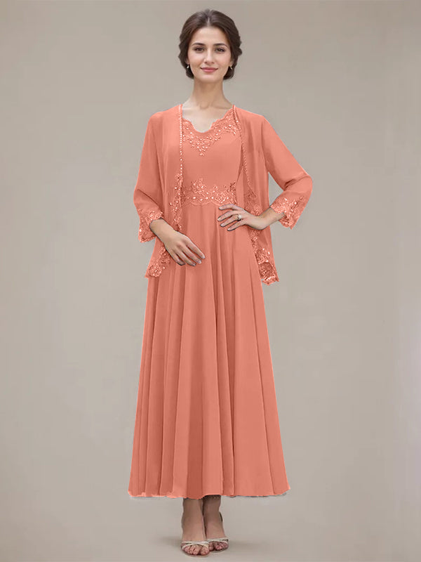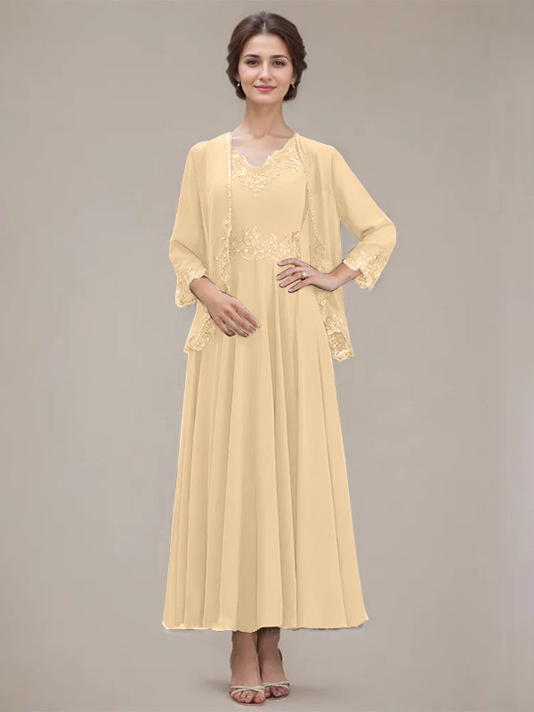 A-line V-Neck Ankle-Length Chiffon Mother of the Bride Dress With Sequins Appliques Lace Beading