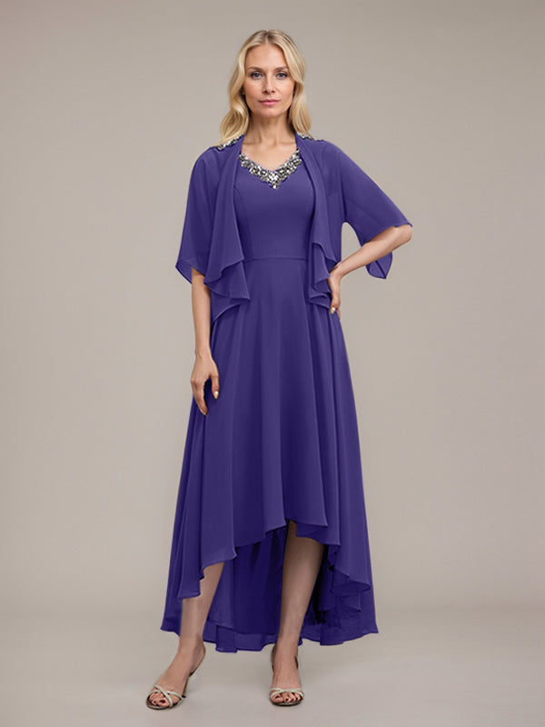 A-line V-Neck Asymmetrical Chiffon Mother of the Bride Dress With Beading Sequins