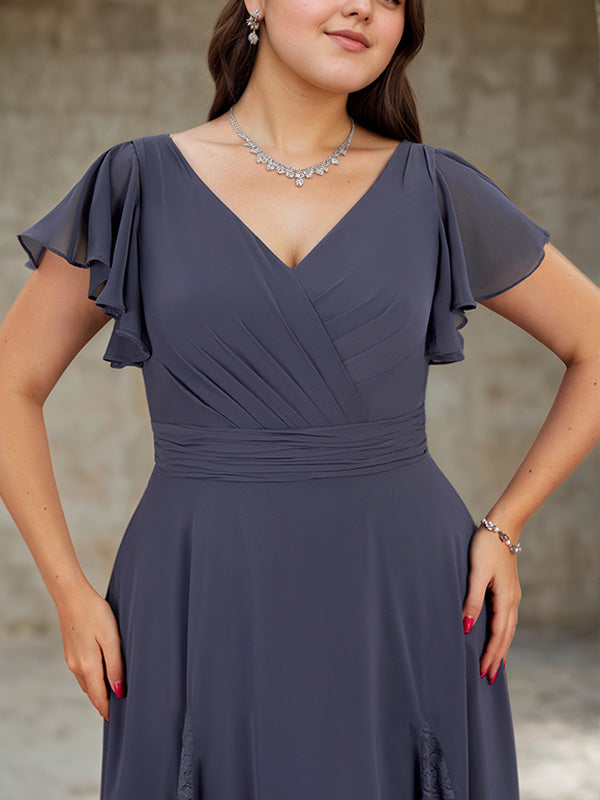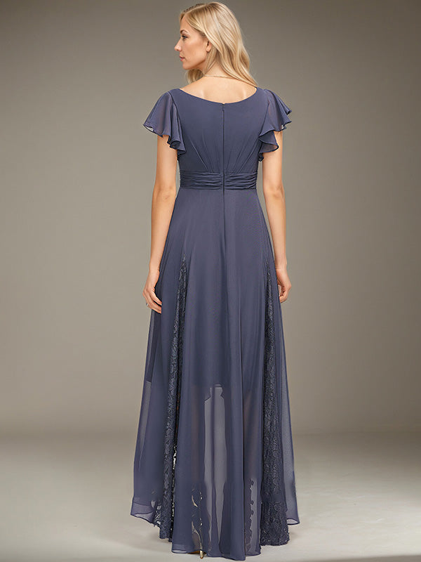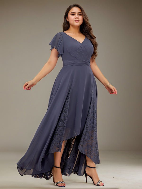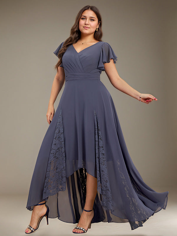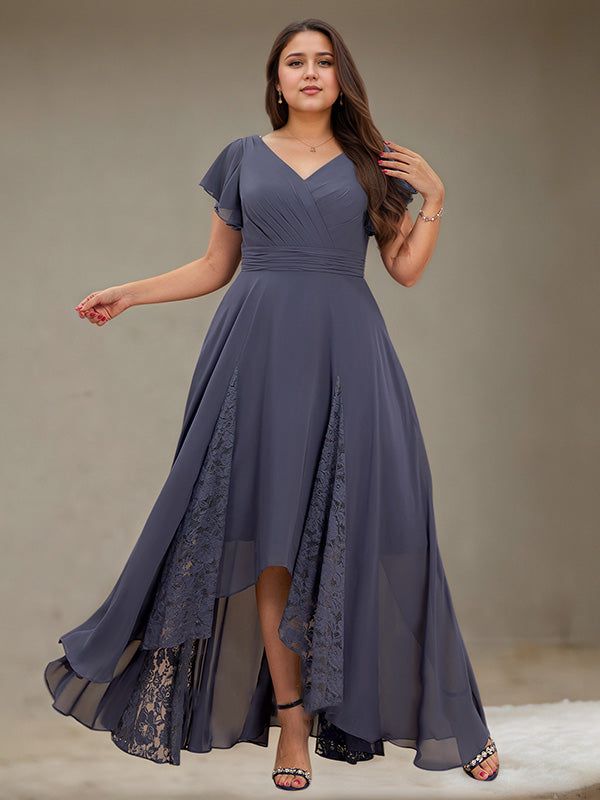 A-line V-Neck Asymmetrical Lace Chiffon Cocktail Dress With Pleated