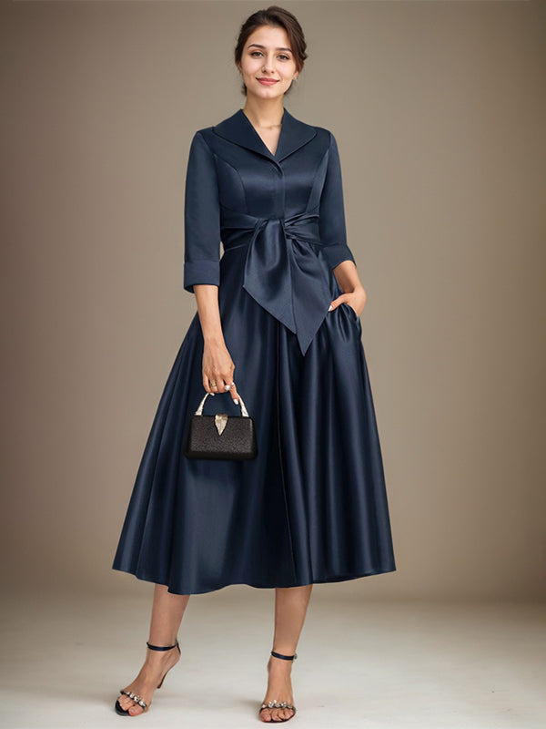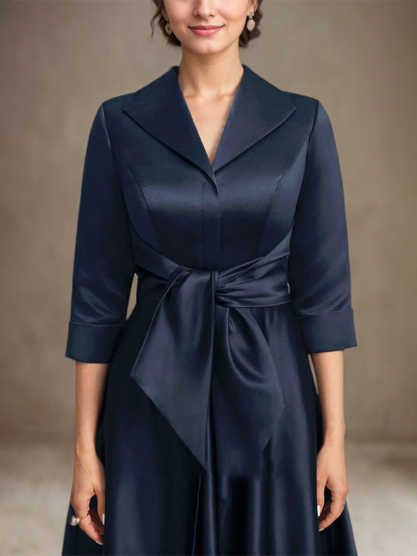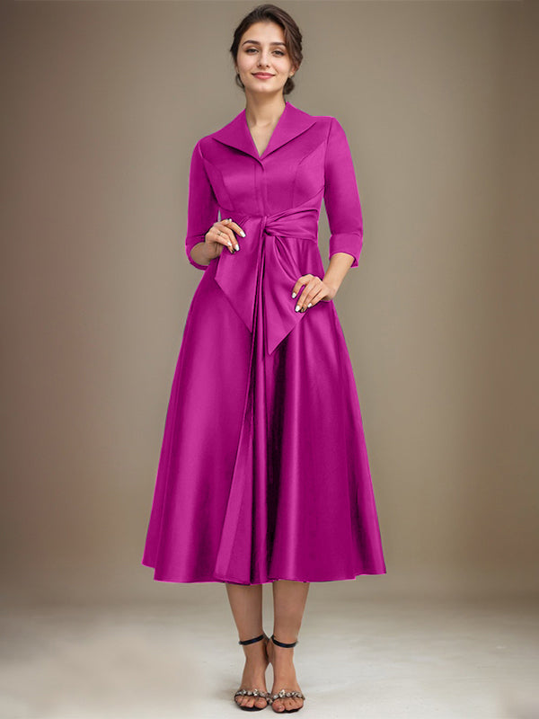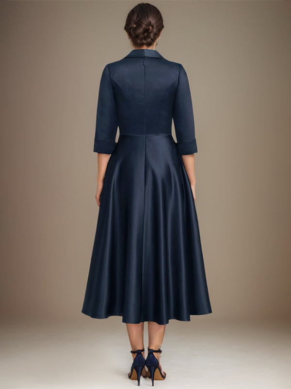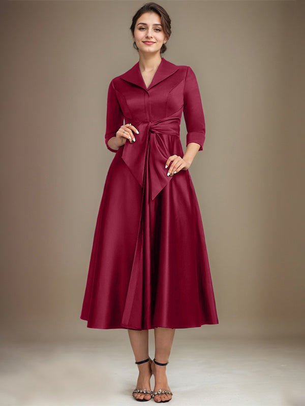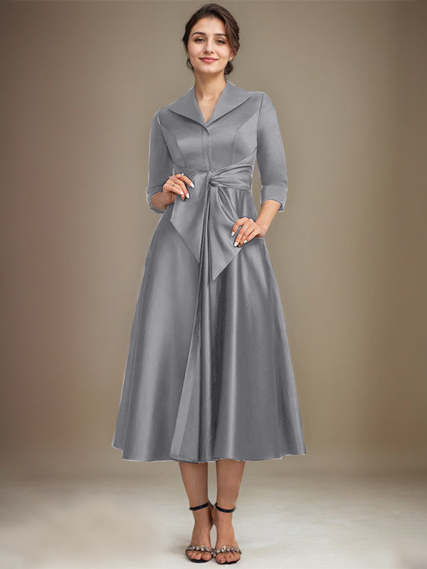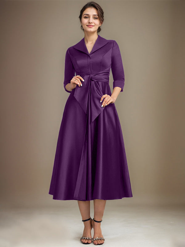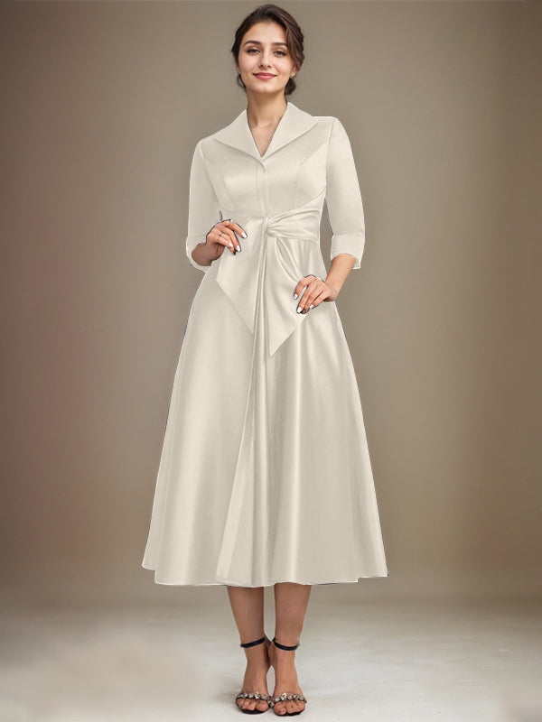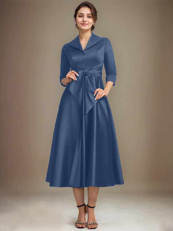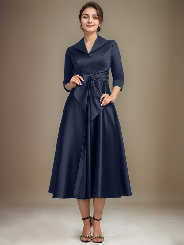 A-line V-Neck Collared Tea-Length Satin Mother of the Bride Dress