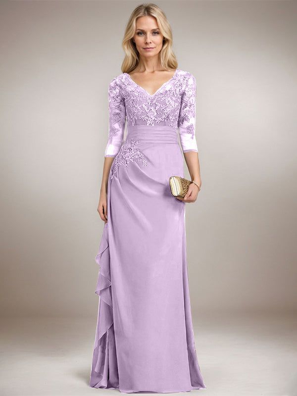 A-line V-Neck Floor-Length Lace Chiffon Mother of the Bride Dress With Cascading Ruffles