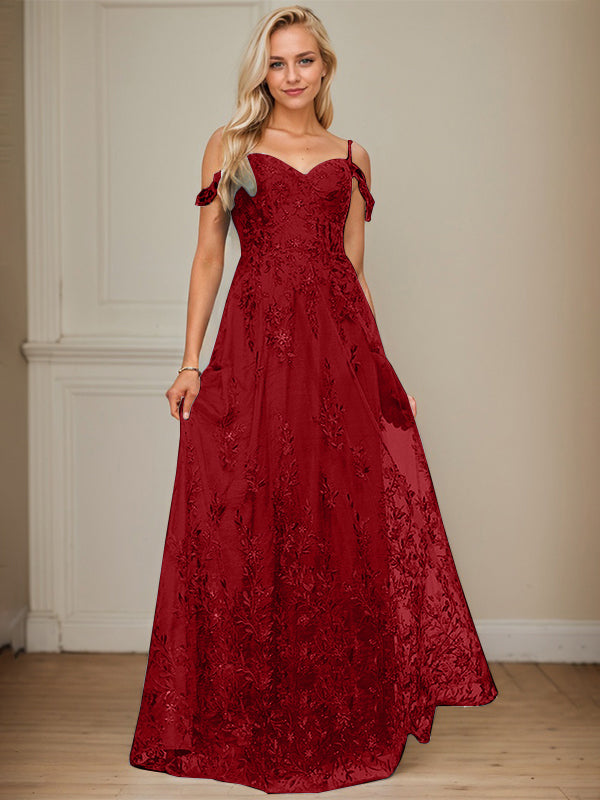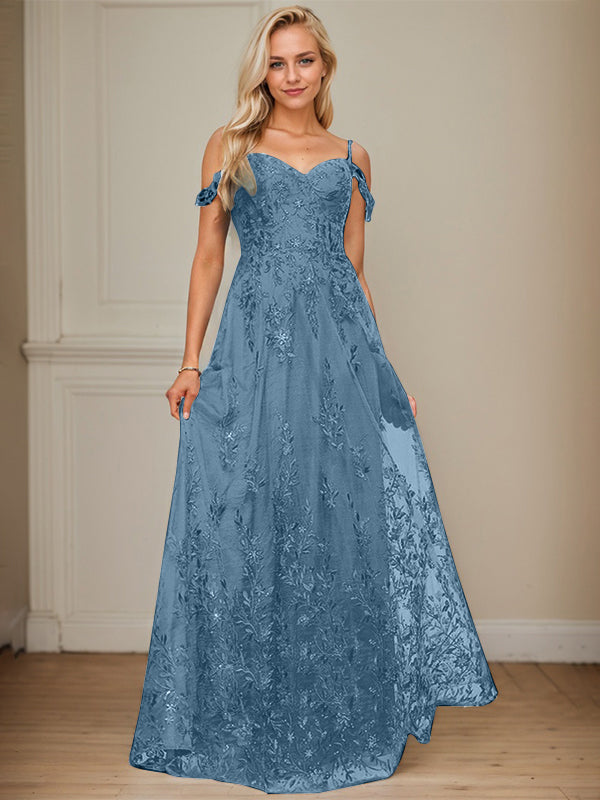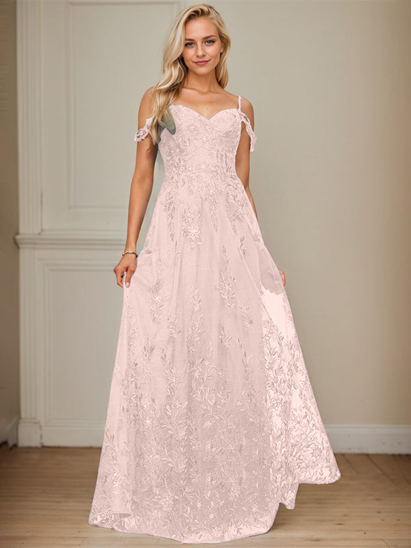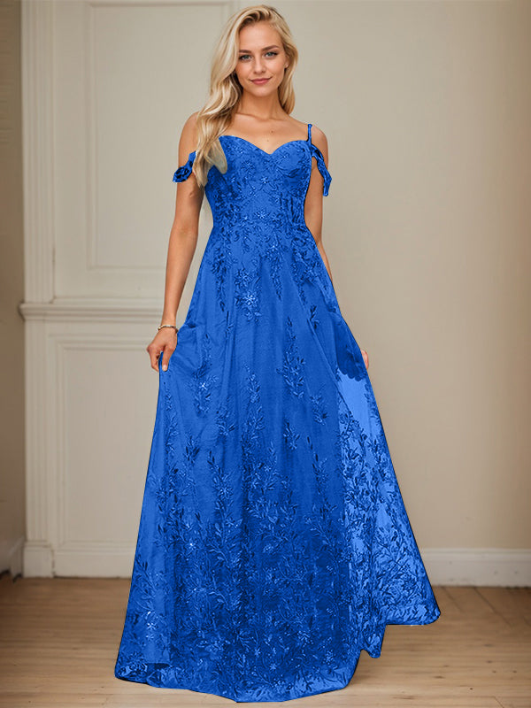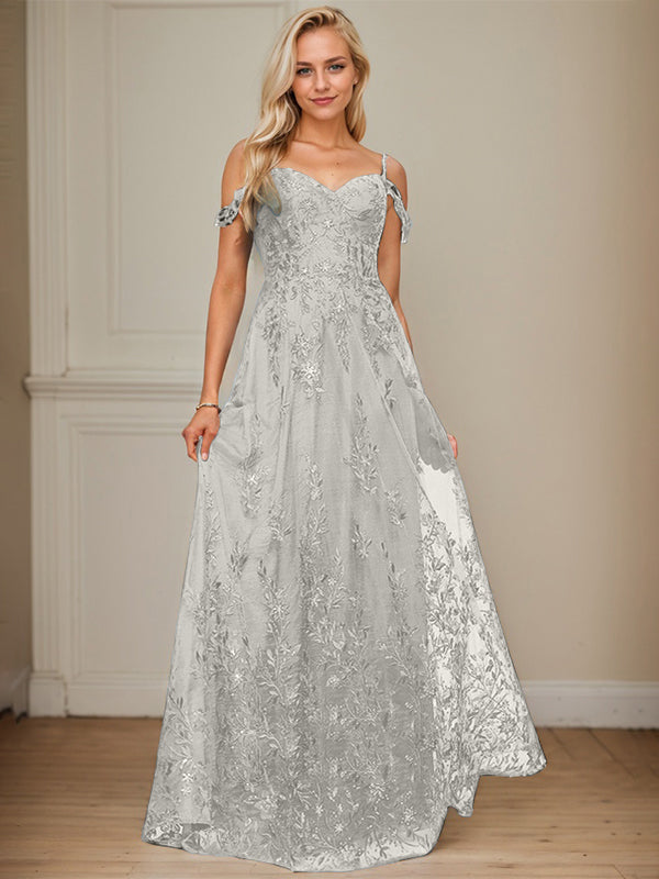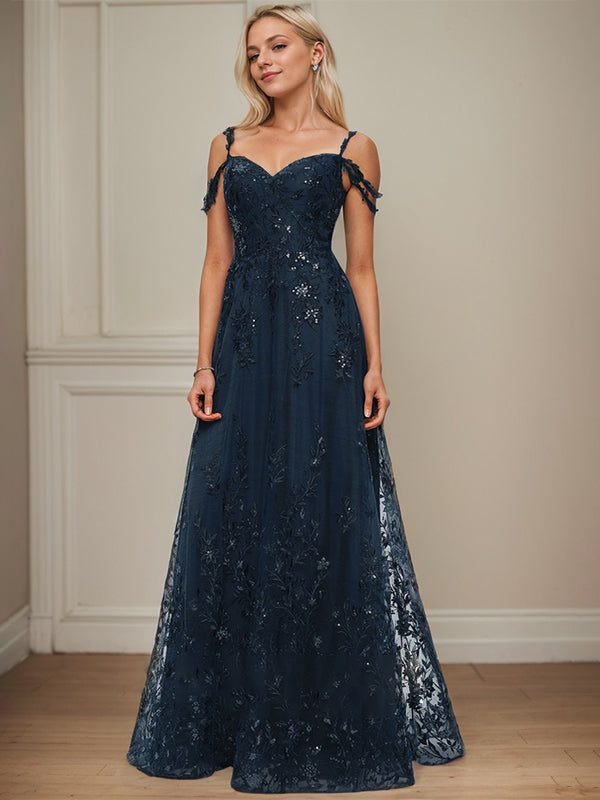 A-line V-Neck Floor-Length Lace Prom Dresses With Sequins