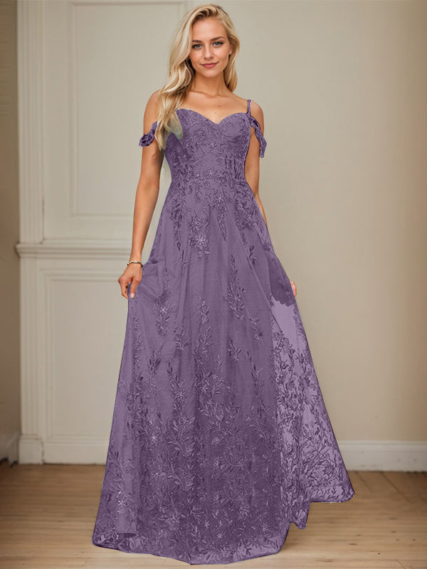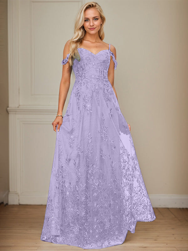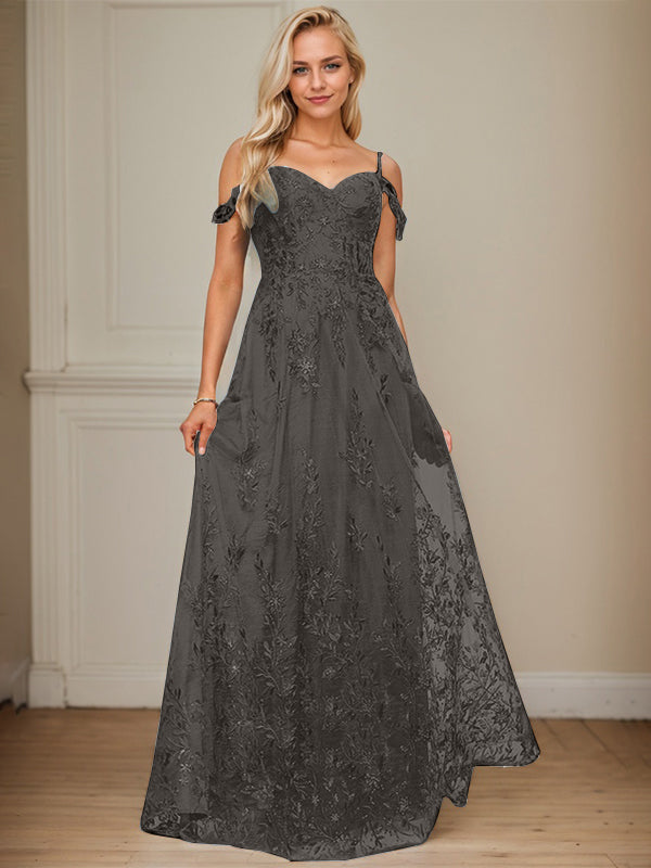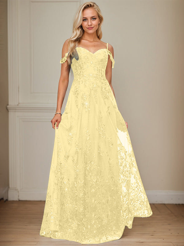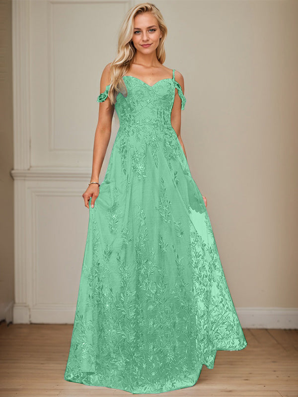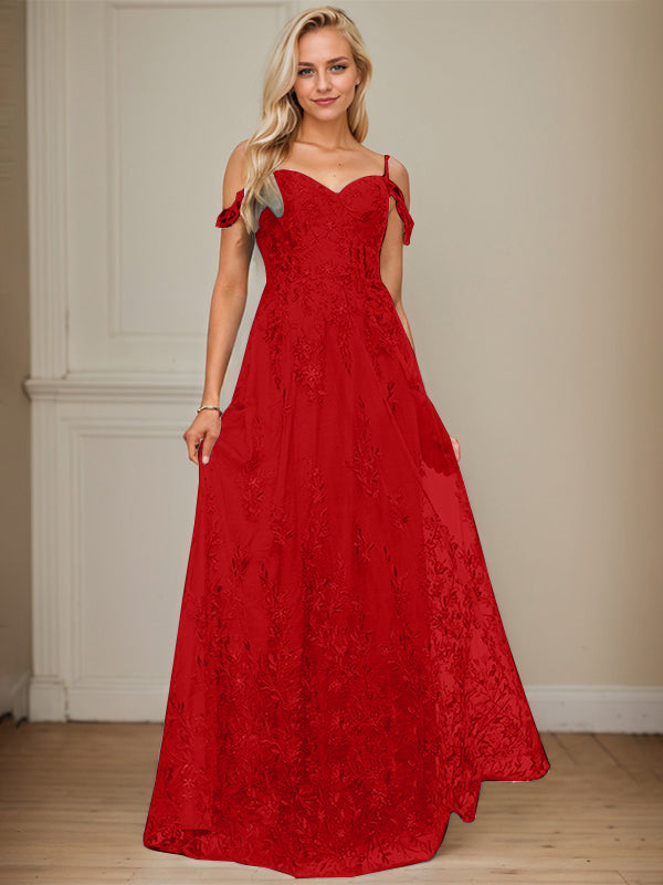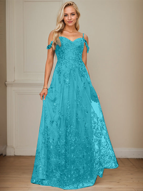 A-line V-Neck Floor-Length Lace Prom Dresses With Sequins