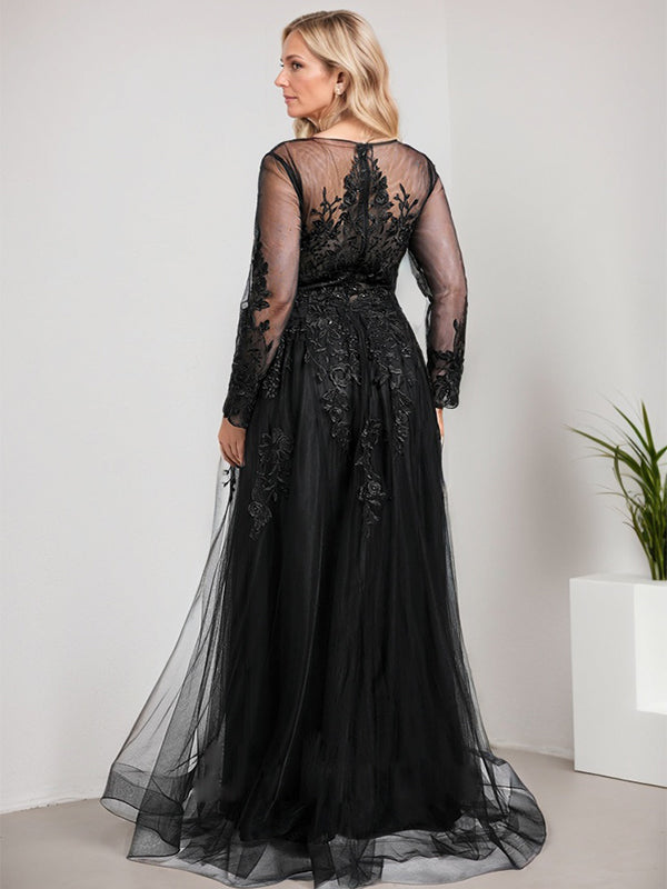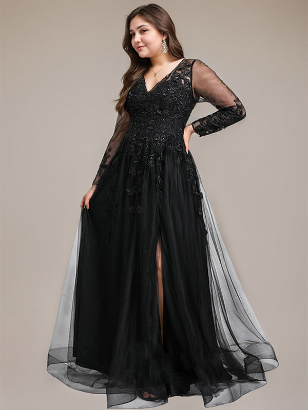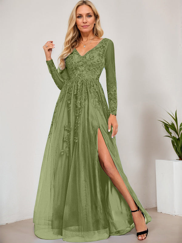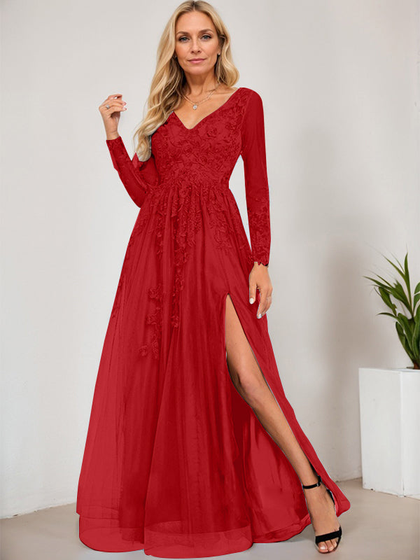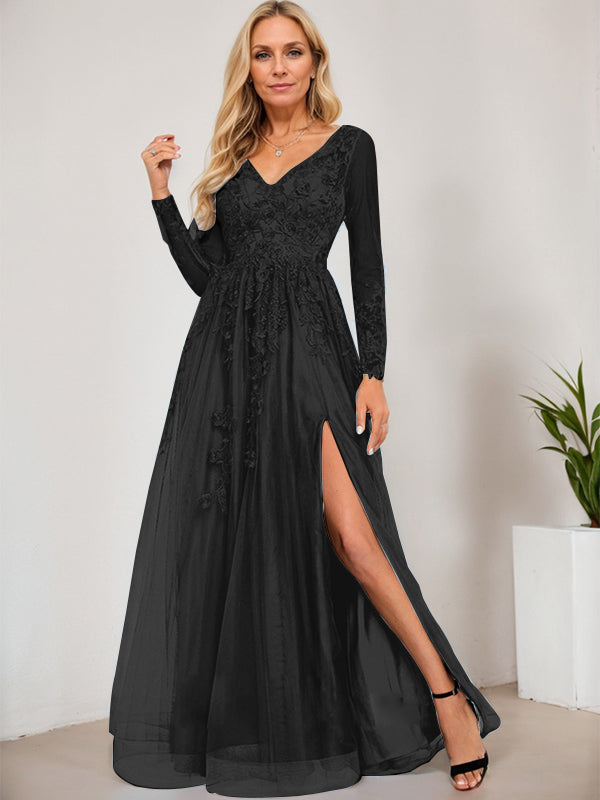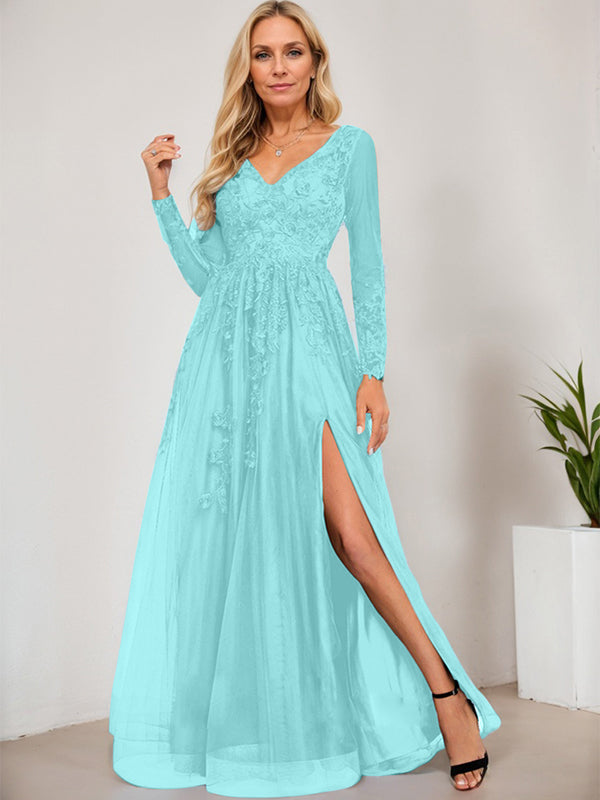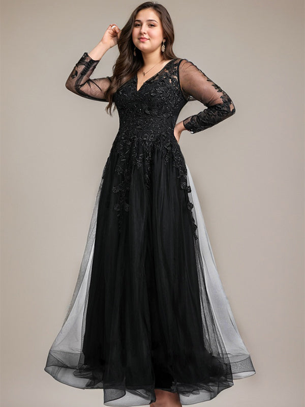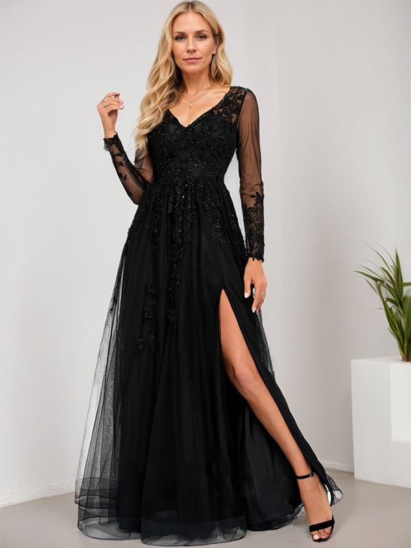 A-line V-Neck Floor-Length Tulle Prom Dresses With Sequins Appliques Lace Beading