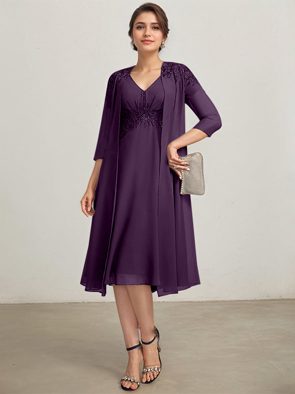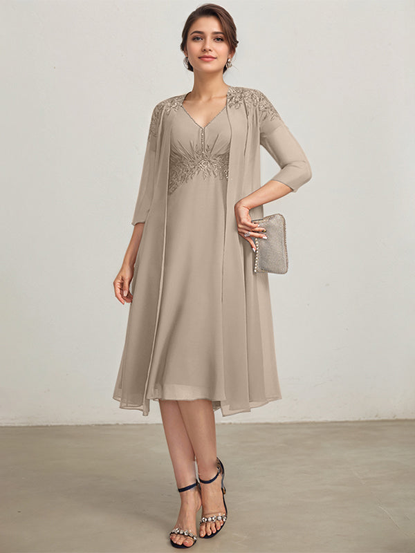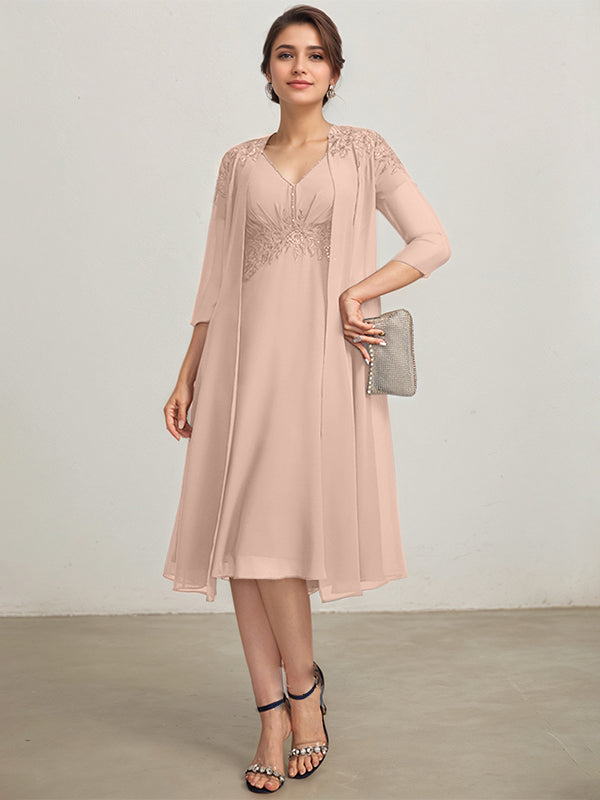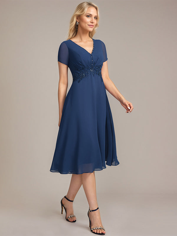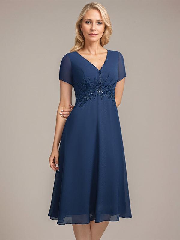 A-line V-Neck Knee-Length Chiffon Lace Mother of the Bride Dress With Pleated Beading Sequins