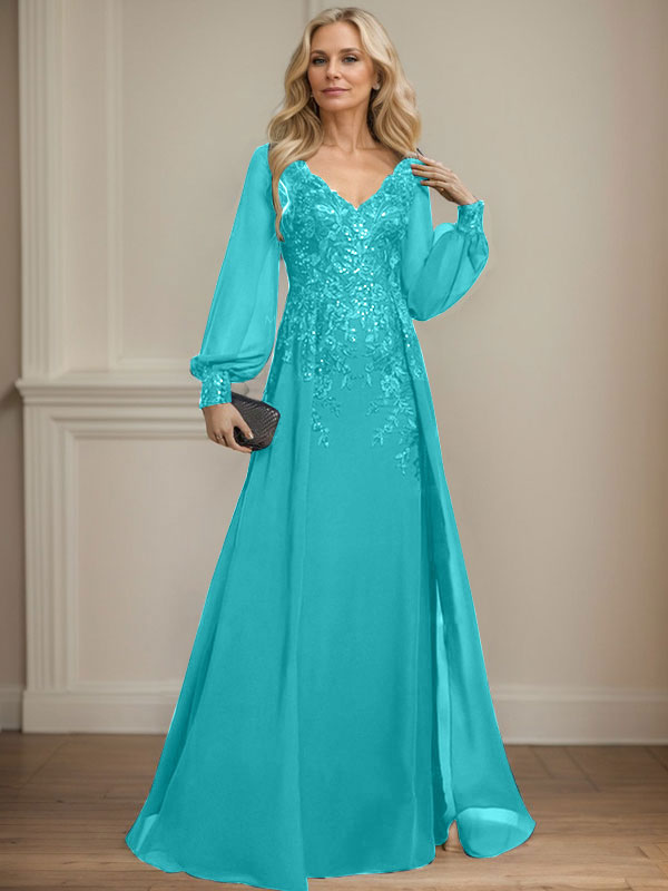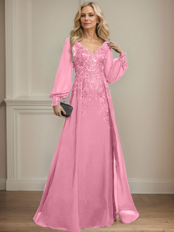 A-Line V-Neck Long Sleeves Floor-Length Chiffon Mother Of The Bride Dresses With Lace