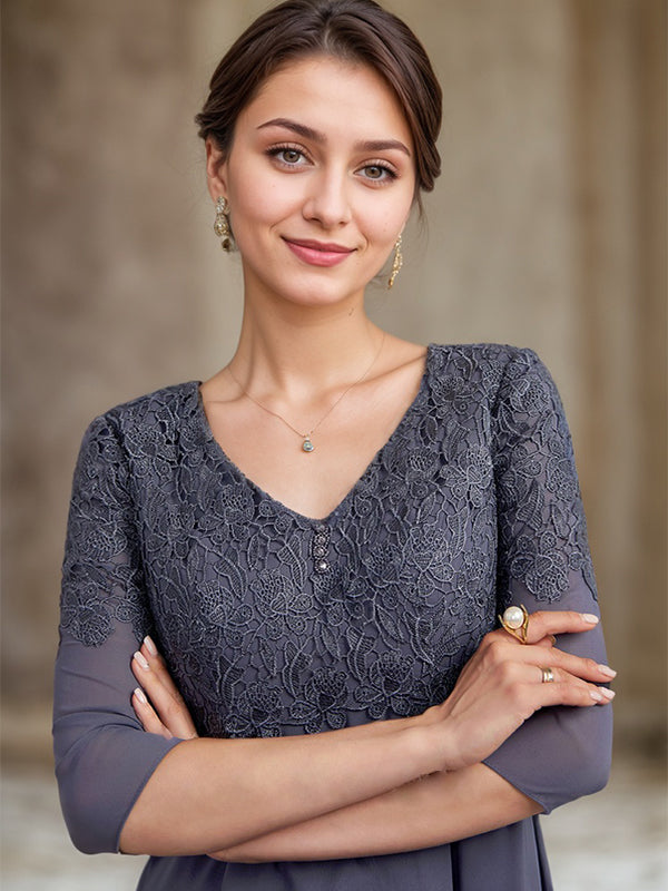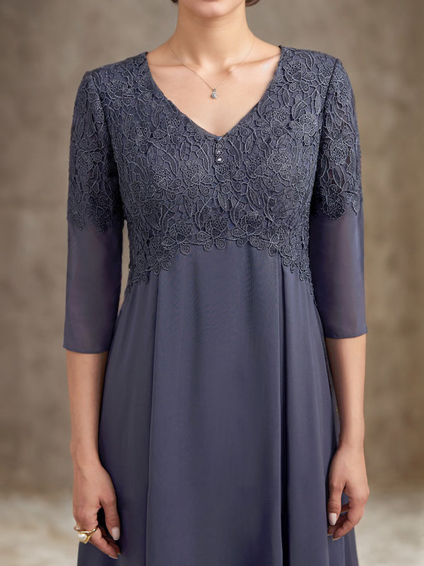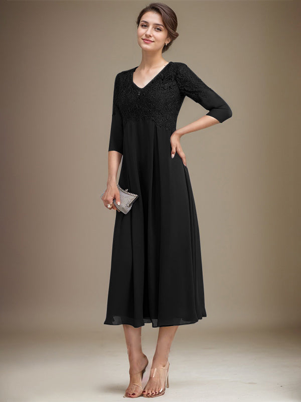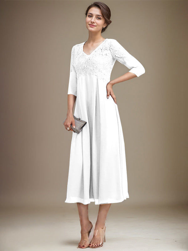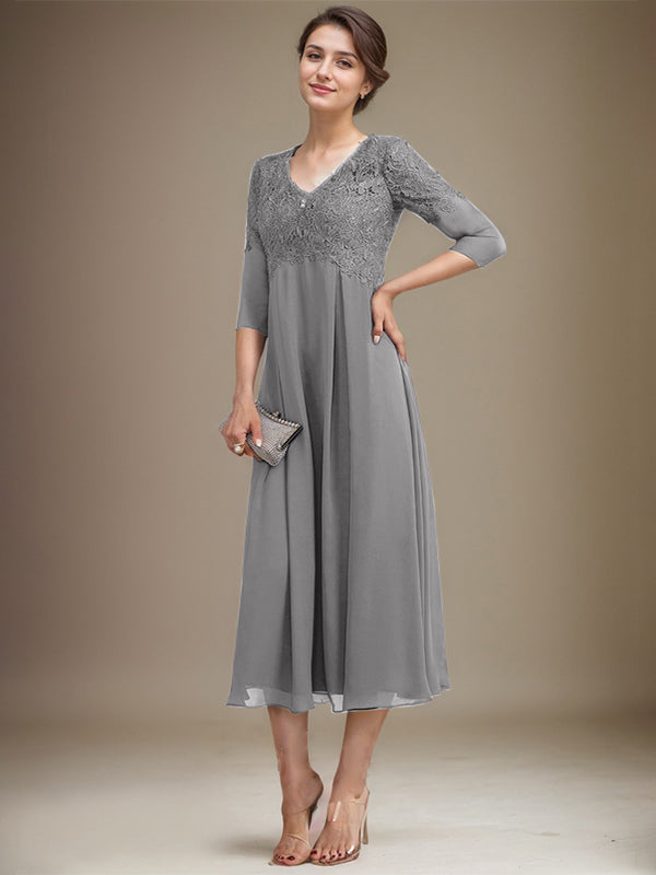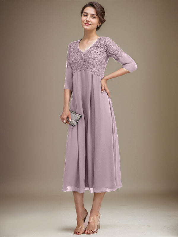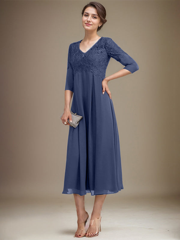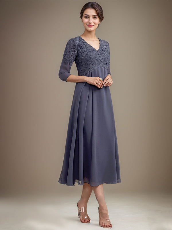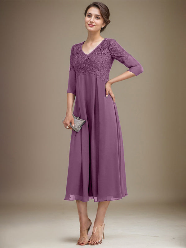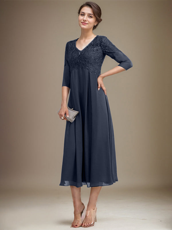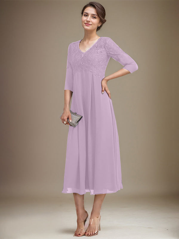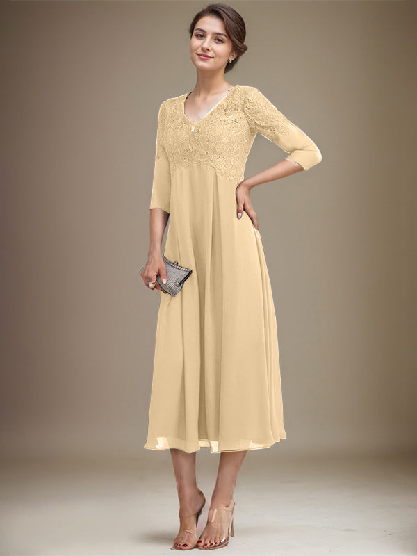 A-line V-Neck Tea-Length Chiffon Lace Mother of the Bride Dress With Beading
