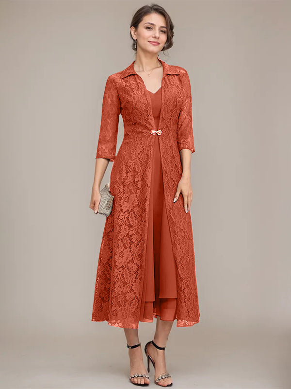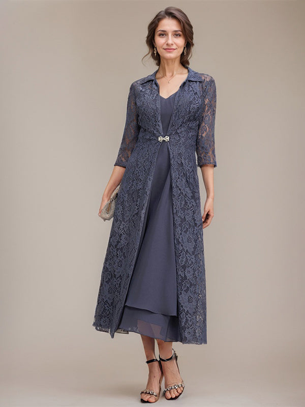 A-line V-Neck Tea-Length Chiffon Mother of the Bride Dress