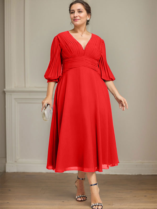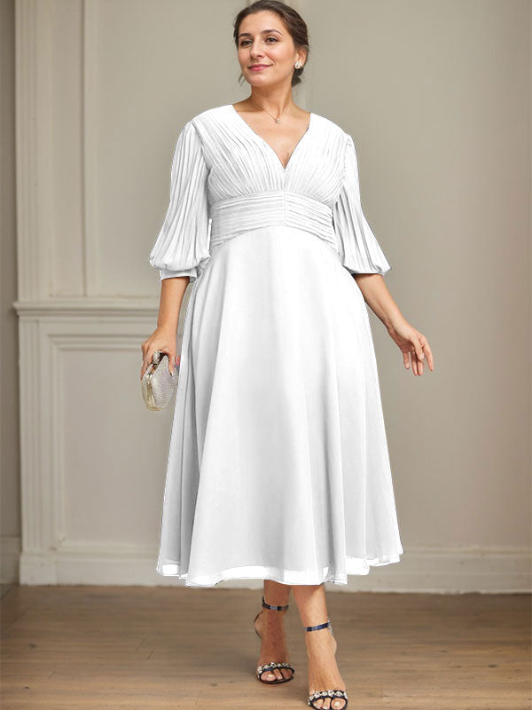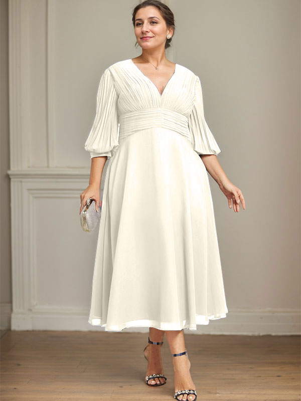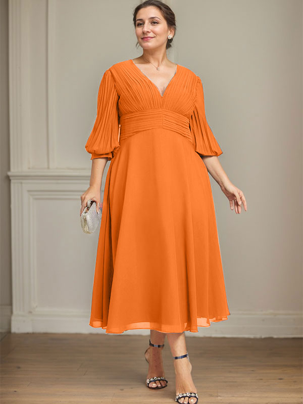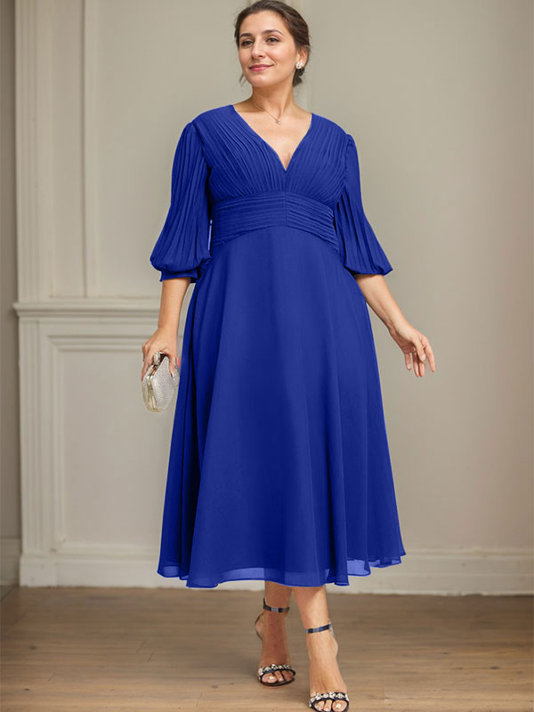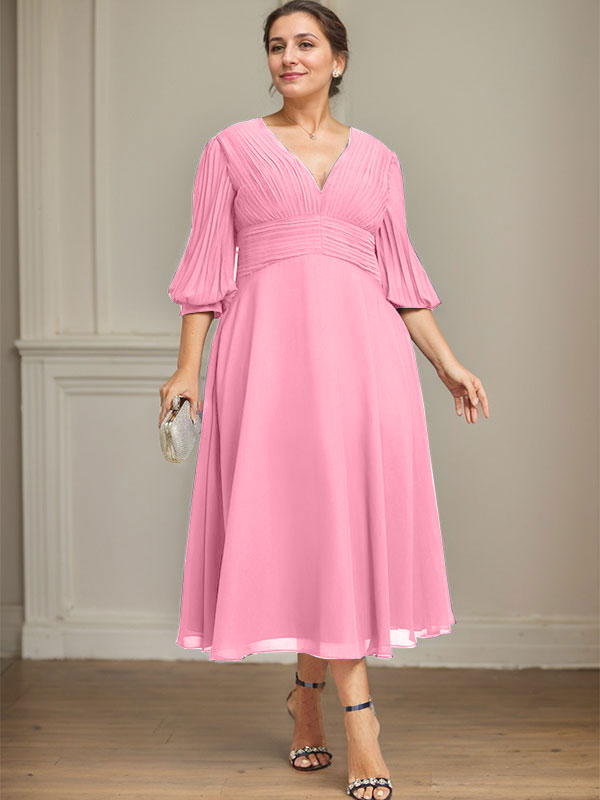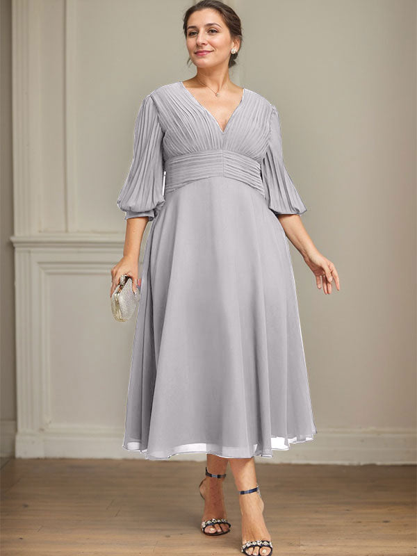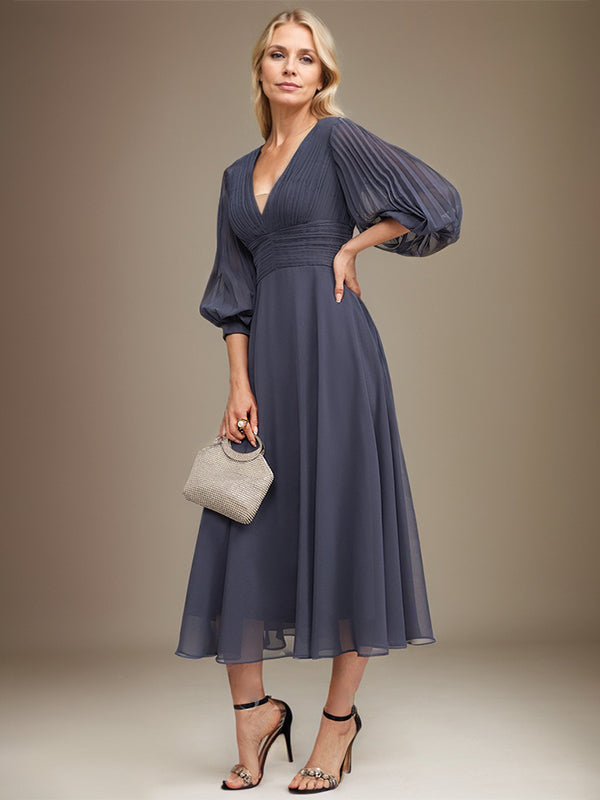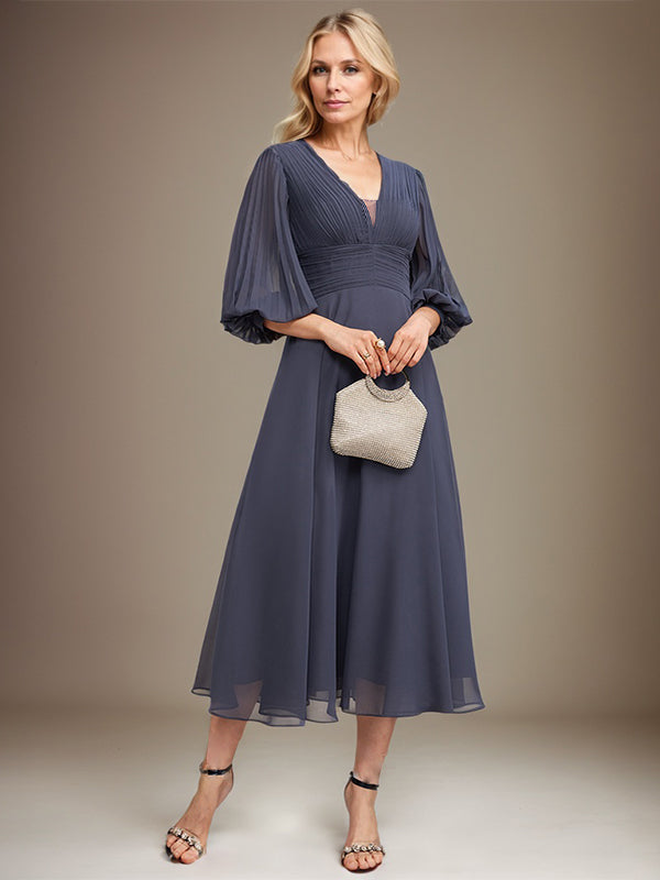 A-line V-Neck Tea-Length Chiffon Mother of the Bride Dress With Pleated