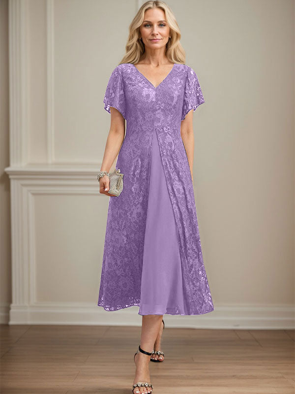 A-line V-Neck Tea-Length Lace Chiffon Mother of the Bride Dress