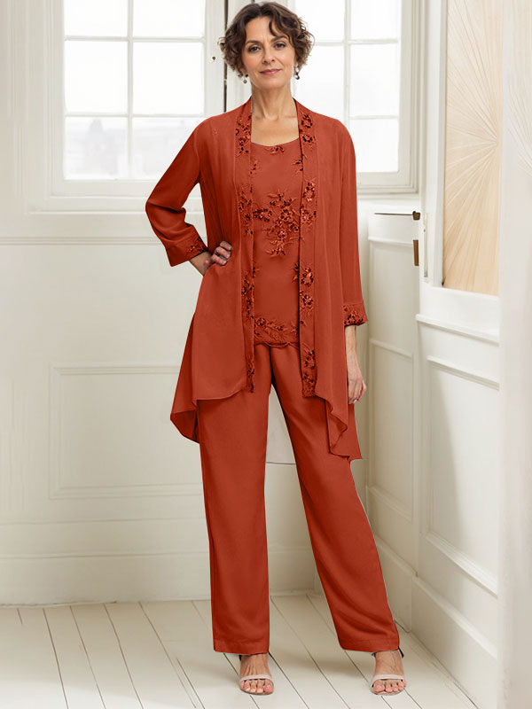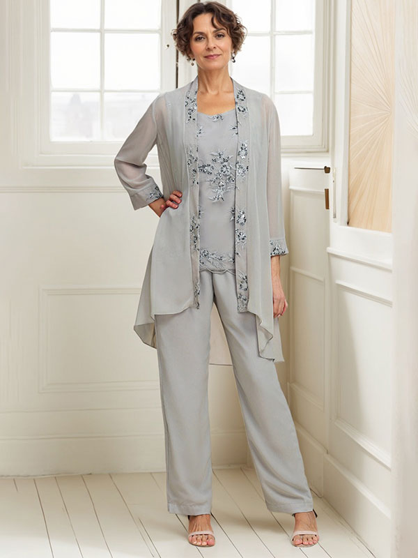 Elegant Appliques 3 Pieces Chiffon Mother of The Bride Jumpsuit with Wrap