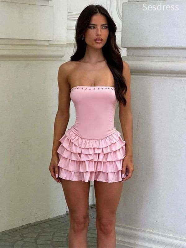 Elegant Pink Beadings Strapless A-line Short Mini Dress Homecoming Dress