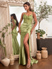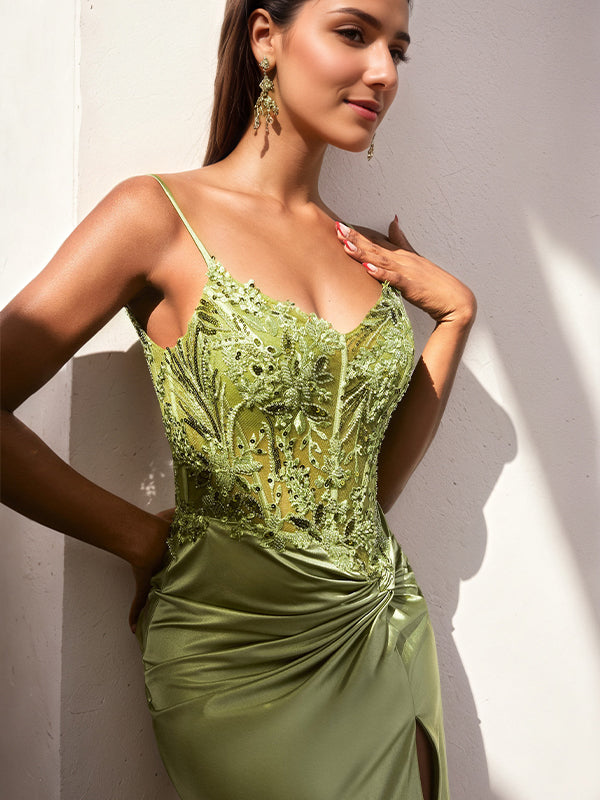 Command attention with our stunning Embellished Satin Gown, designed to make a statement at any special occasion. This fitted silhouette highlights your curves with a gathered waistline and a chic fabric knot detail, while the elegant leg slit adds a touch of allure. The sheer bodice, adorned with intricate beading, offers a luxurious finish, and thin straps provide a graceful, supportive fit. Perfect for proms, galas, or black-tie events, this gown radiates sophistication and timeless style.