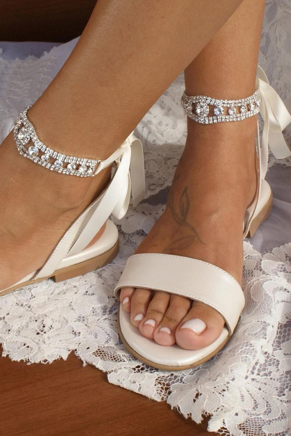 Ivory Rhinestones Open Toe Lace Up Flat Bridal Shoes