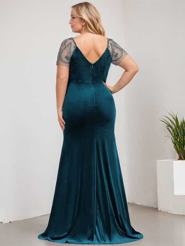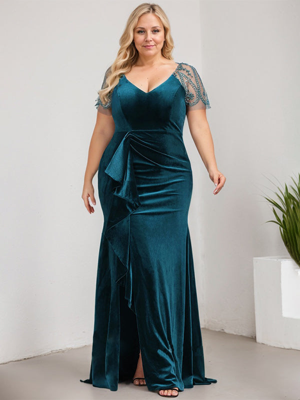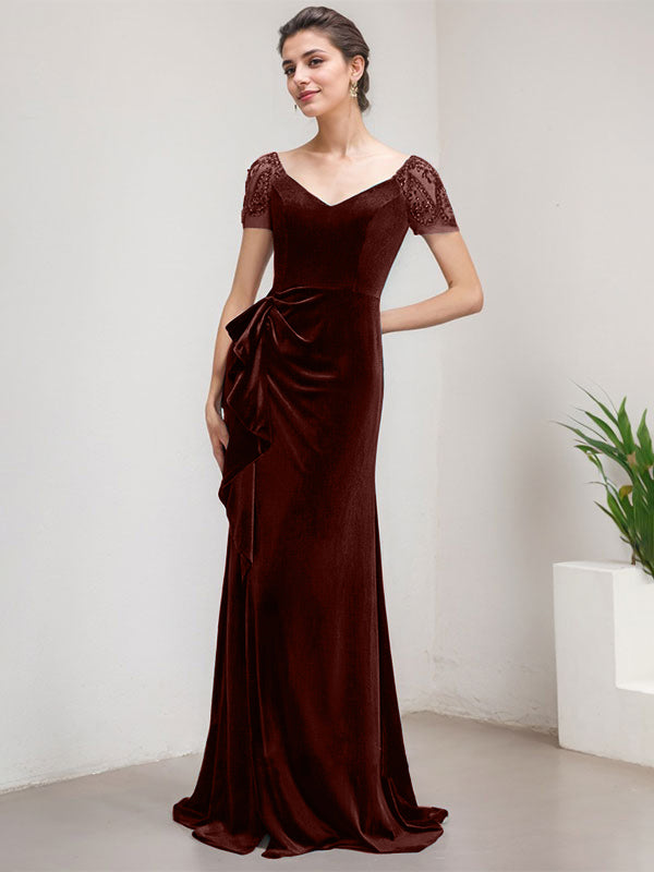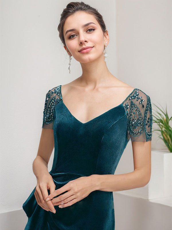Sheath/Column V-Neck Sweep Train Velvet Evening Dress With Cascading Ruffles Beading