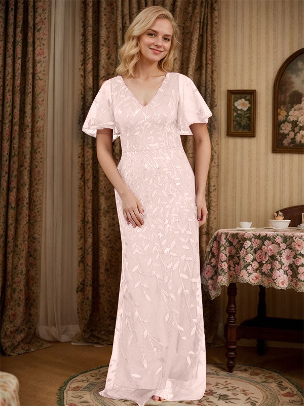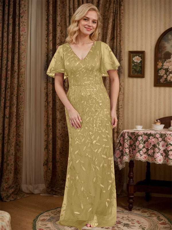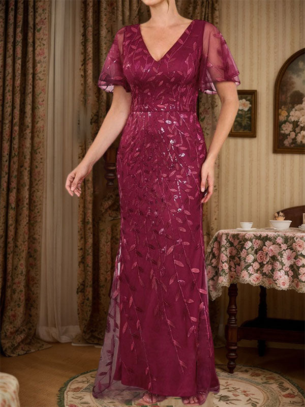 Sheath V-neck Short Sleeves Floor-Length Lace Mother of the Bride Dress